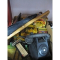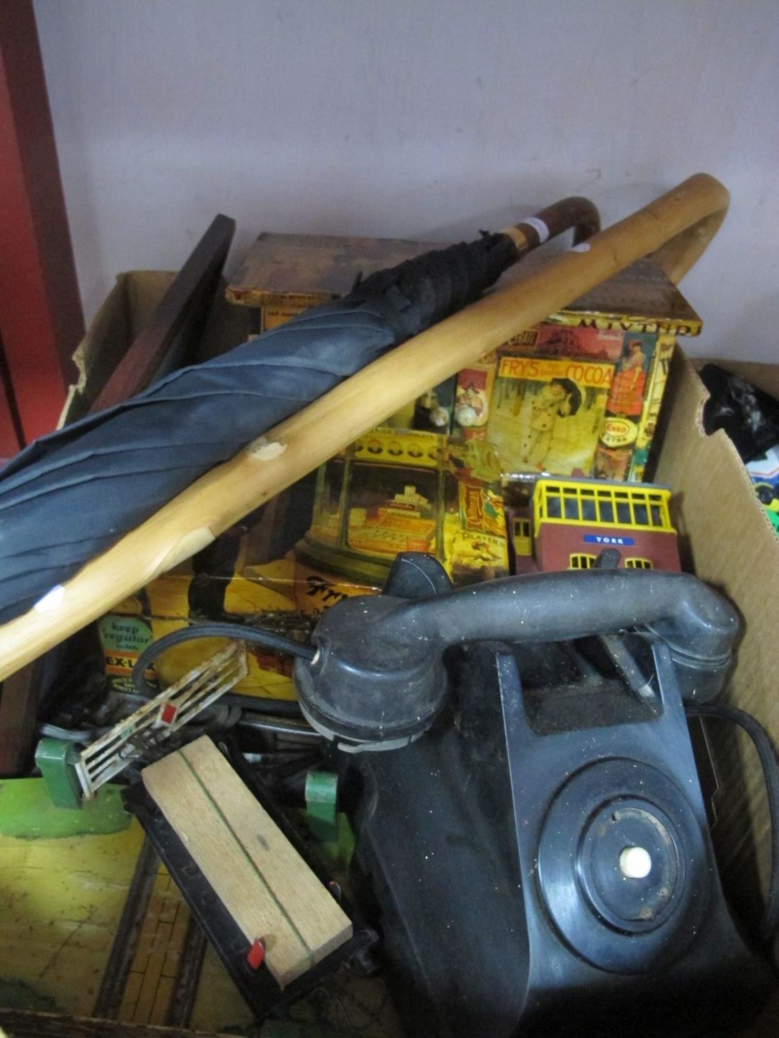 Bakelite Anvil Telephone, two decoupage advertising boxes, 'O' gauge railway items, umbrella, etc:- One Box.