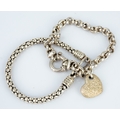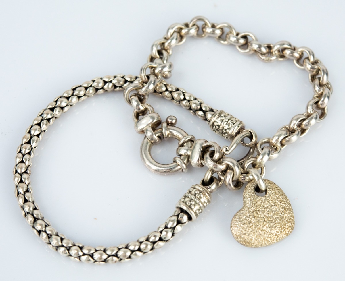 LARGE STERLING SILVER BELCHER LINK BRACELET with textured heart charm, another silver popcorn link bracelet with tube terminals and hook and loop clasp, 1.36oz (2)
