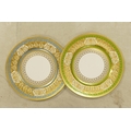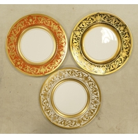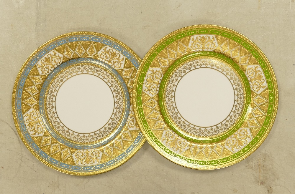 De Lamerie Fine Bone China, heavily decorated gilt plates in blue & green colouring. (2)