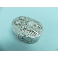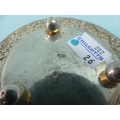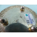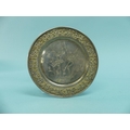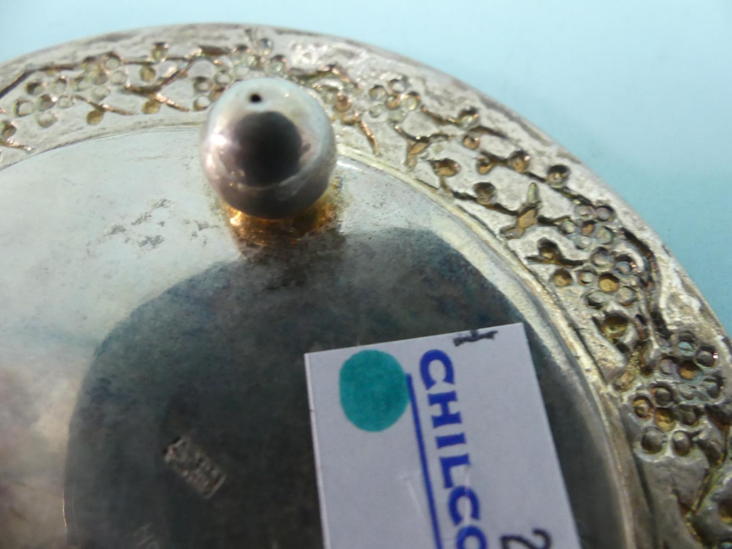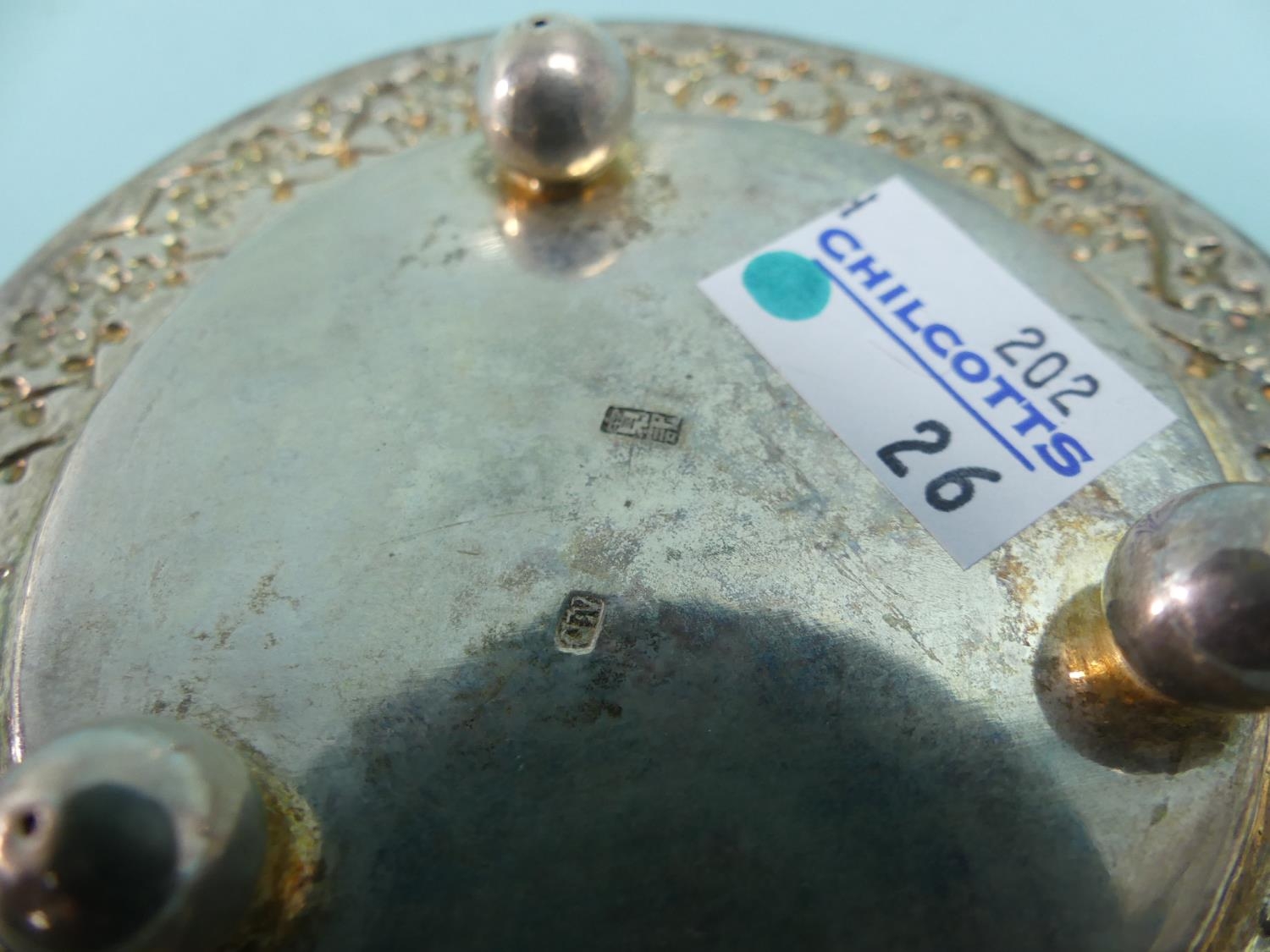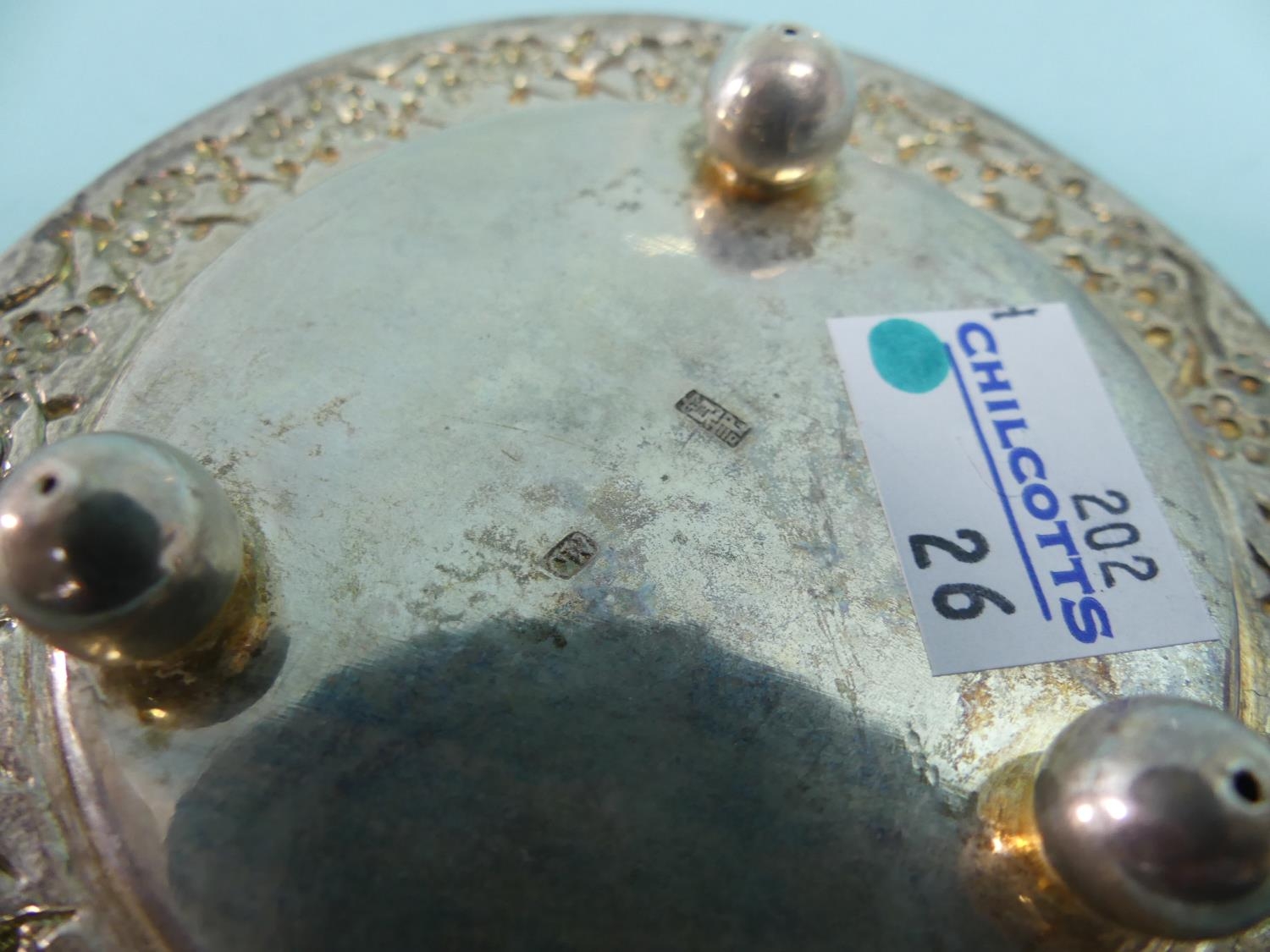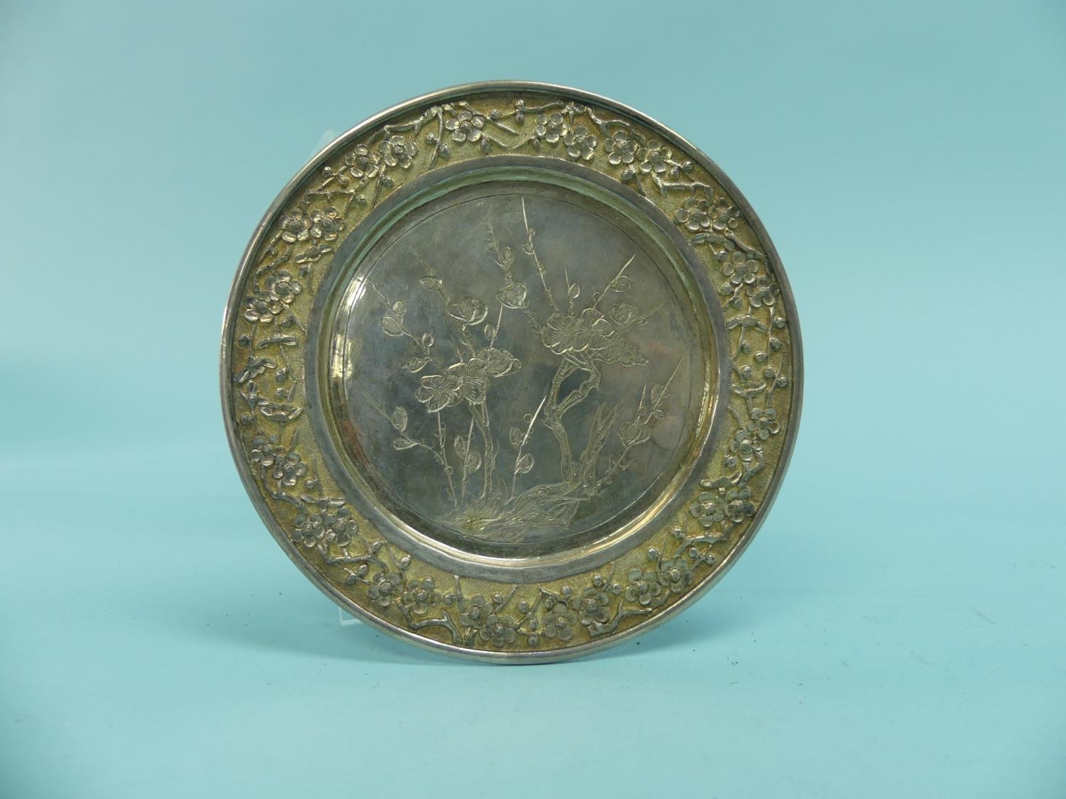 A late 19thC Chinese export silver gilt circular Dish, by Cumwo, Hong Kong, the centre engraved with foliate decoration, the gilt textured rim embossed with scrolling flowers, all raised on three ball feet, 3¾in (9.5cm) diameter, approx weight 1.3ozt.