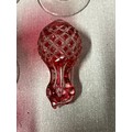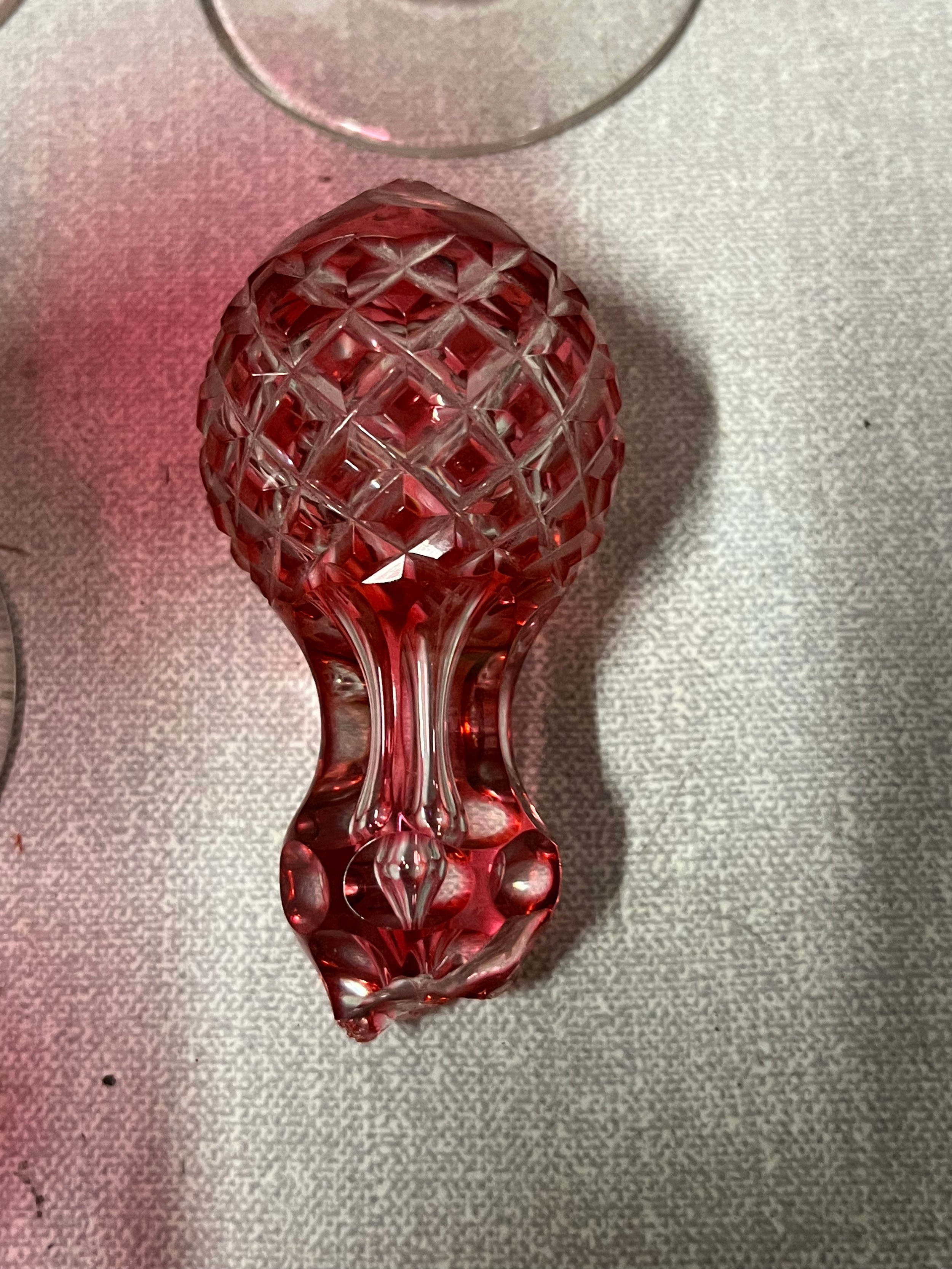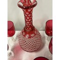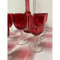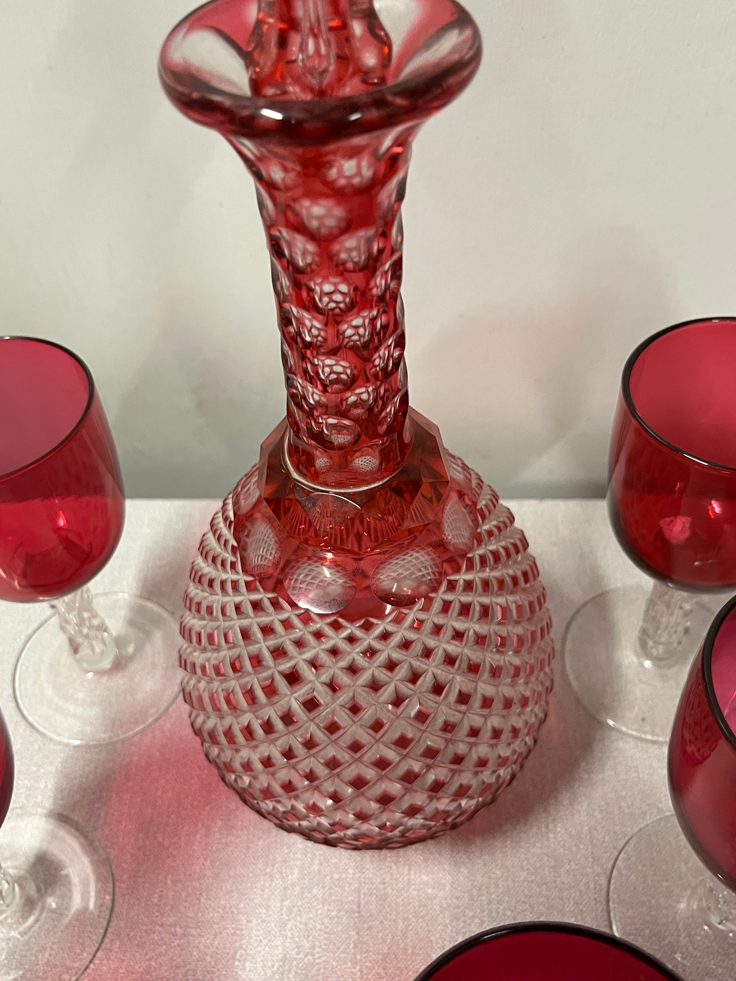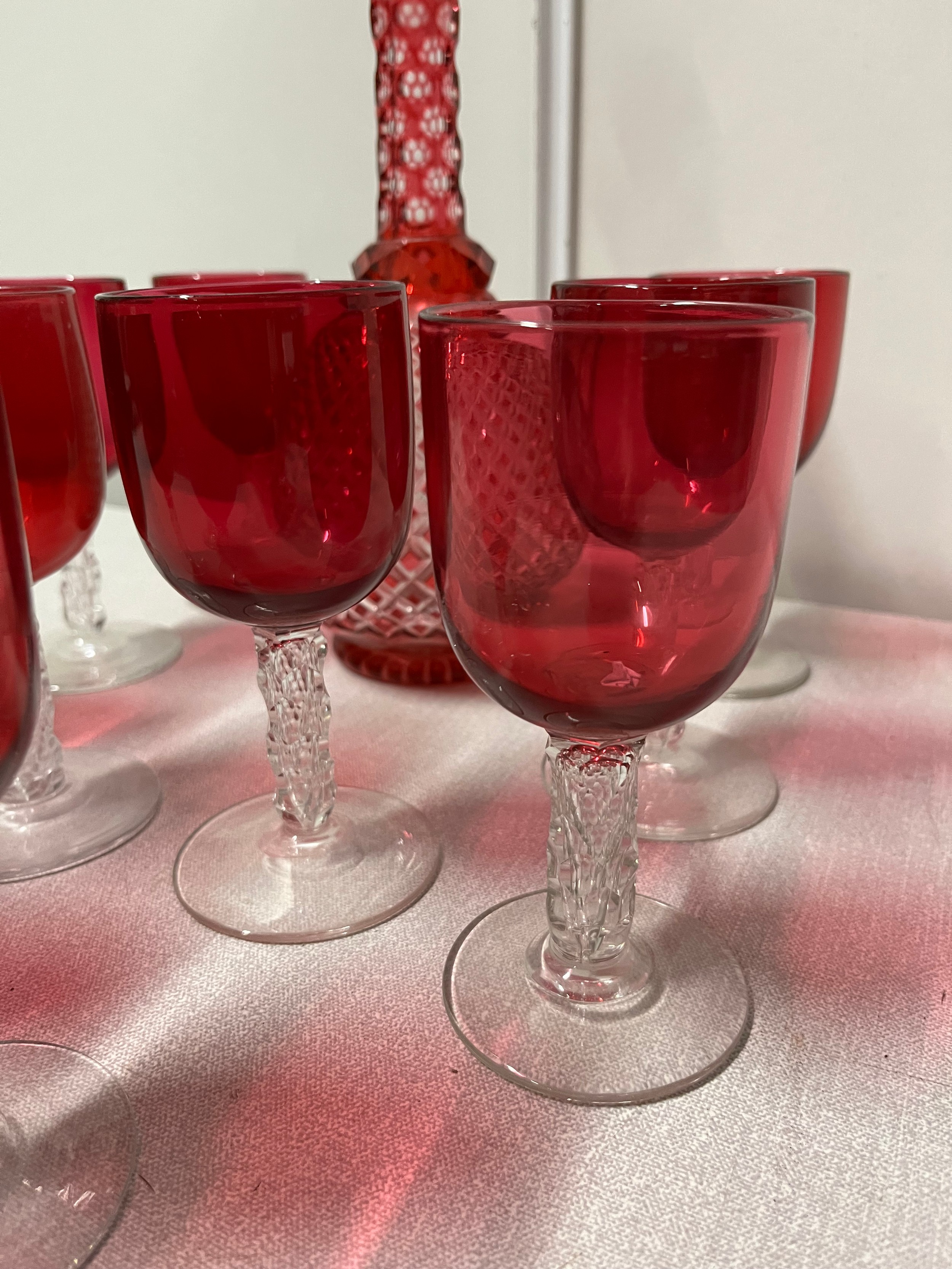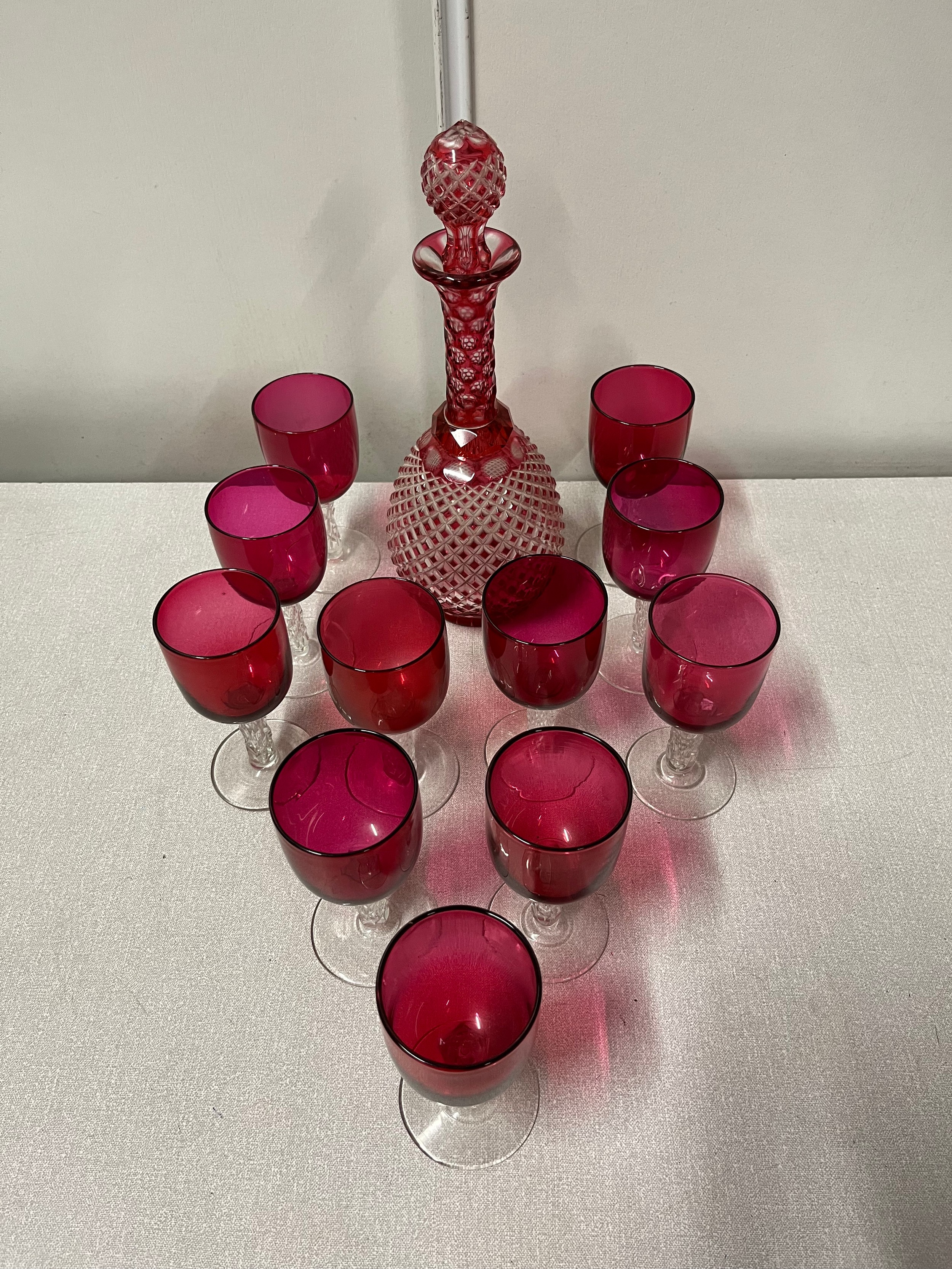 A Collection of 11 Antique cranberry glass and facet cut stem wine glasses, together with cranberry facet cut decanter. [Stopper as found]