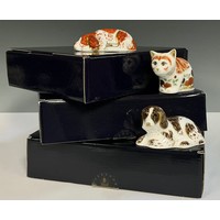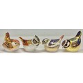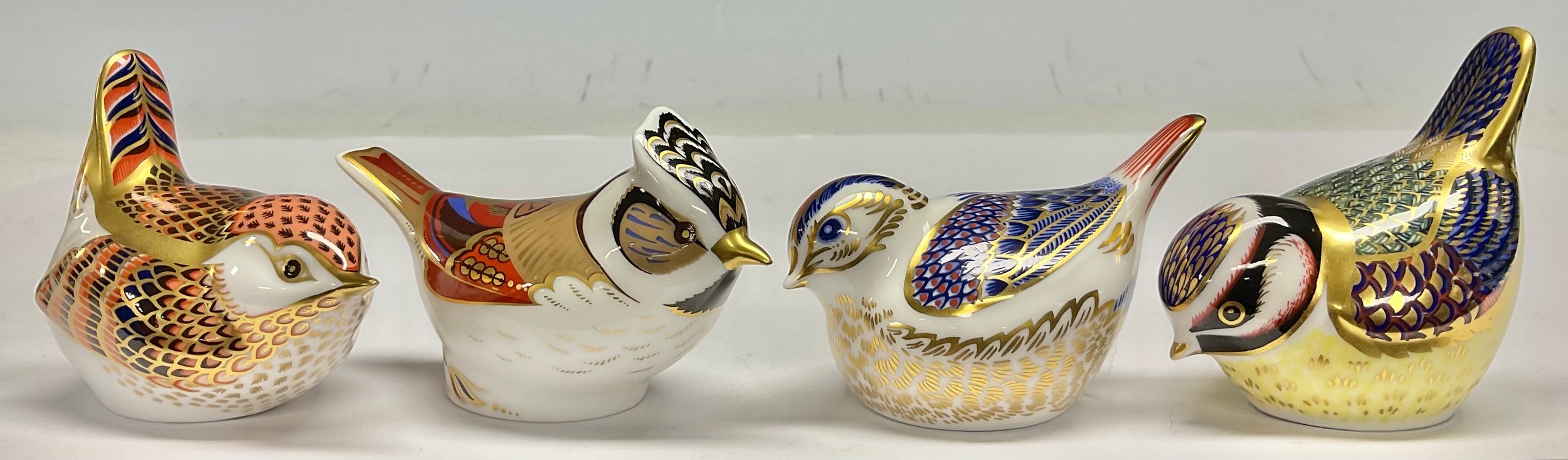A Royal Crown Derby paperweight, Gold Crest, gold stopper, 5.5cm high, printed mark in red; others, Crested Tit, Collectors Guild exclusive, gold stopper, 5.5cm, printed mark in red; Blue Tit, gold stopper, 7cm, printed mark (4)