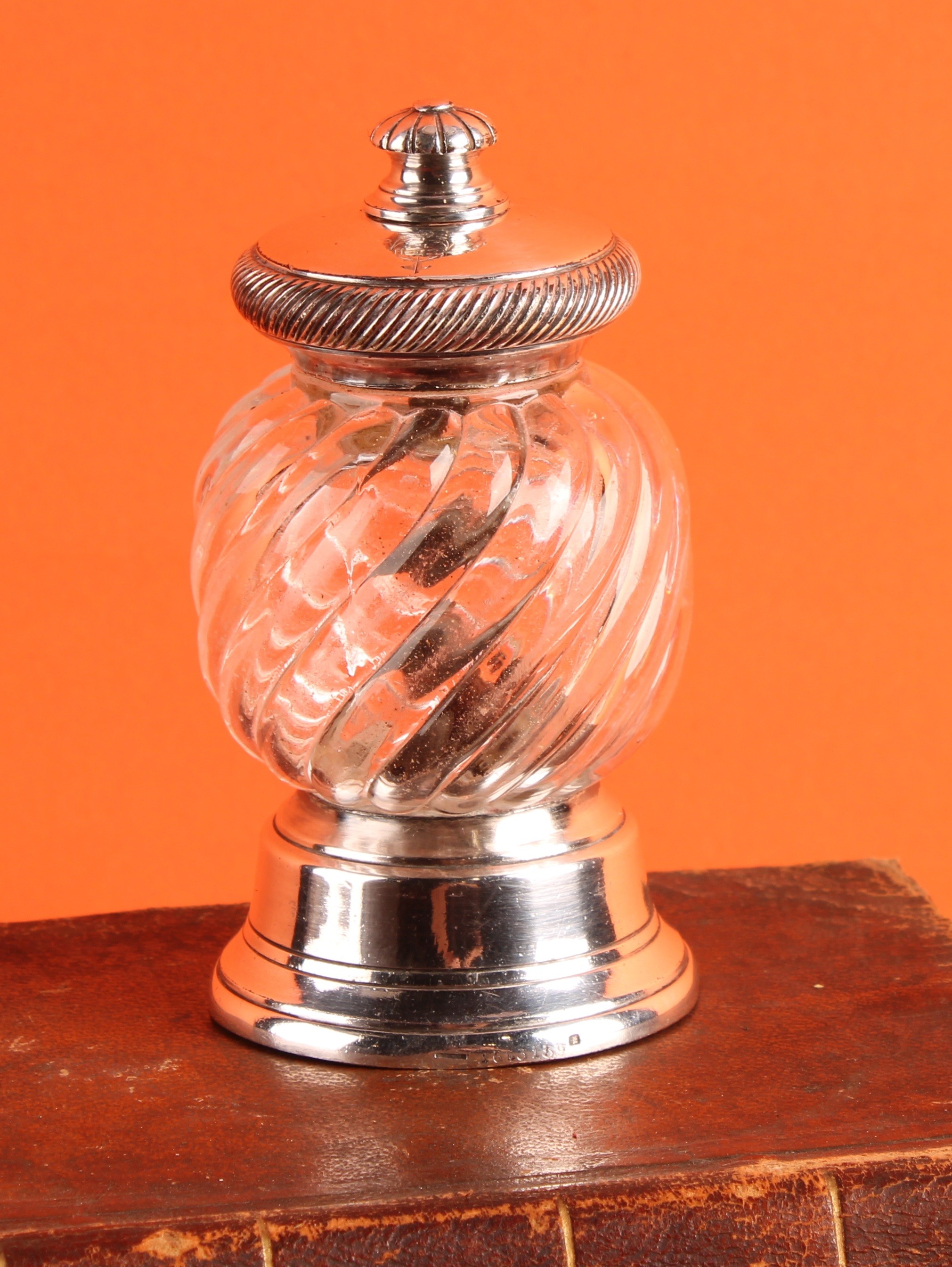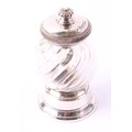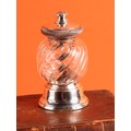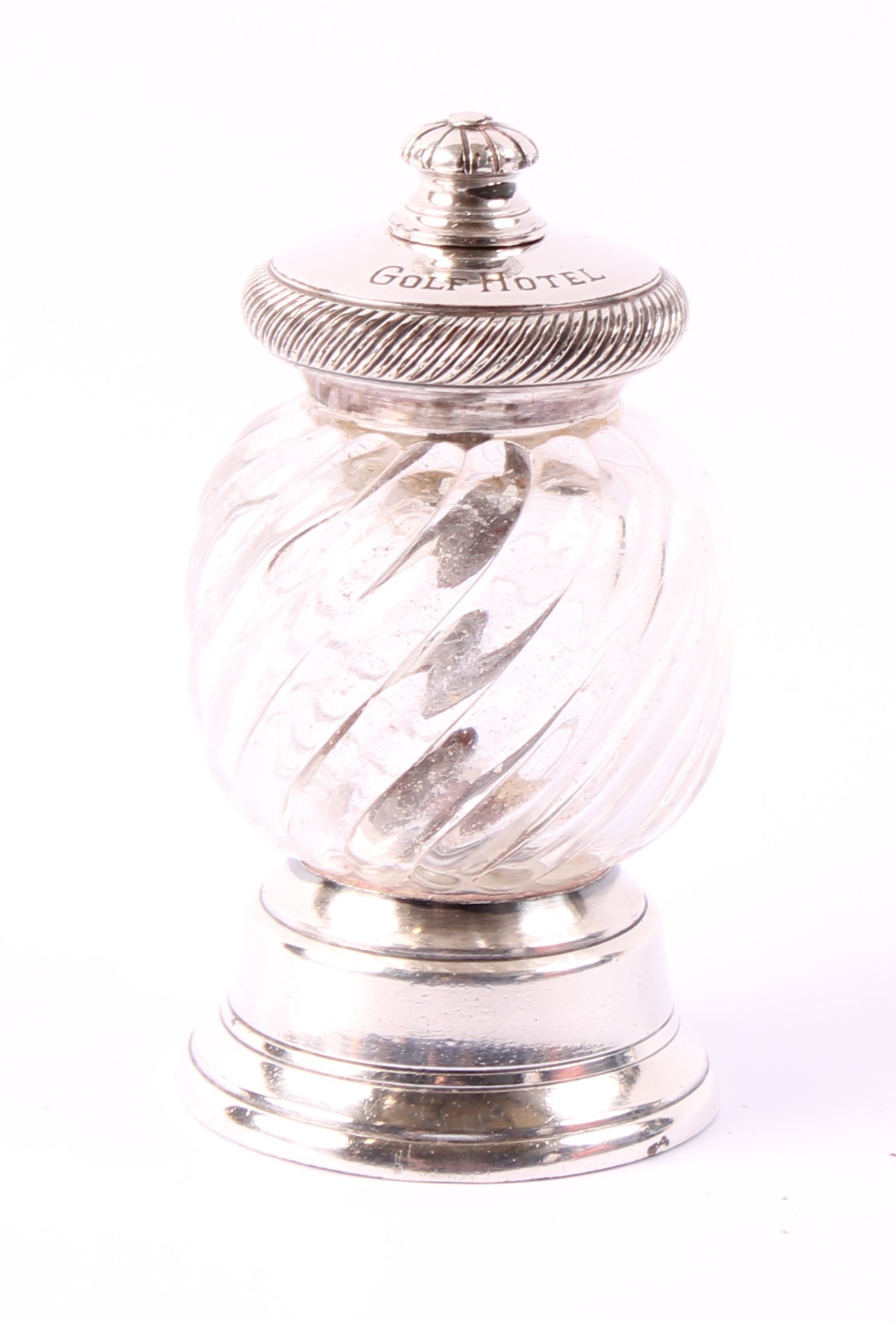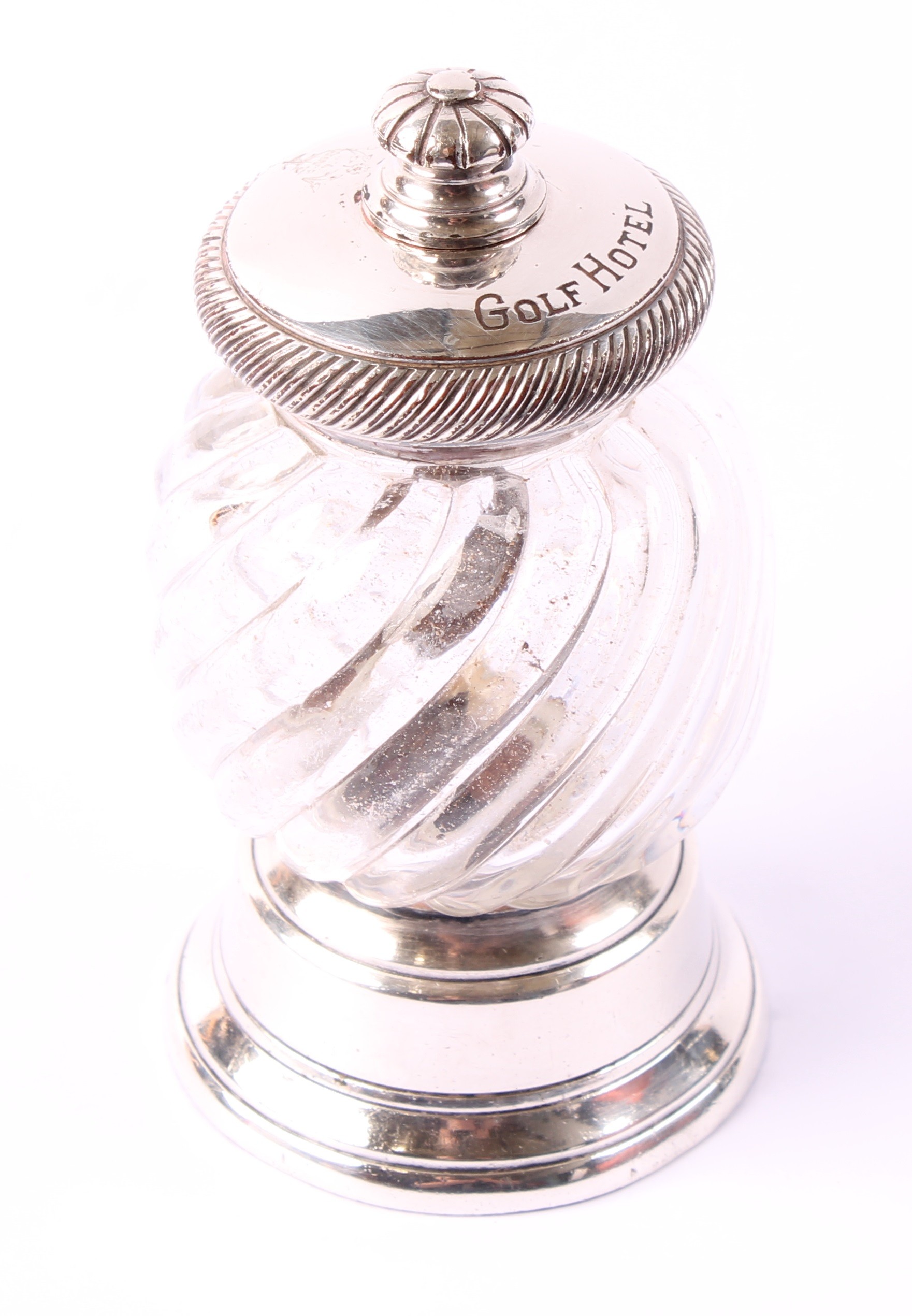 An early 20th century Peugeot Freres pepper mill or grinder, Christofle plated mounts, wrythen-fluted ovoid clear glass body, the cover inscribed 'Golf Hotel', 9.5cm high