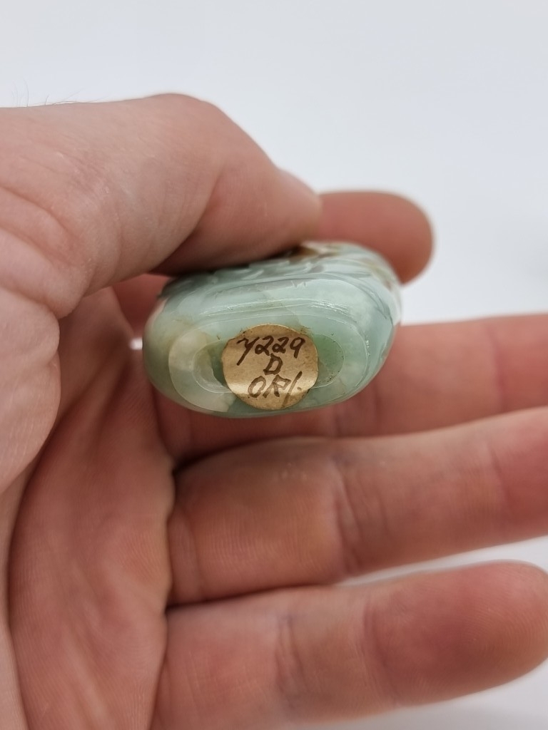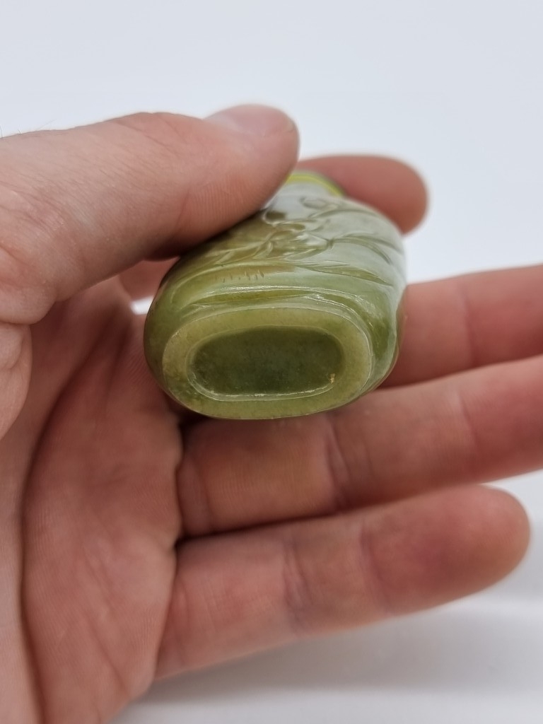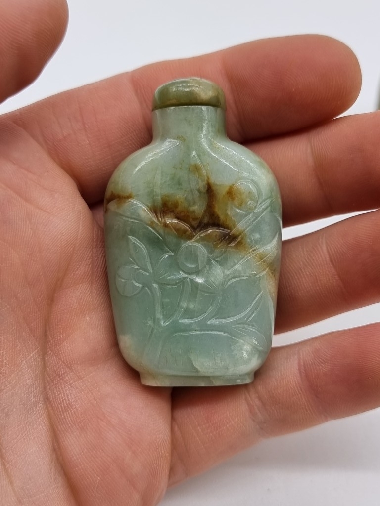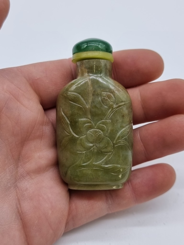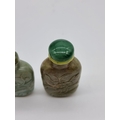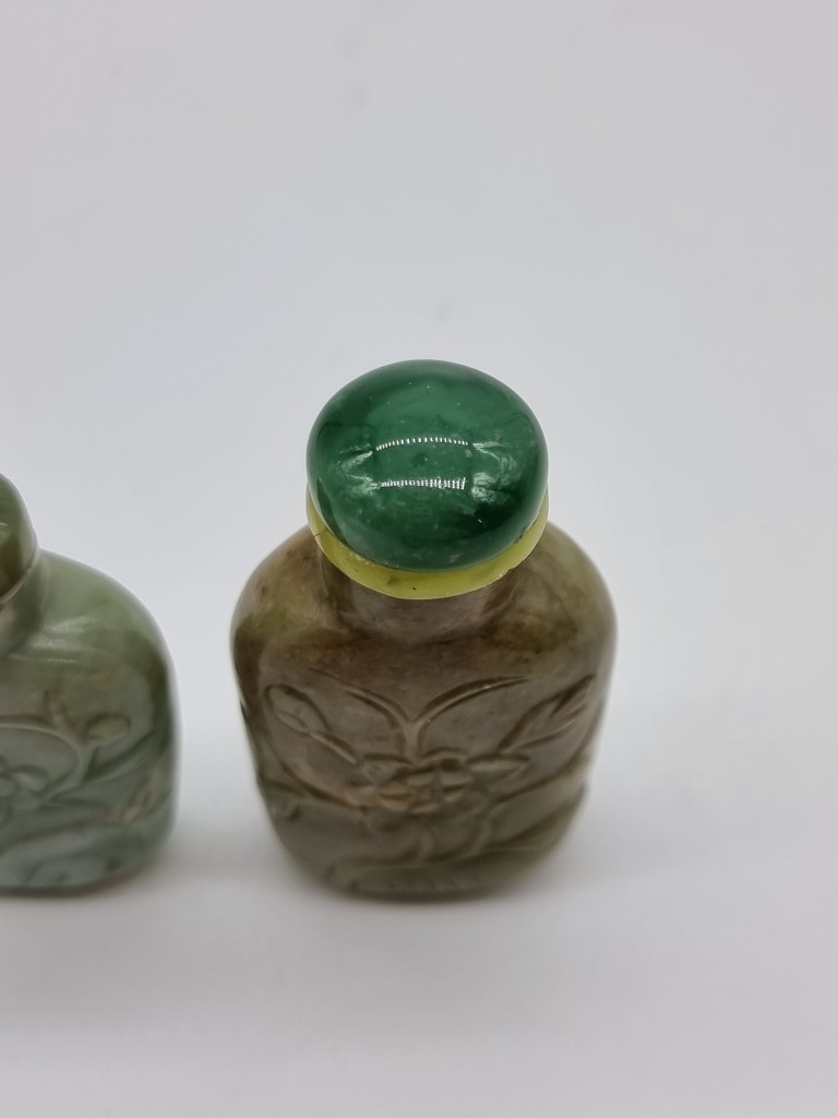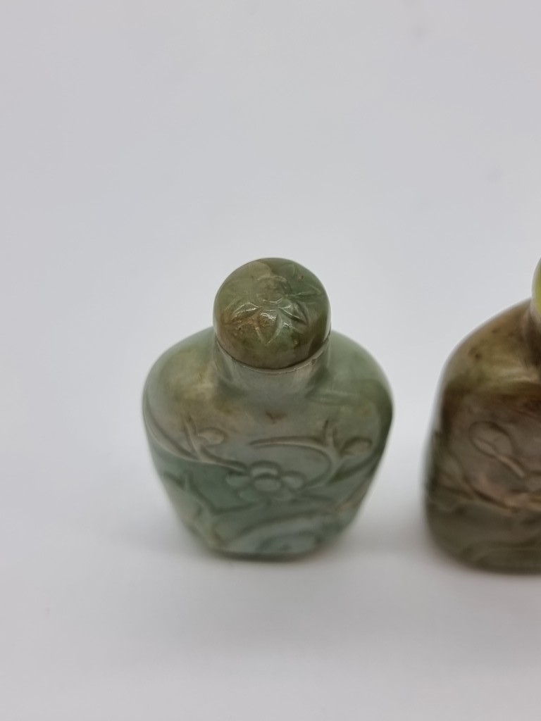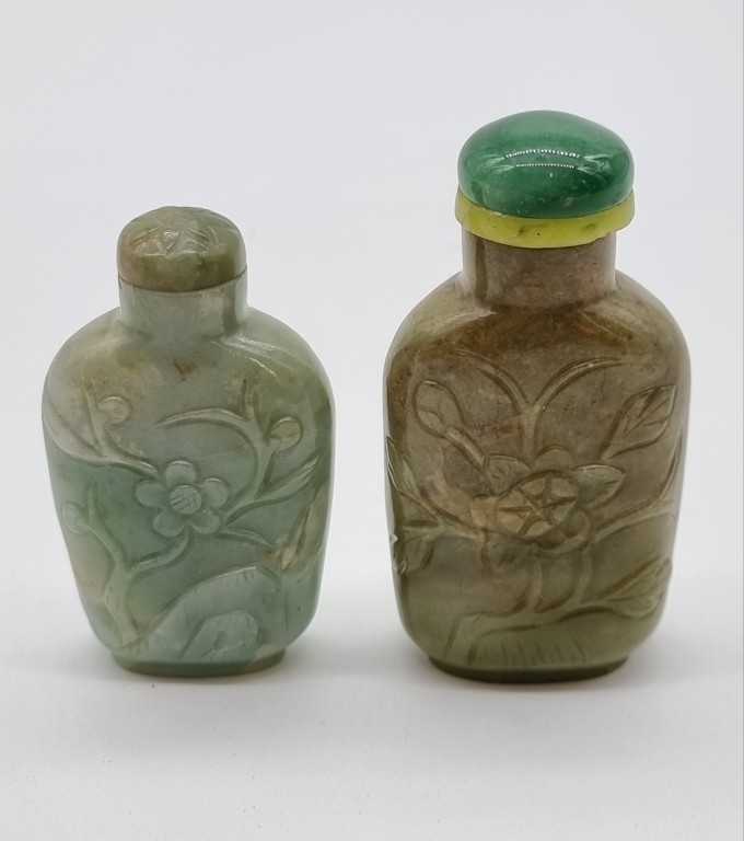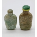 Two Chinese carved jade snuff bottles and stoppers, Qing, total height of largest 7cm. (2)