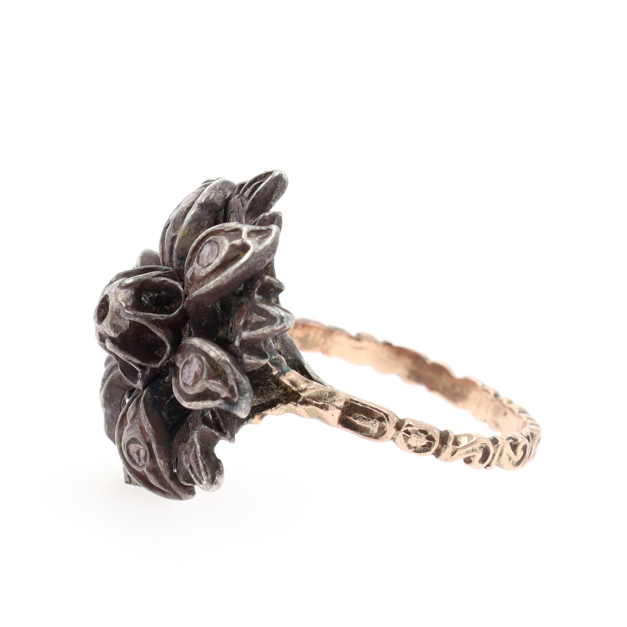 Antique Diamond Gold And Silver Ring inc. Gold Shank, Silver Floral Setting. This ring has been tested as gold and silver. Two stones missing, needs reshaping. UK ring size P 1/2. Weighs in total 8g.