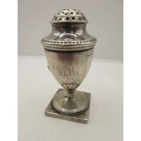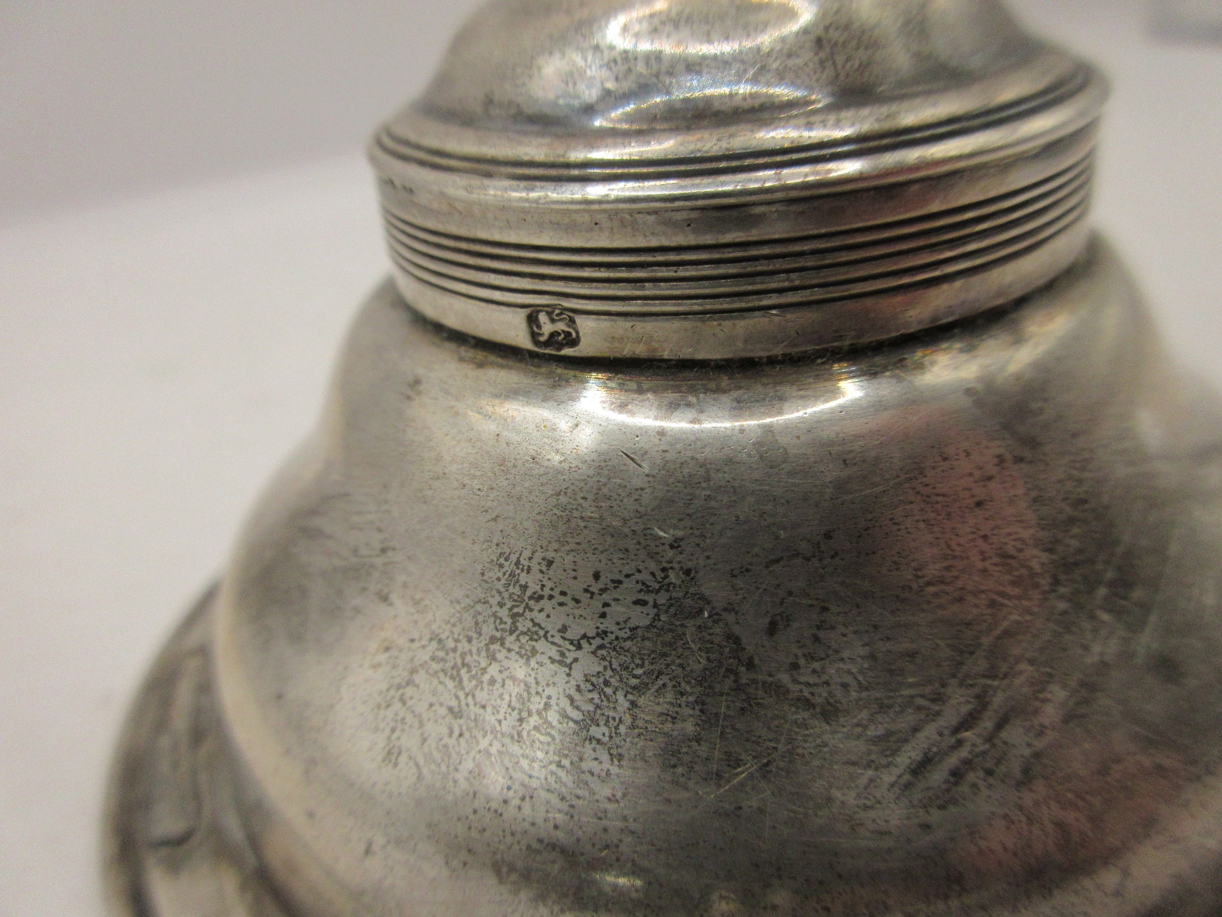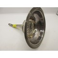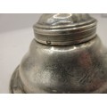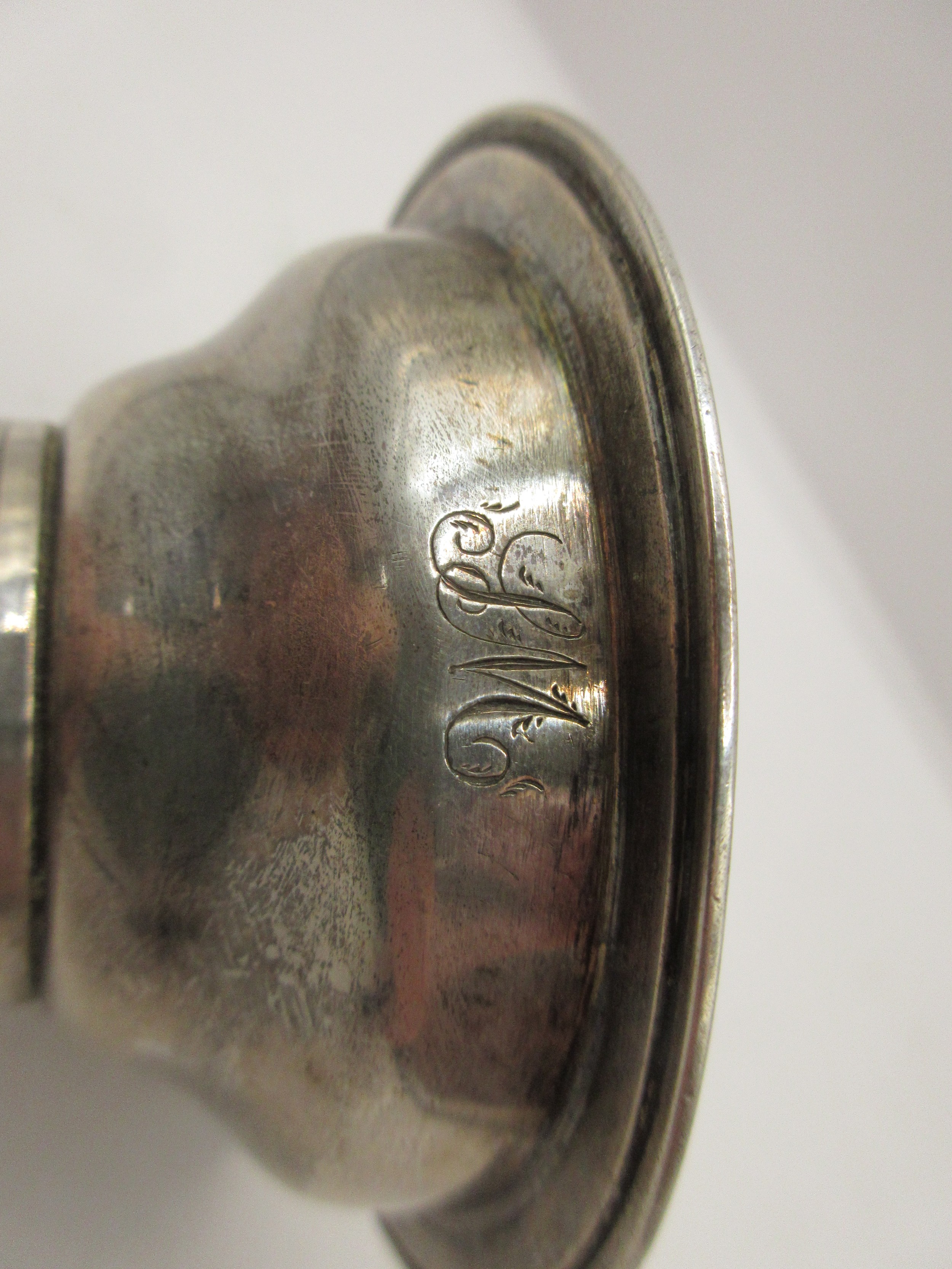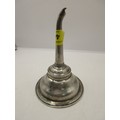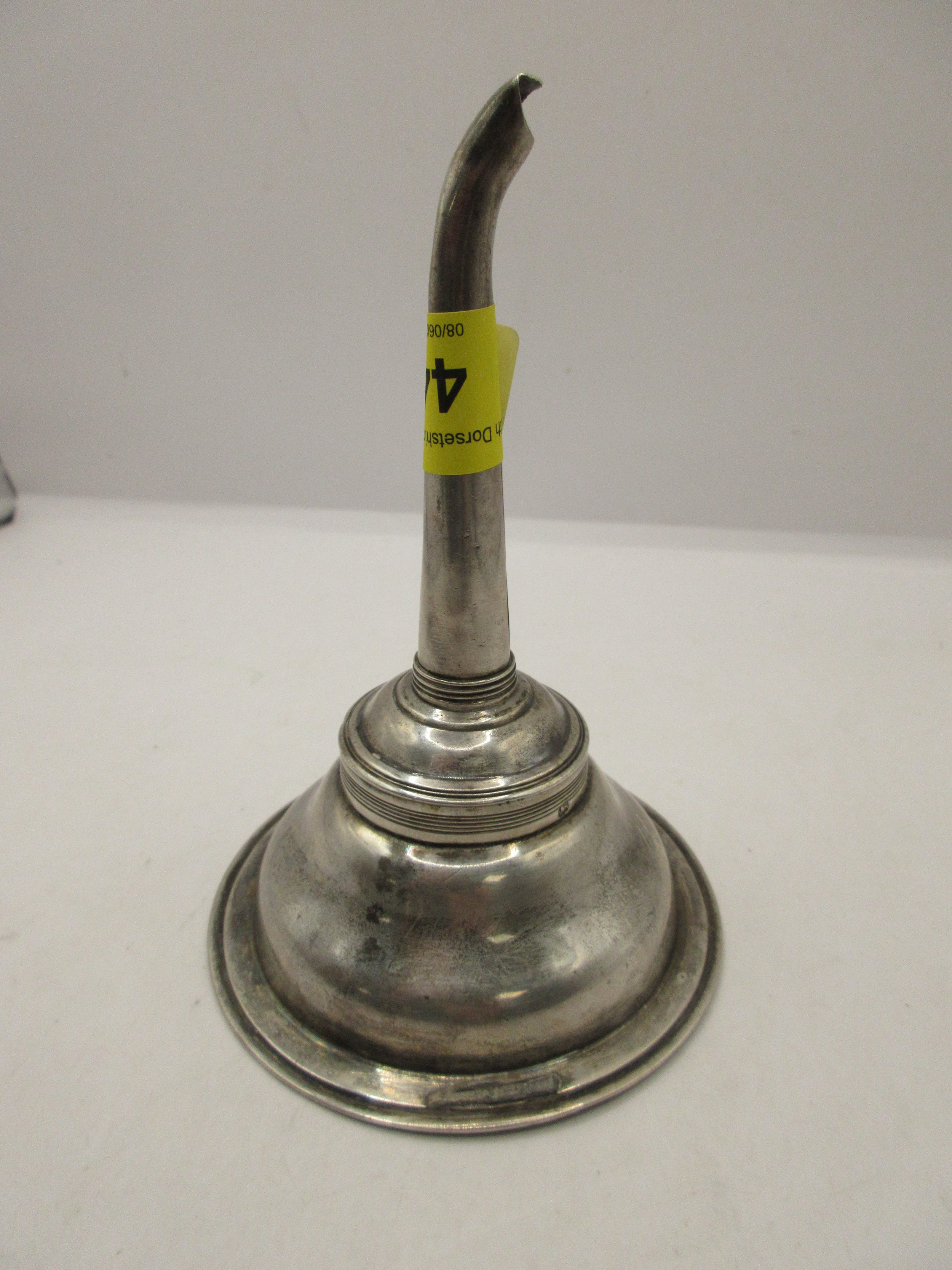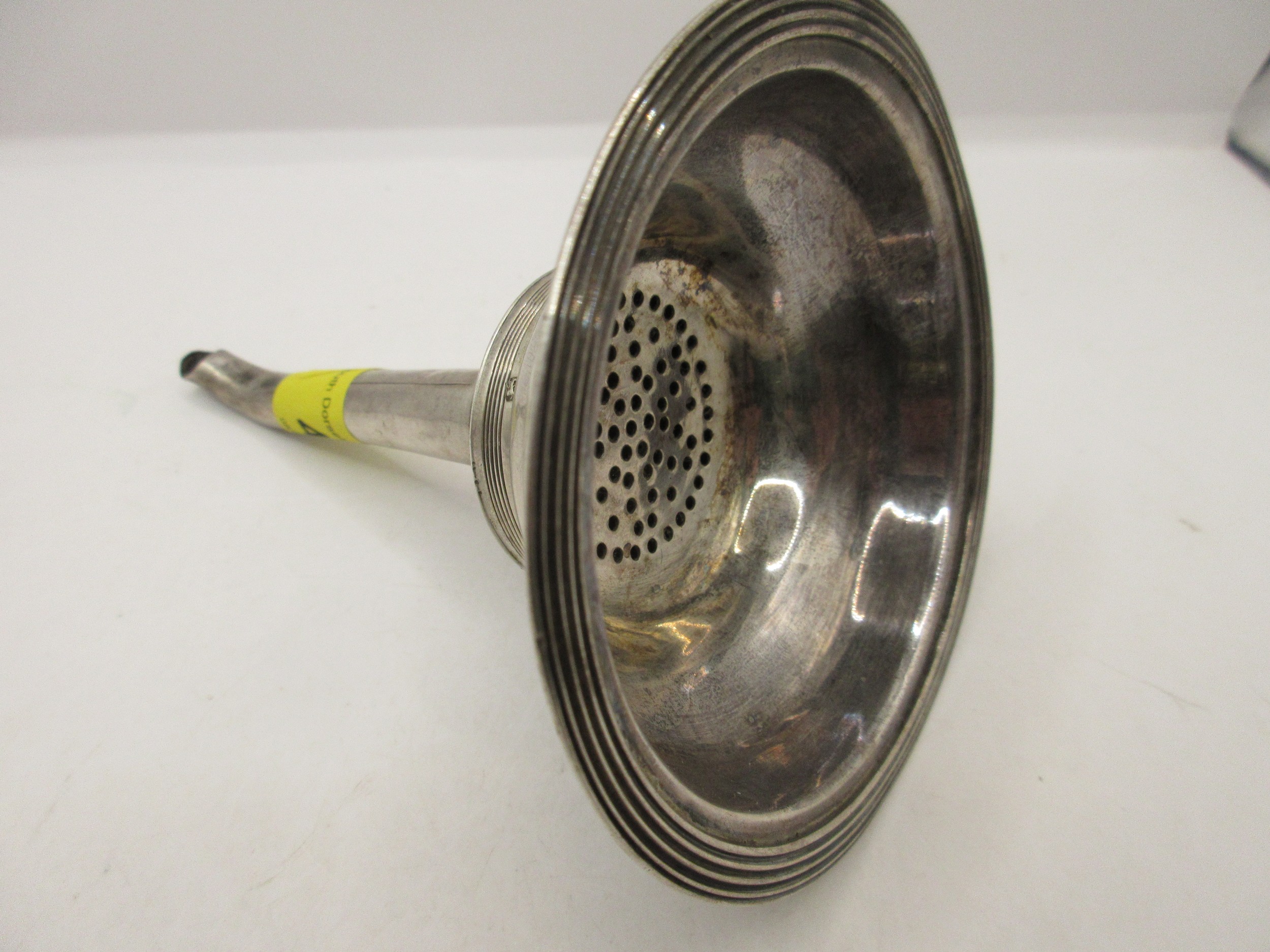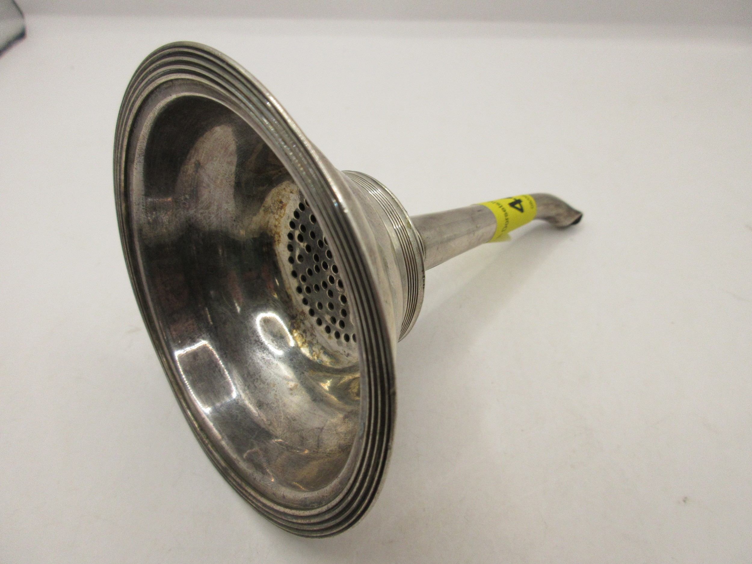 An antique sterling silver wine decanting funnel with strainer, generic lion mark for sterling silver but no assay or date marks, likely Georgian, funnel spout a little bent but overall in good order. Initialled in script beneath rim ''IM" or similar. Approx weight 92.35g