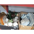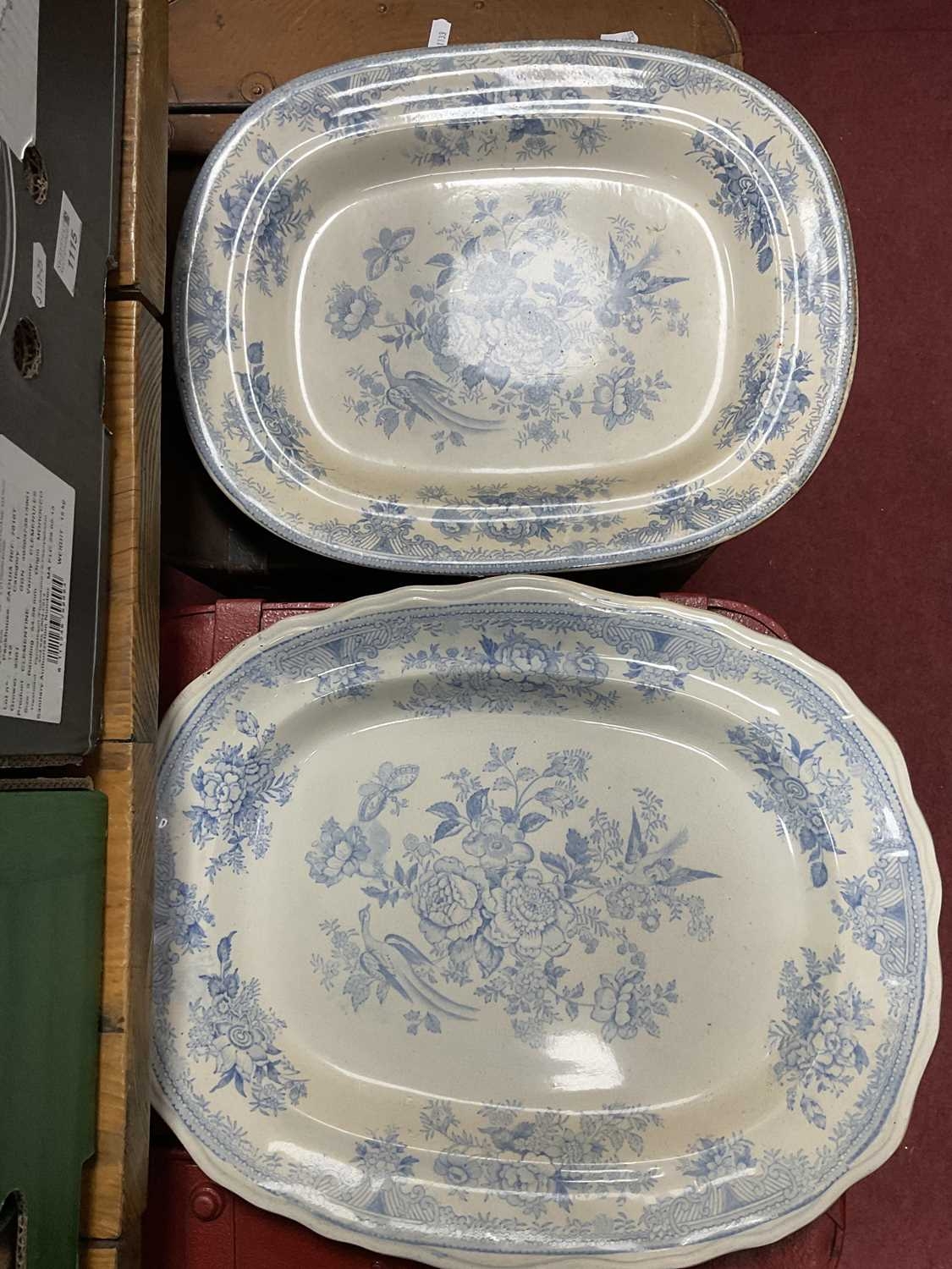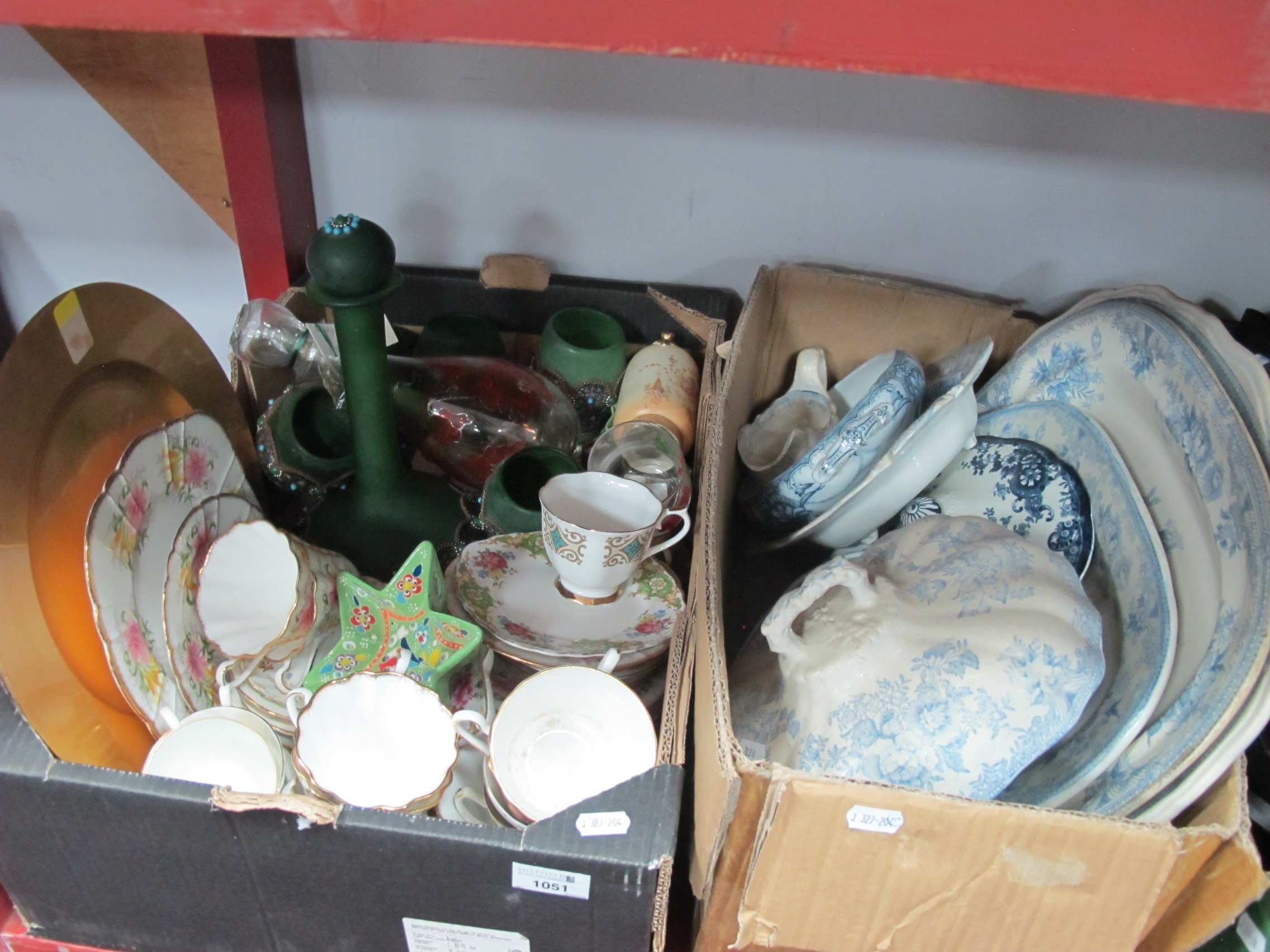 XIX Century Blue White Meat Plates 'Asiatic Pheasants', blue white tureens, green glass decanter (poss Moroccan), tumblers, etc:- One Box.