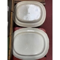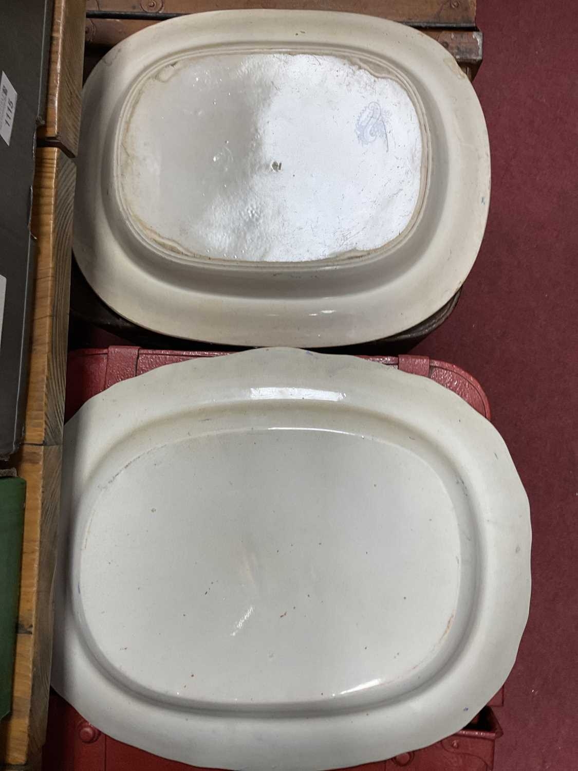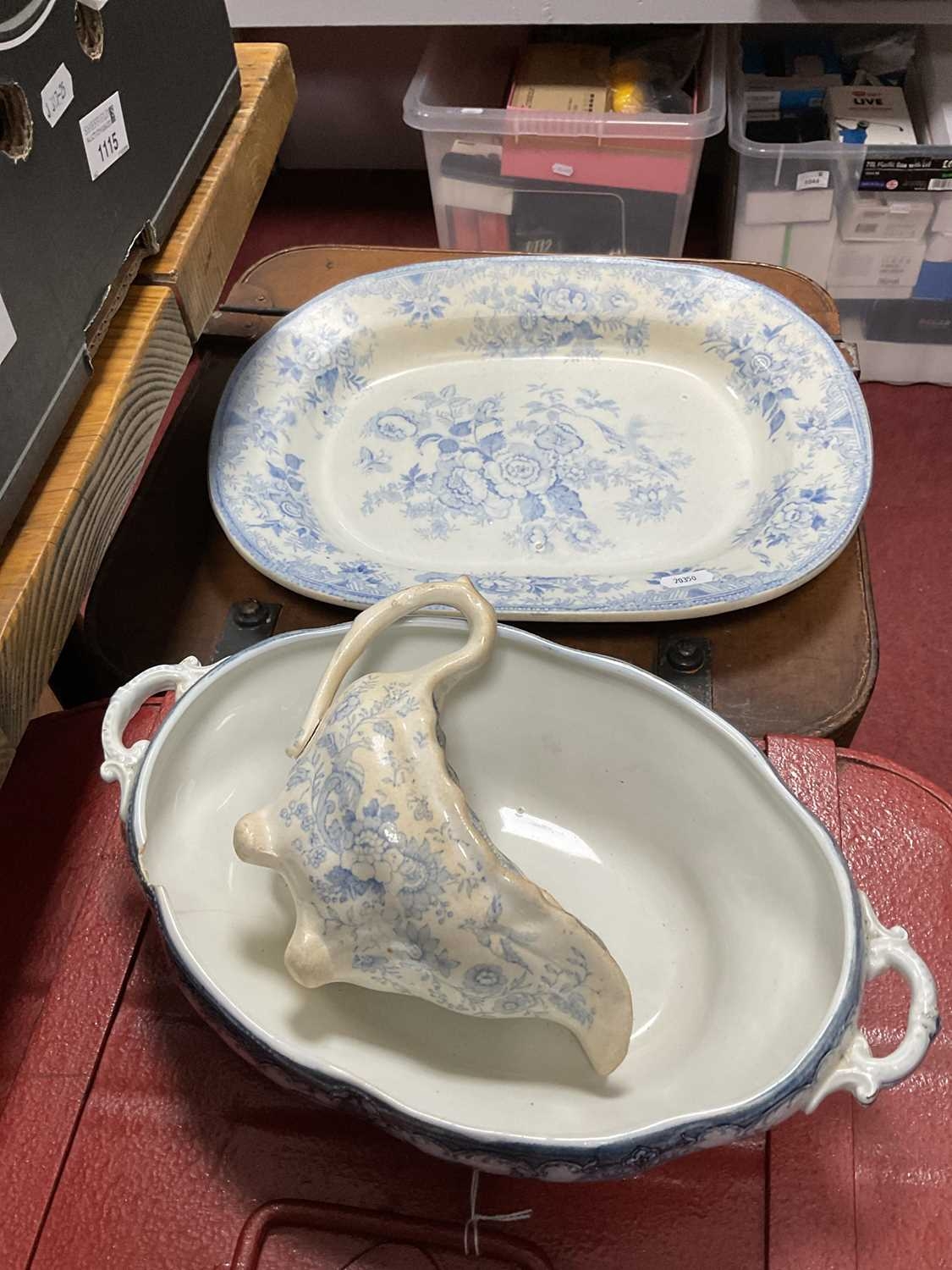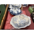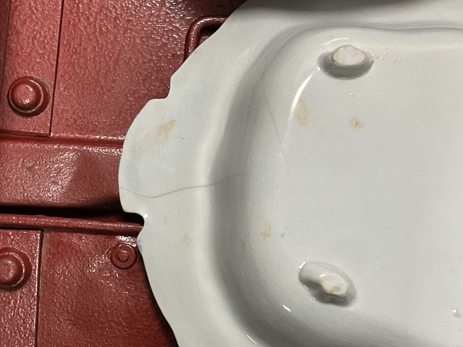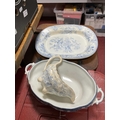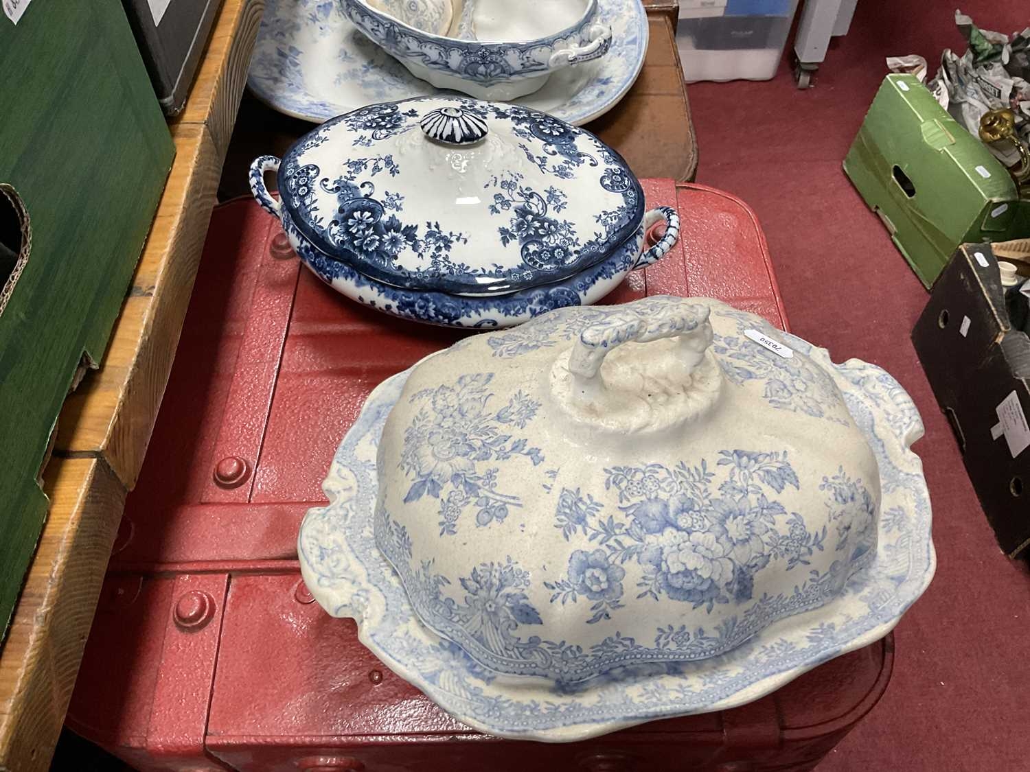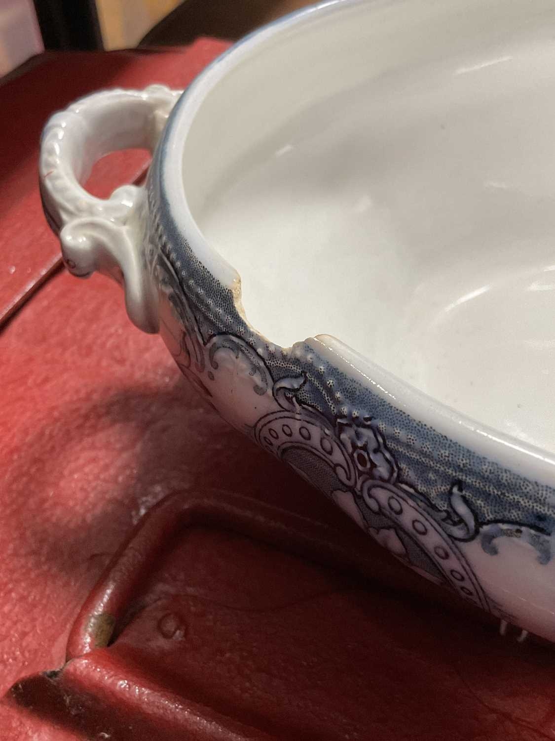 One lidded tureen with crazing, crack and hairlines, another tureen with chip, all items with some wear, would benefit from a clean.
