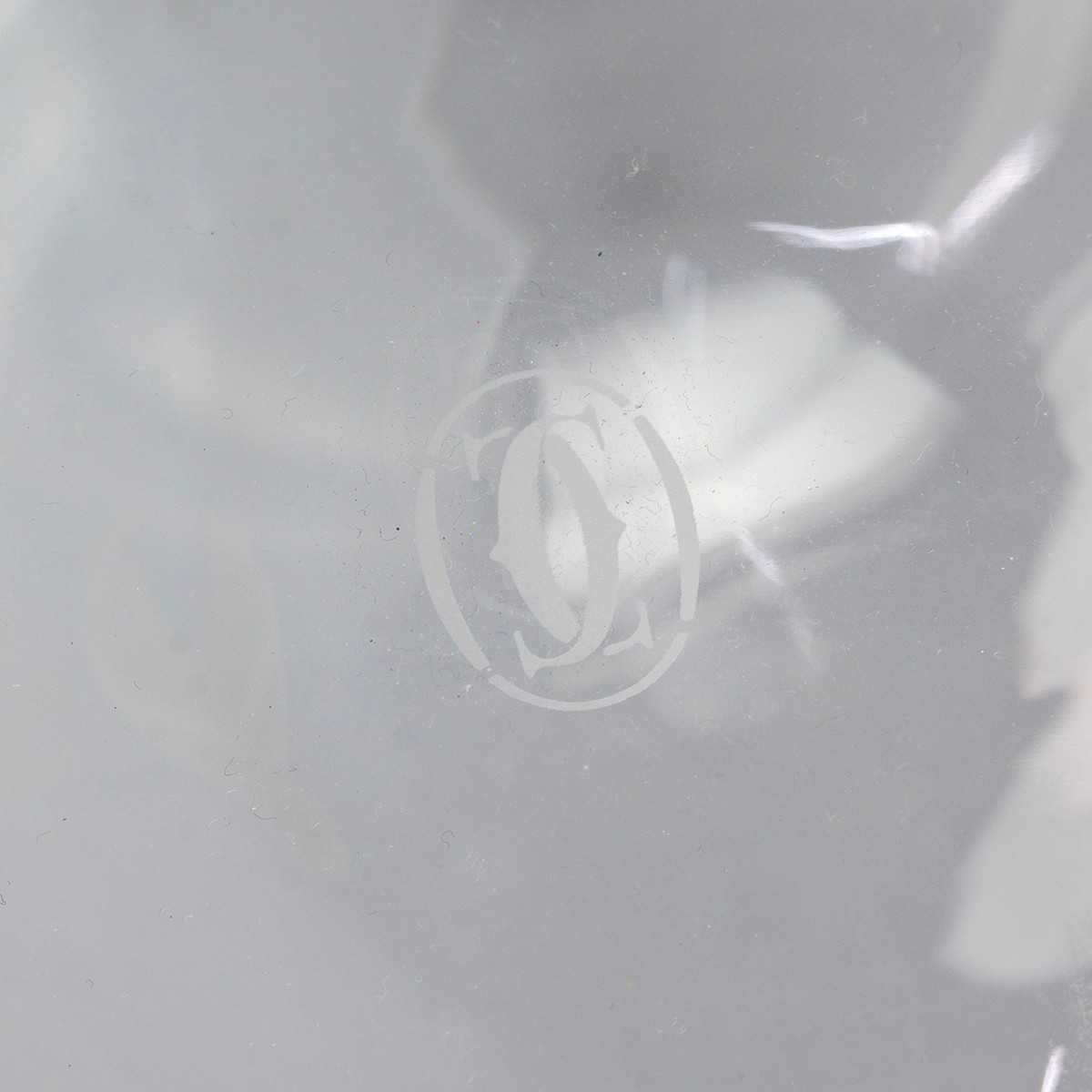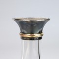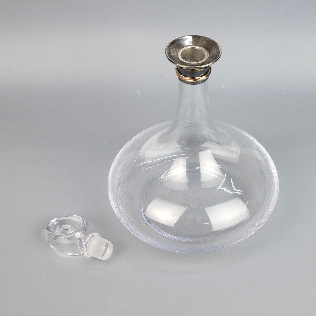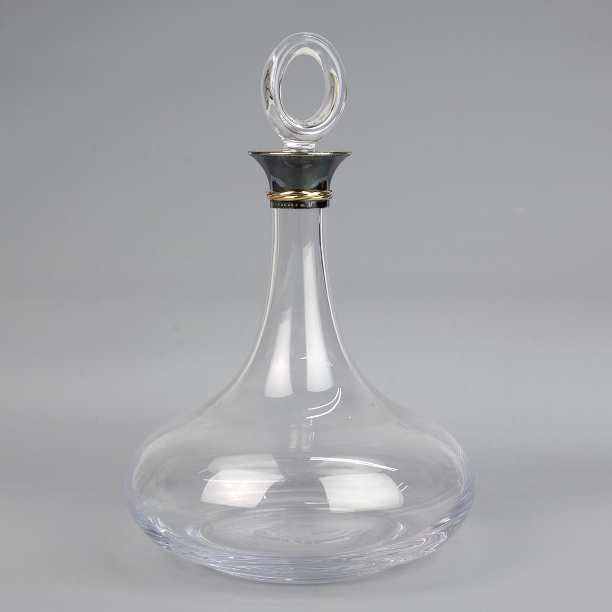 Cartier 'Trinity' decanter with hooped stopper and white metal rim stamped 925, Argent, Made in France Cartier and with a registration number G011609. Three entwined yellow and white metal bands. The base of the decanter etched with the interlocking C's logo for Cartier. Overall height 31cm.