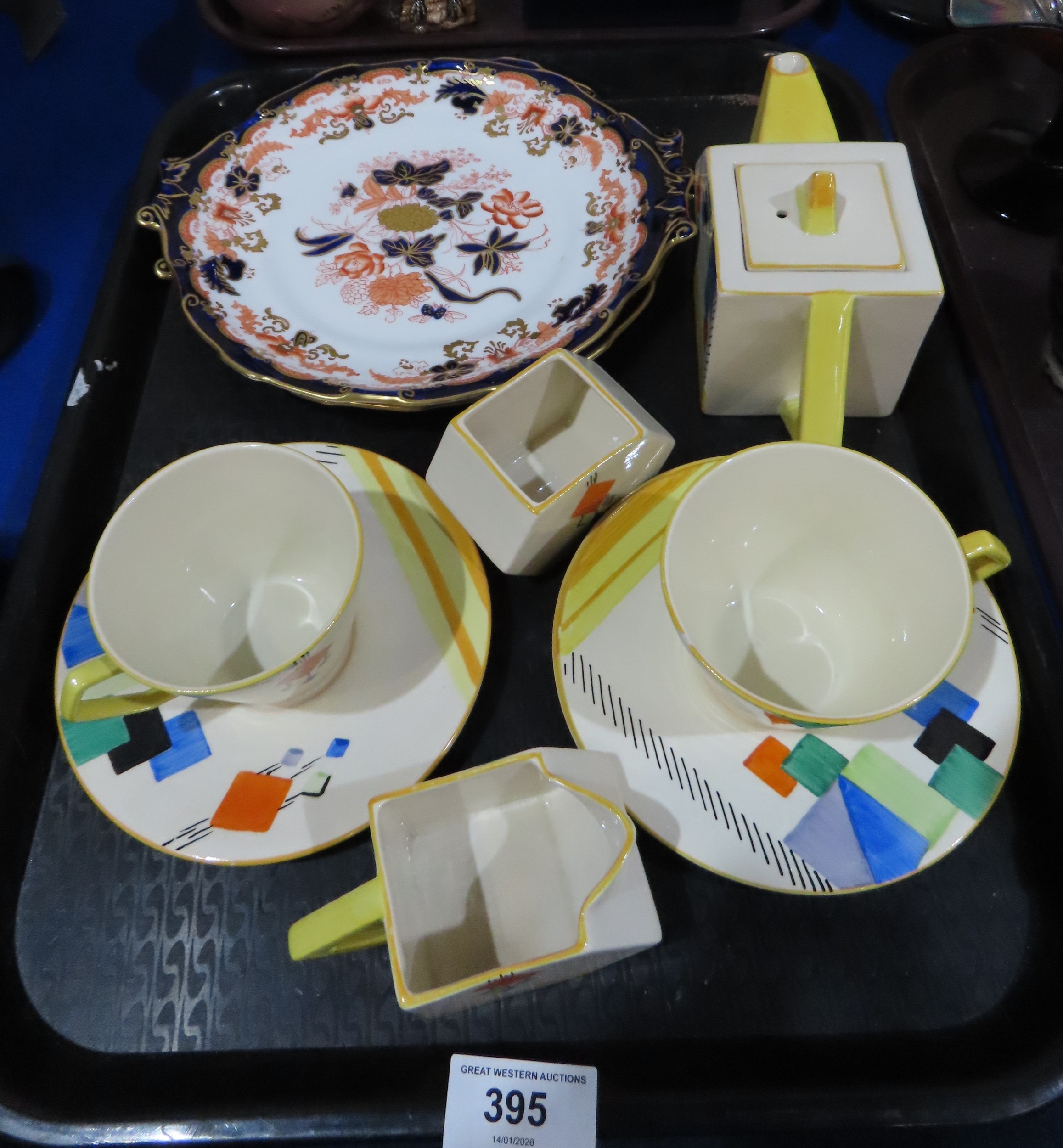 A Hanley Pearl Art Deco bachelor tea set and two Royal Crown Derby plates