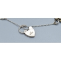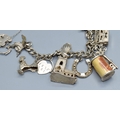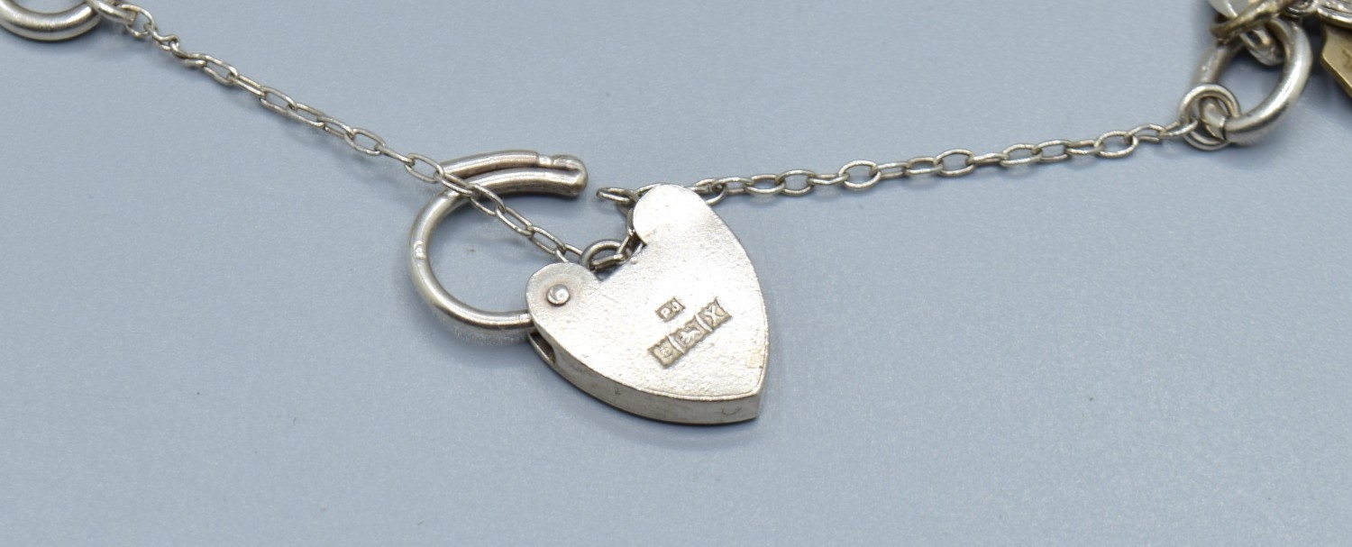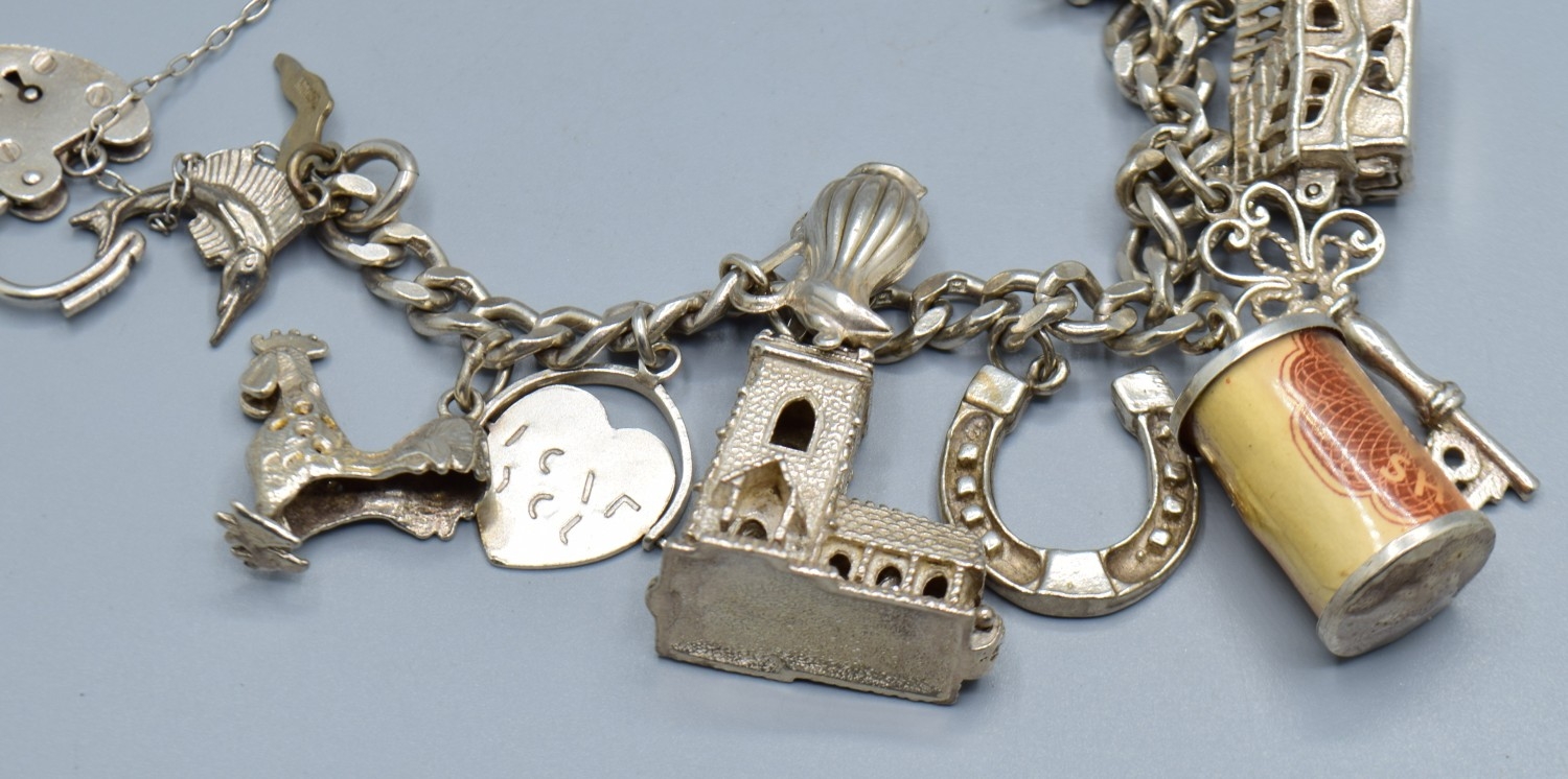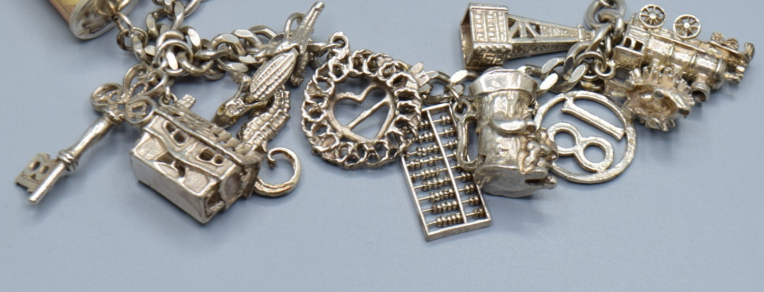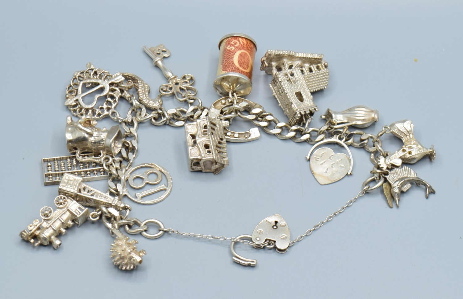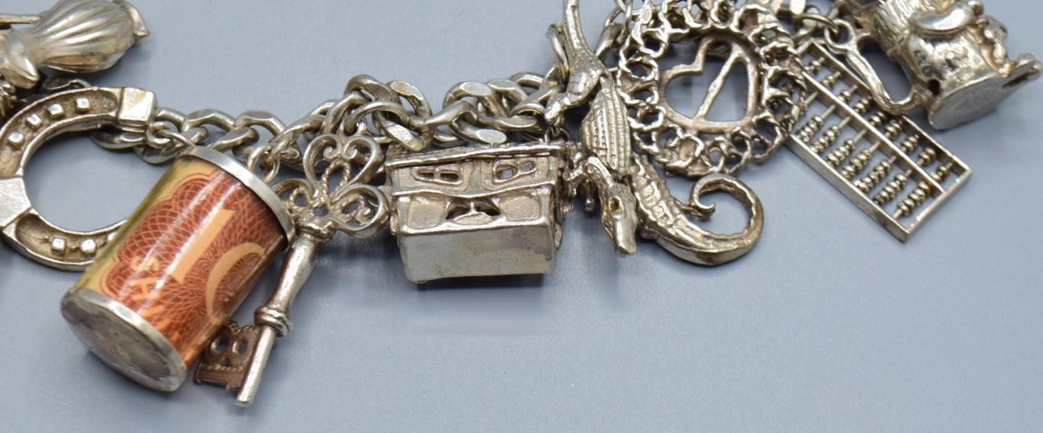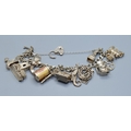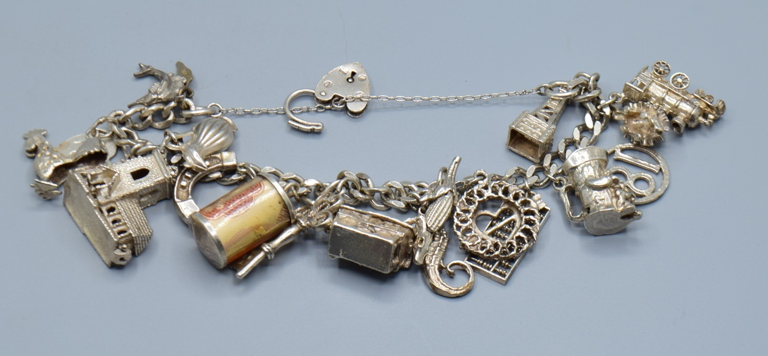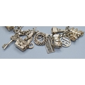 Ladies 925 silver charm bracelet with padlock catch and safety chain, together with 15 charms to include the Emergency money item, 63grams