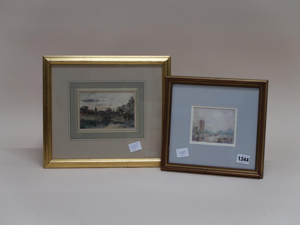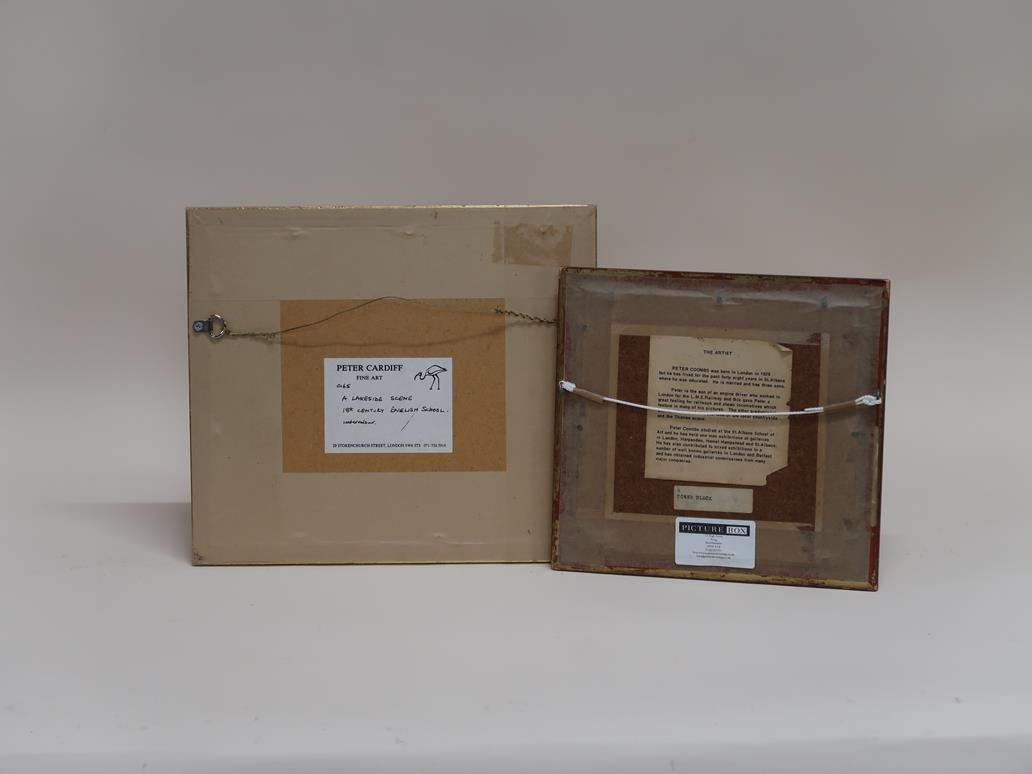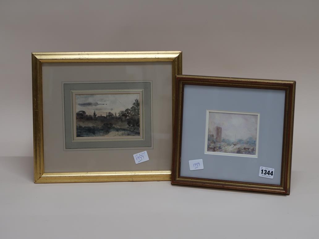 TWO WATERCOLOURS - PETER COOMBS, TOWER BLOCK & UNSIGNED, LAKESIDE SCENE 18C ENGLISH SCHOOL