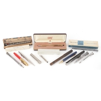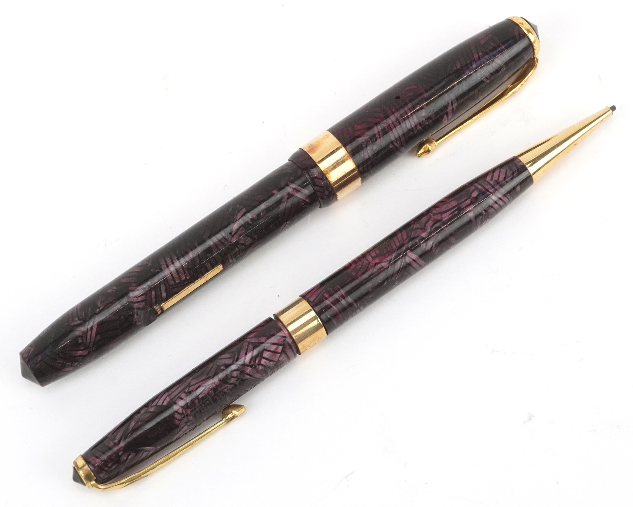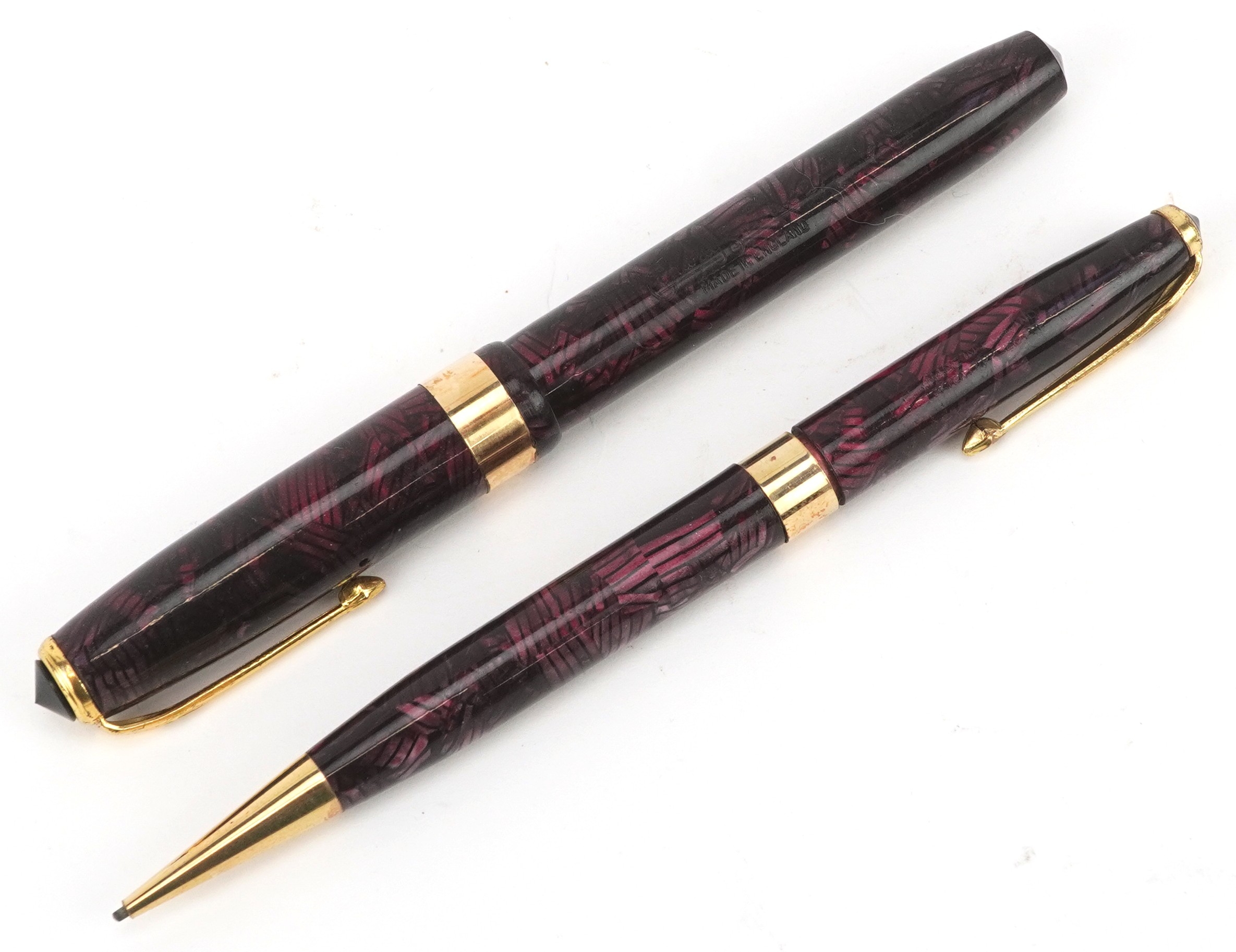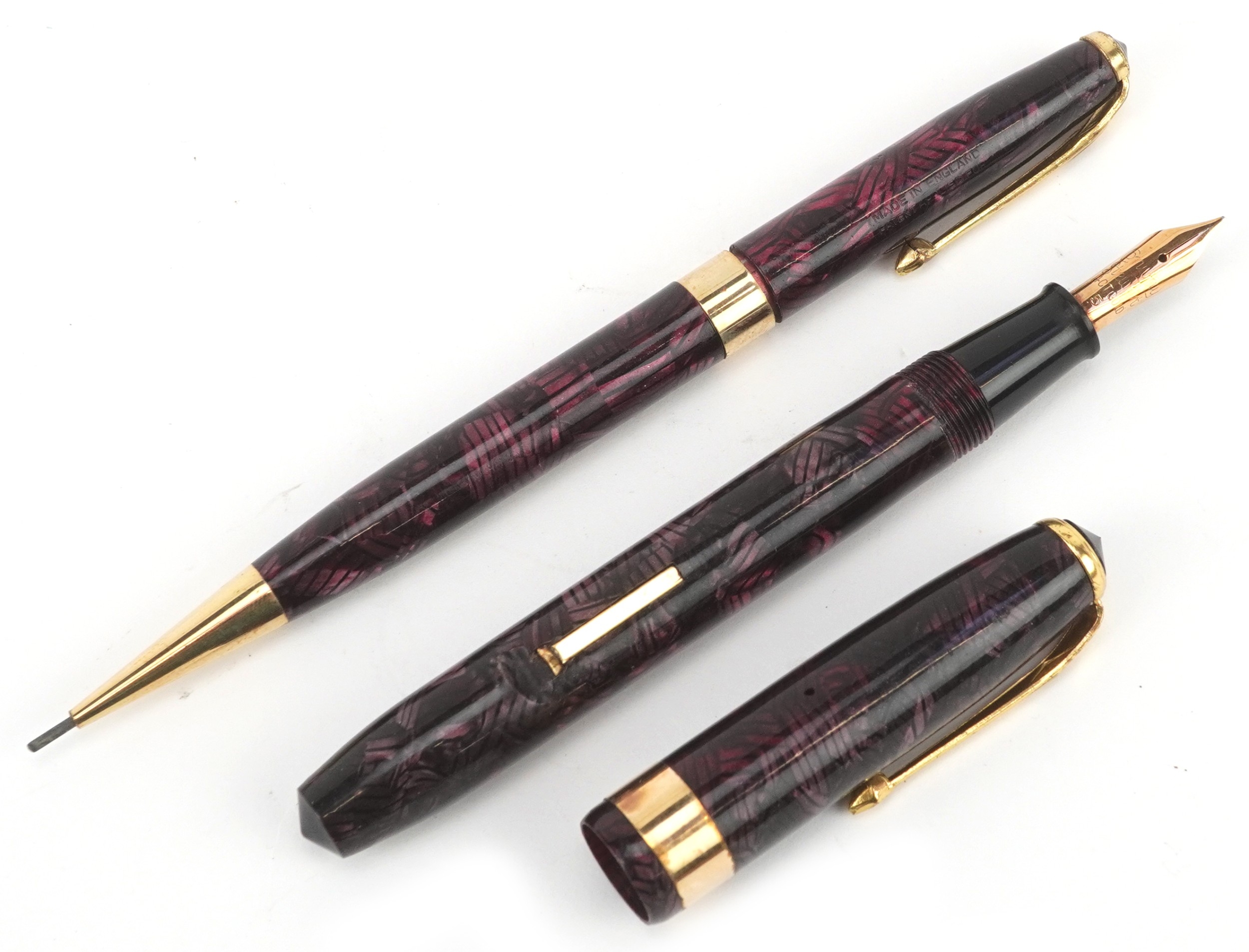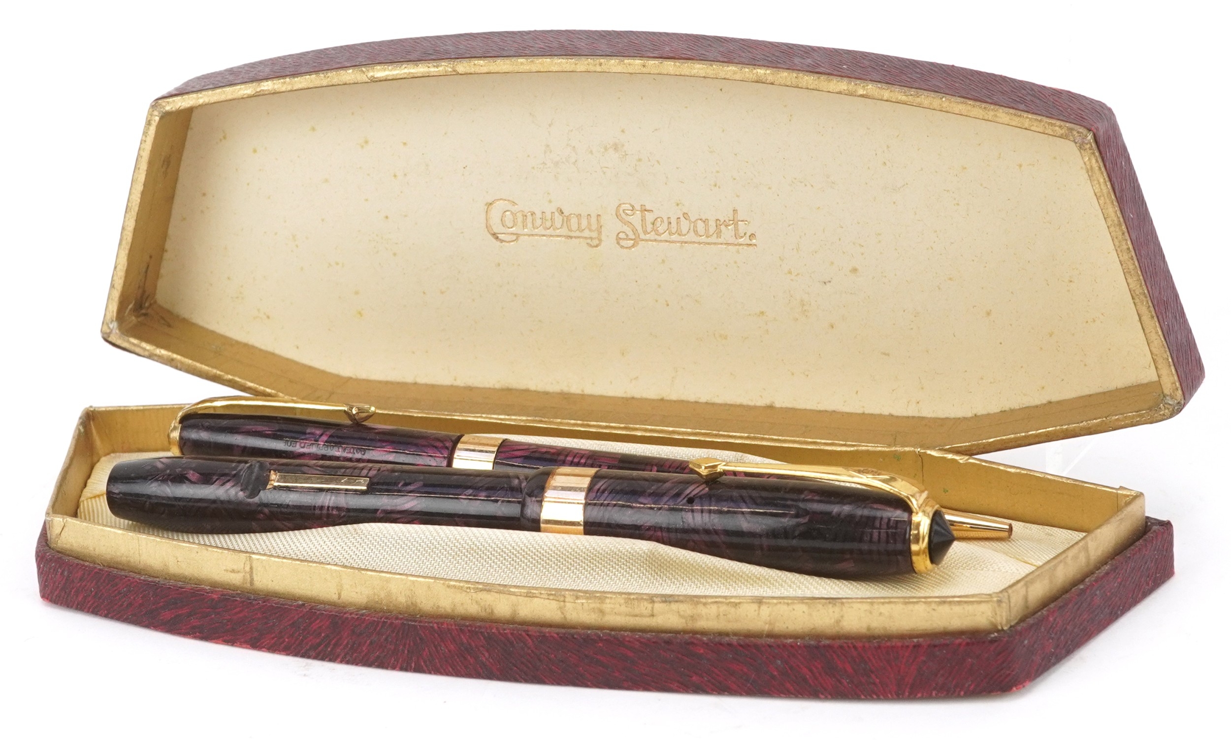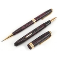 A Conway Stewart fountain pen with 14ct gold nib and matching propelling pencil, cased, 18cm wide.