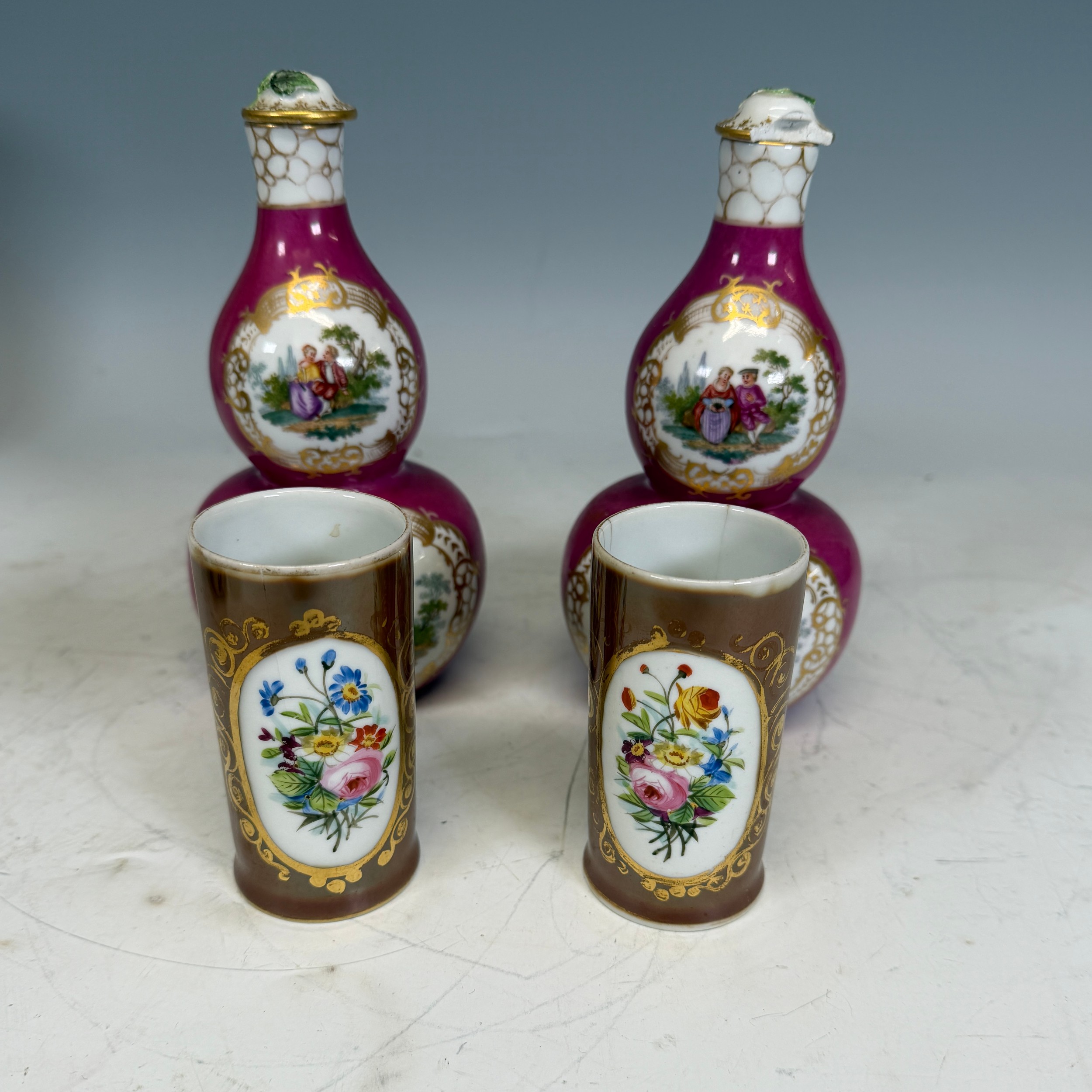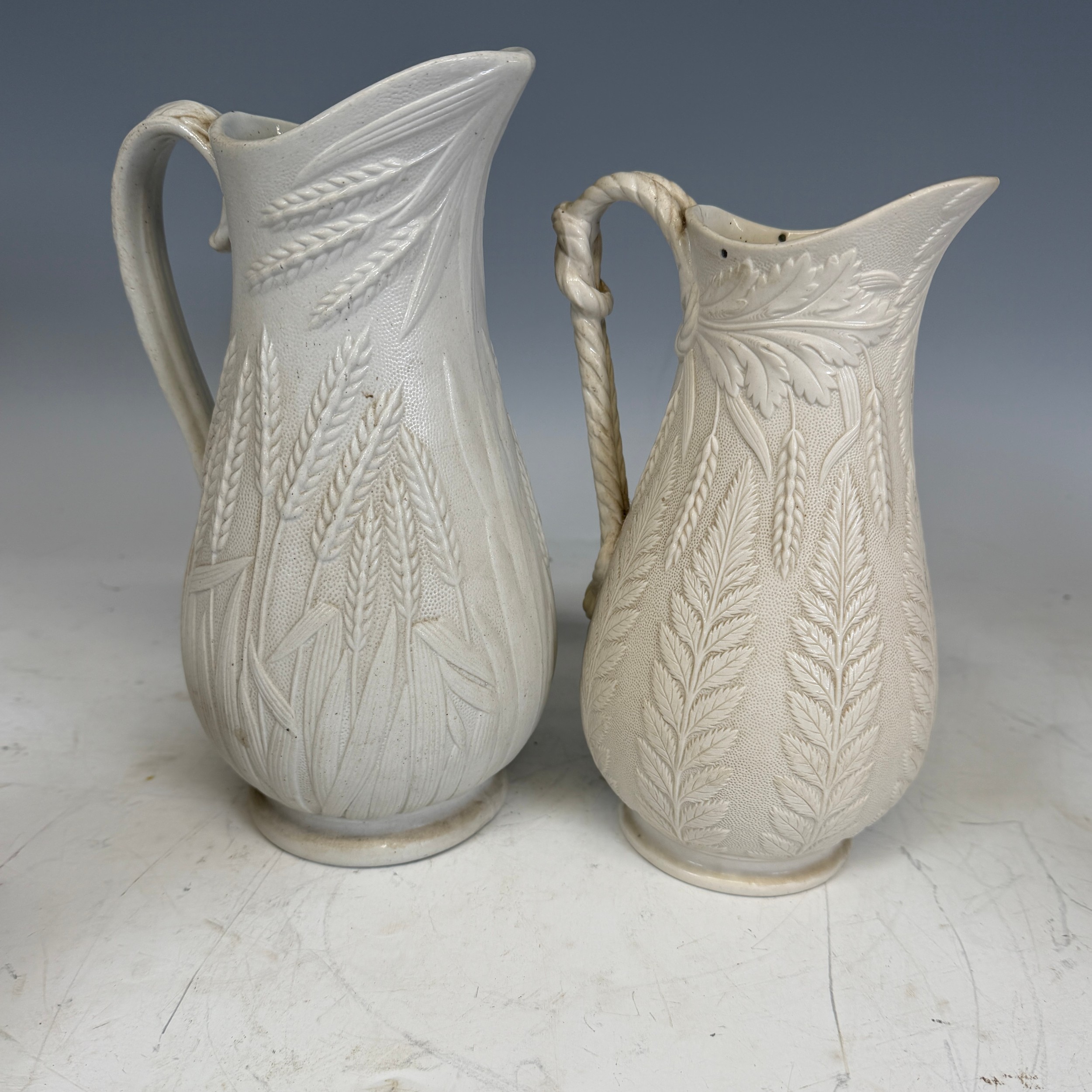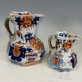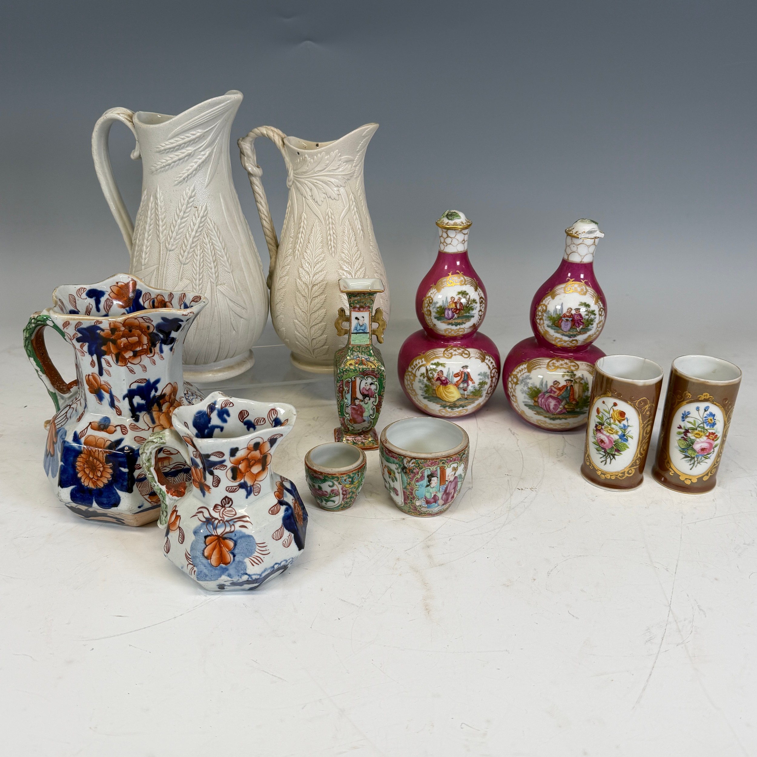 A quantity of Dresden style Ceramics, together with a pair of Dudson Jugs, decorated in relief with ears of wheat, two 19th century octagonal hydra Jugs, and three Canton famille rose Chinese Pieces. (11) Note, some of the items in this lot are damaged, please see images.