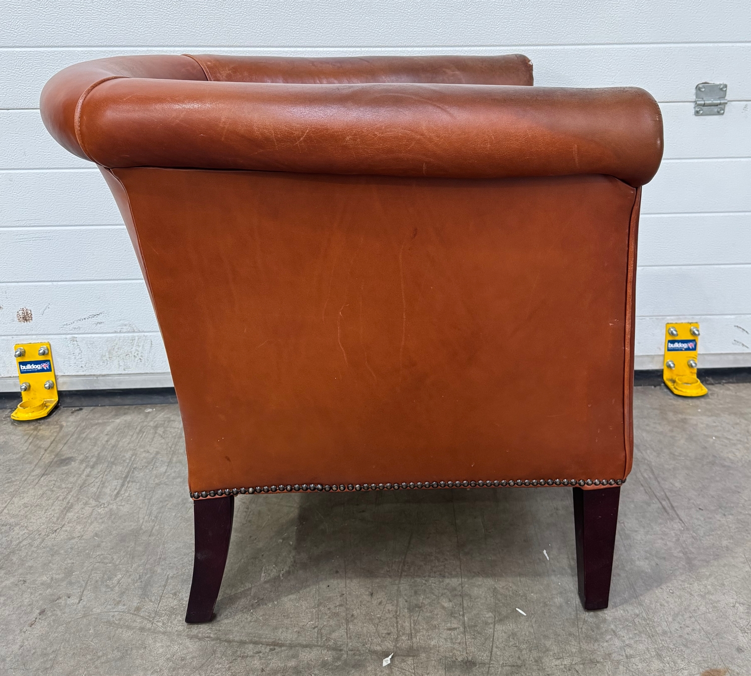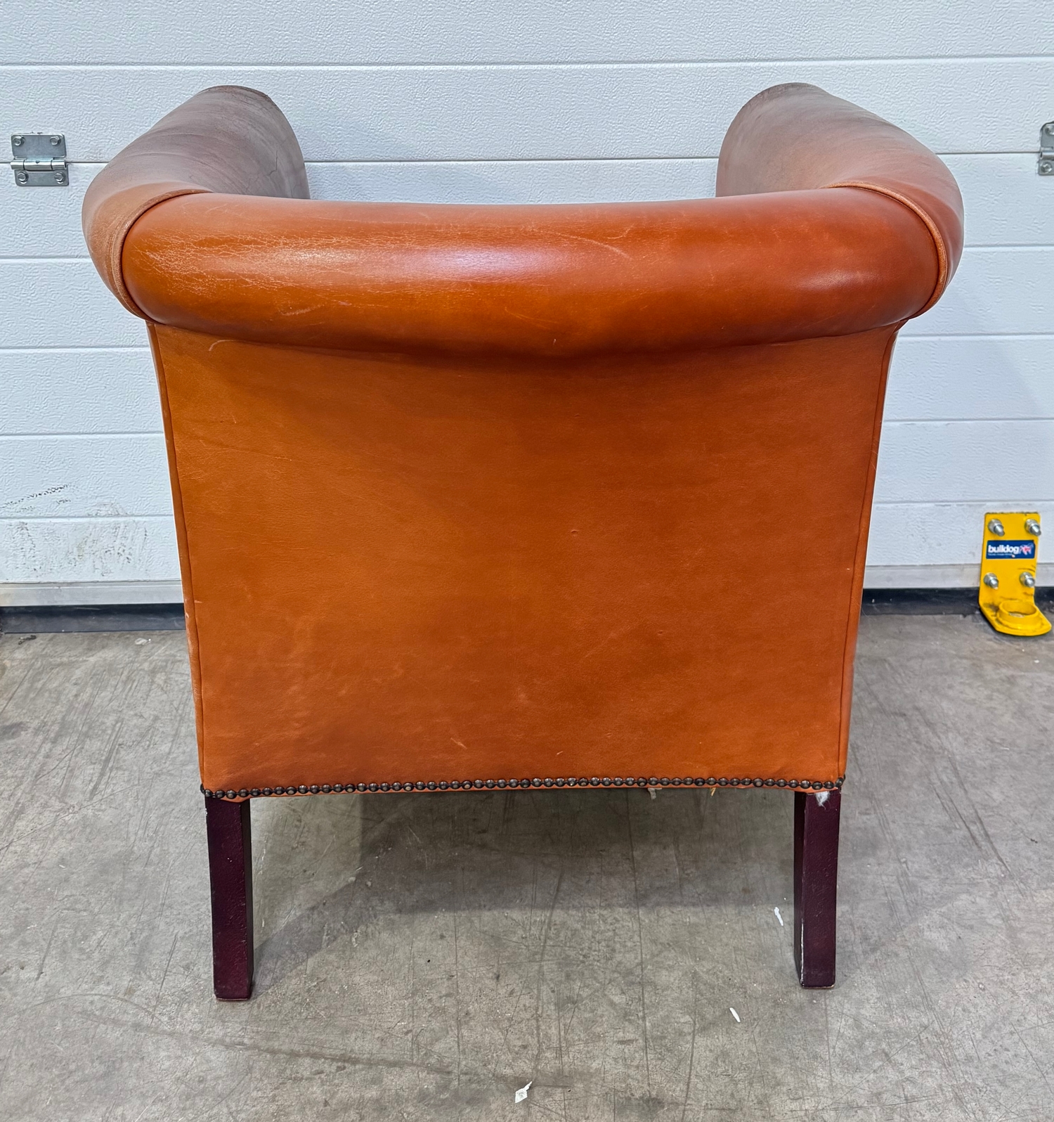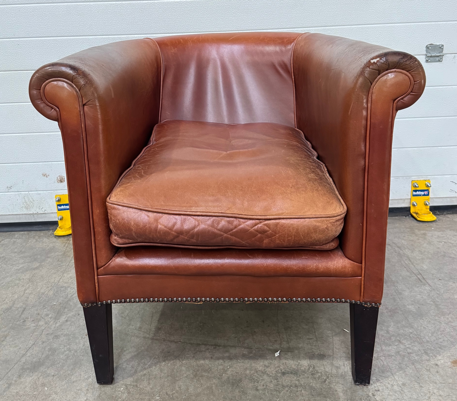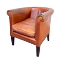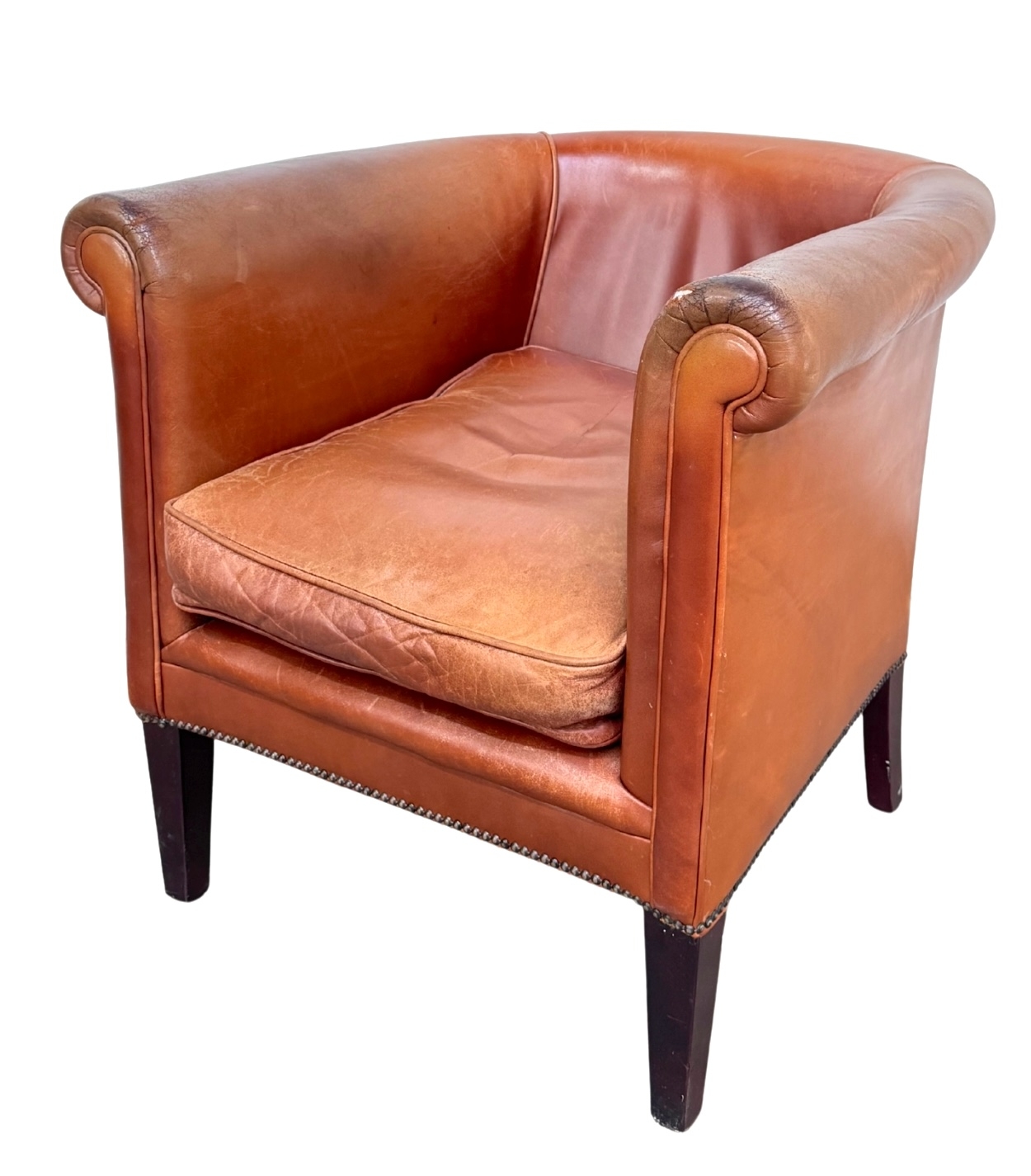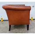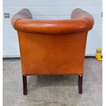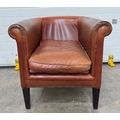 A Laura Ashley 'Osbourne' brown tan leather, tub armchair in a club style with brass studding, legs are of mahogany stained beech, w: 79cm, h: 77cm, d: 83cm, (1)