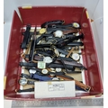 A selection of watches, all with leather straps. Some are branded for company distribution. Together with a box of spare parts. Also includes a stainless steel letter opener with Michellen mark to handle.