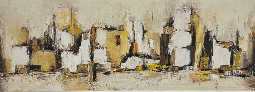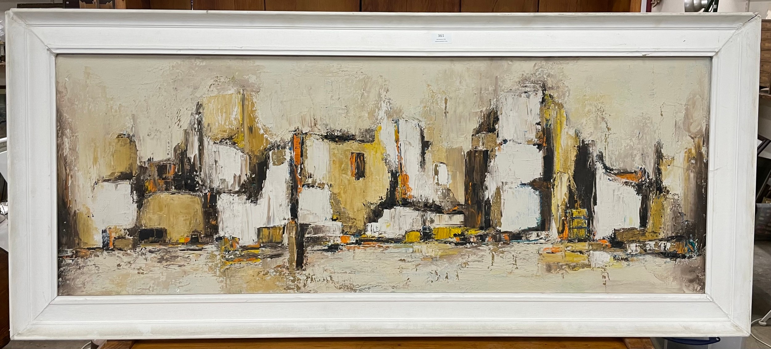 * Sams, abstract cityscape, oil on board, framed