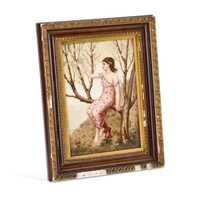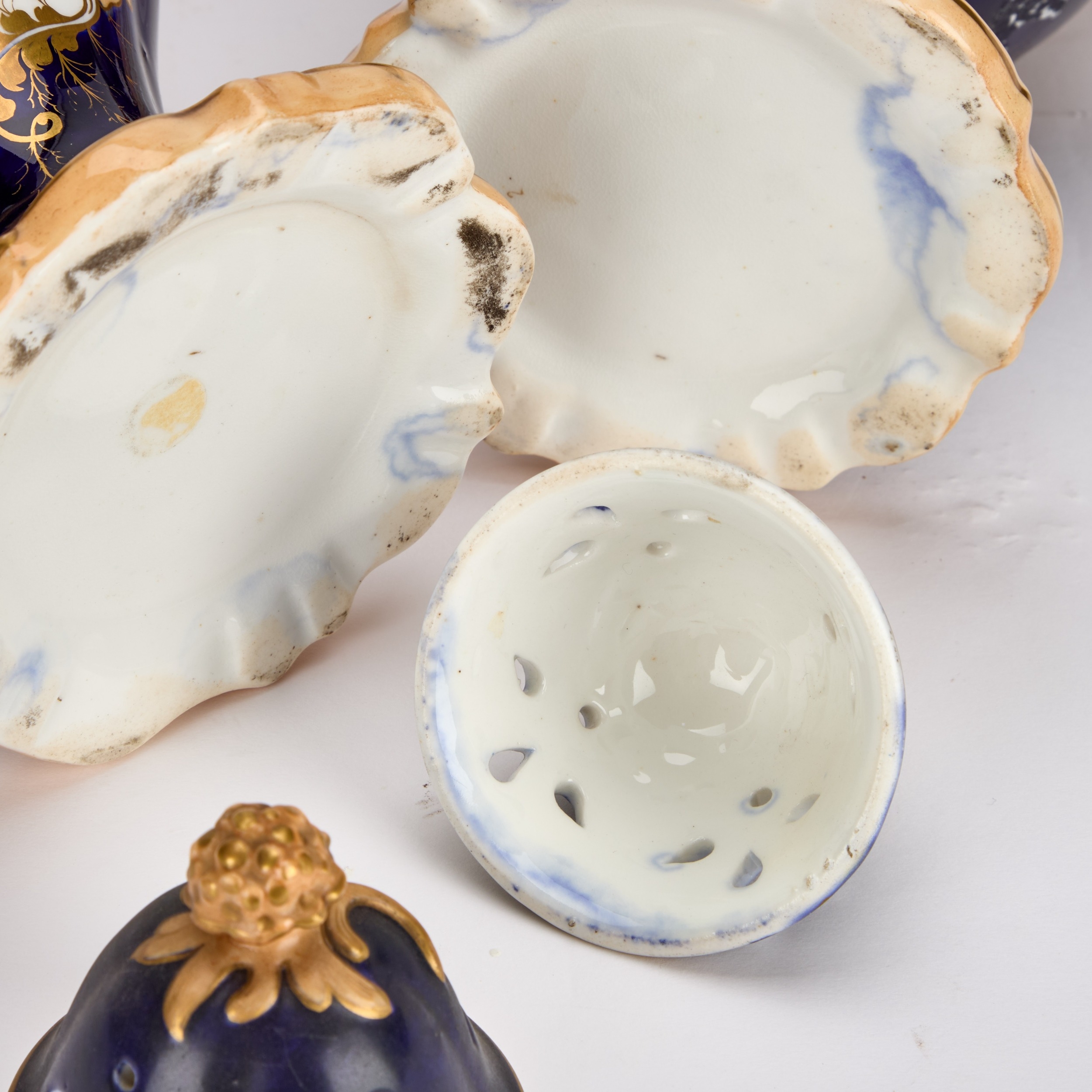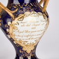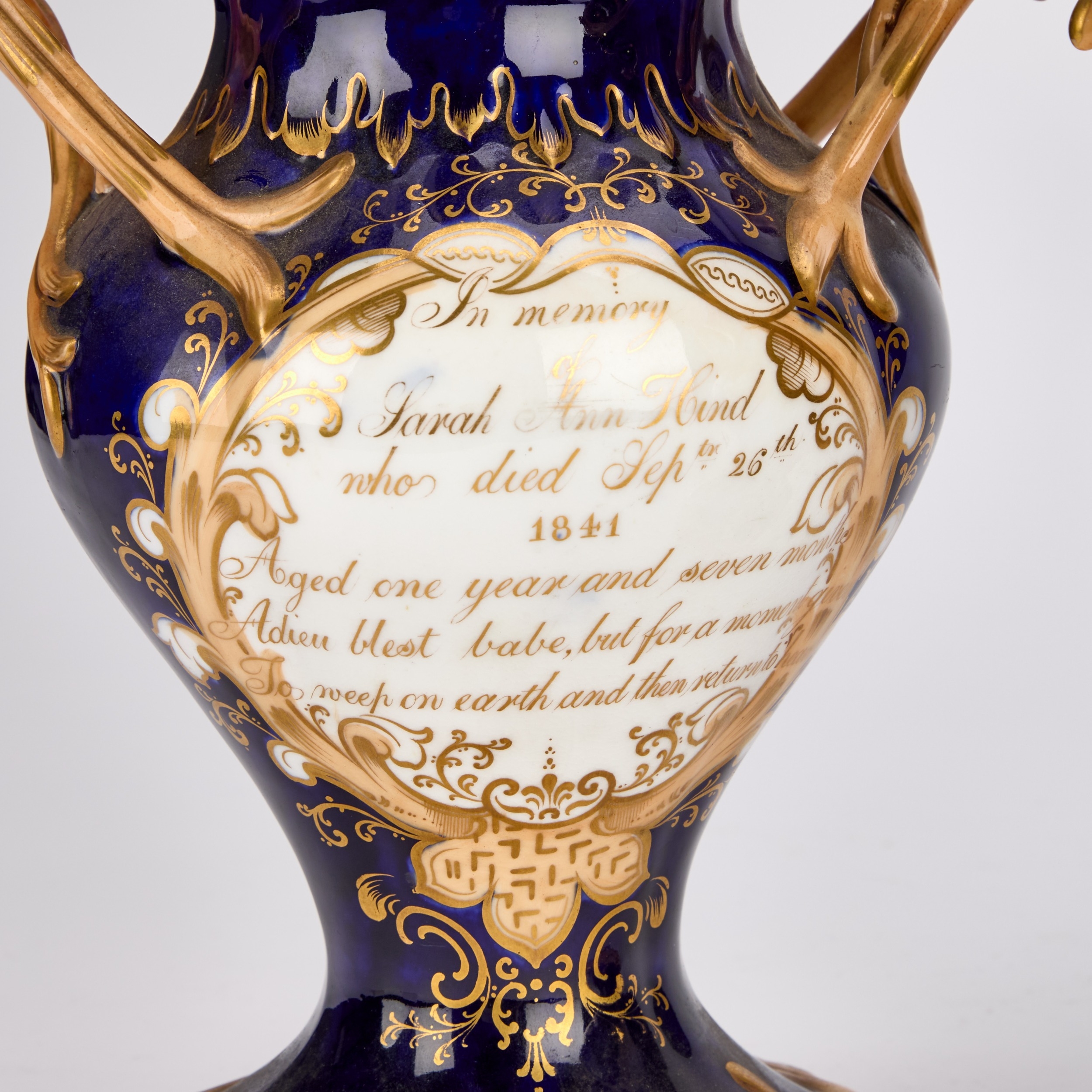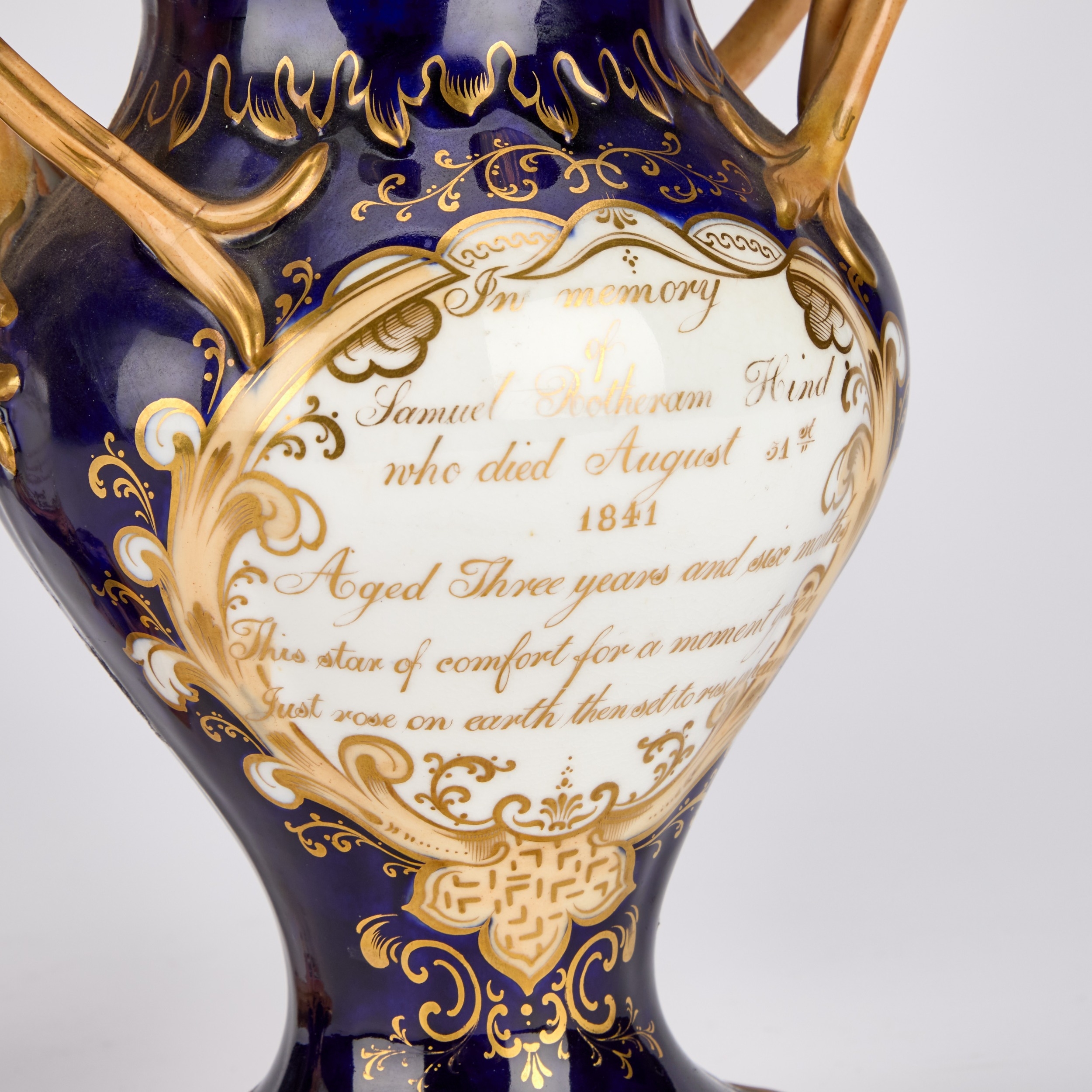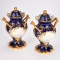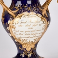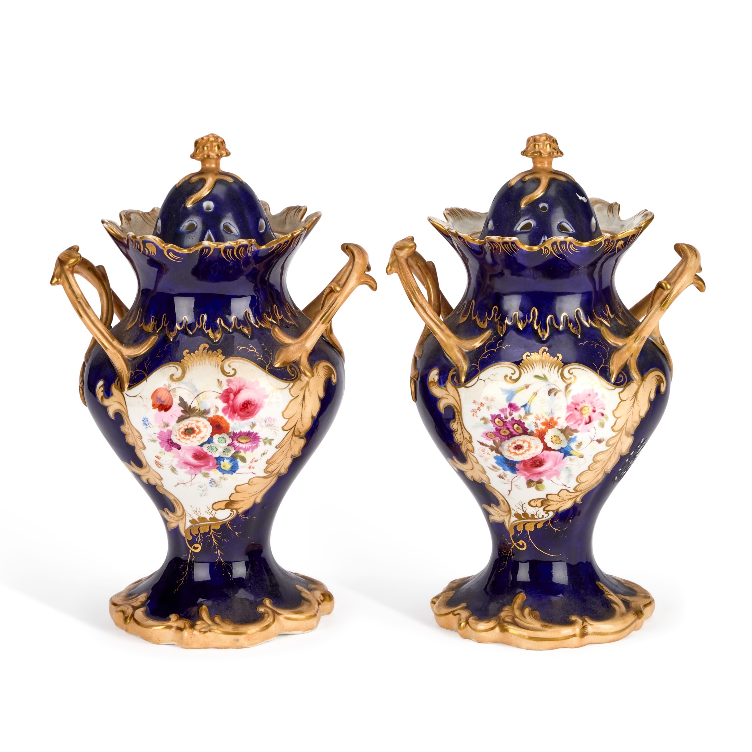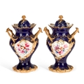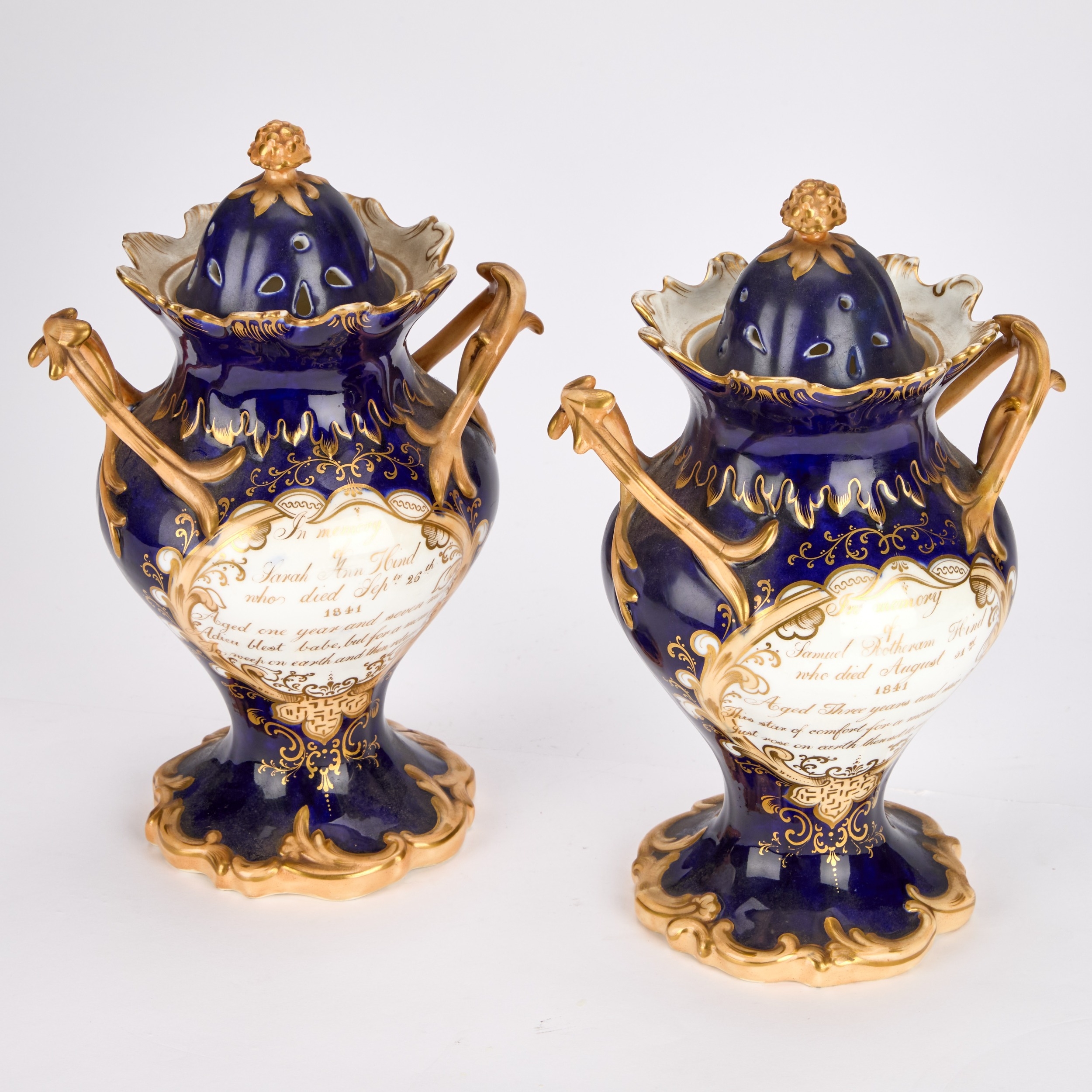 each of footed inverse baluster form with a pair of triple foliate tendril handles, on a cobalt-blue ground, painted with floral bouquets within gilt foliate scroll cartouches, the pierced covers inscribed in gilt with memorials to Samuel Rotheram Hind and Sarah Ann Hind, 1841. (2) 25cm high