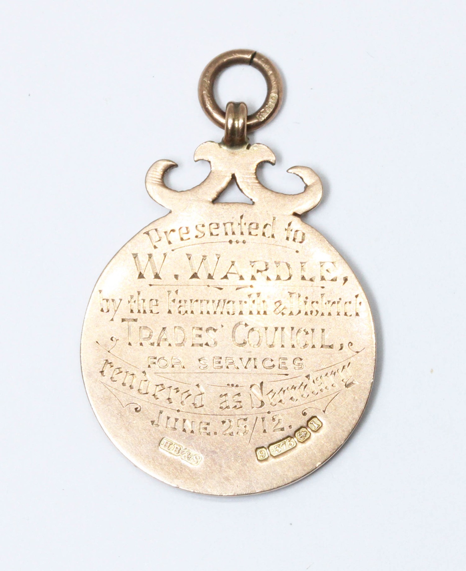 A hallmarked 9ct gold presentation fob, length 43mm, weight 8.7g.