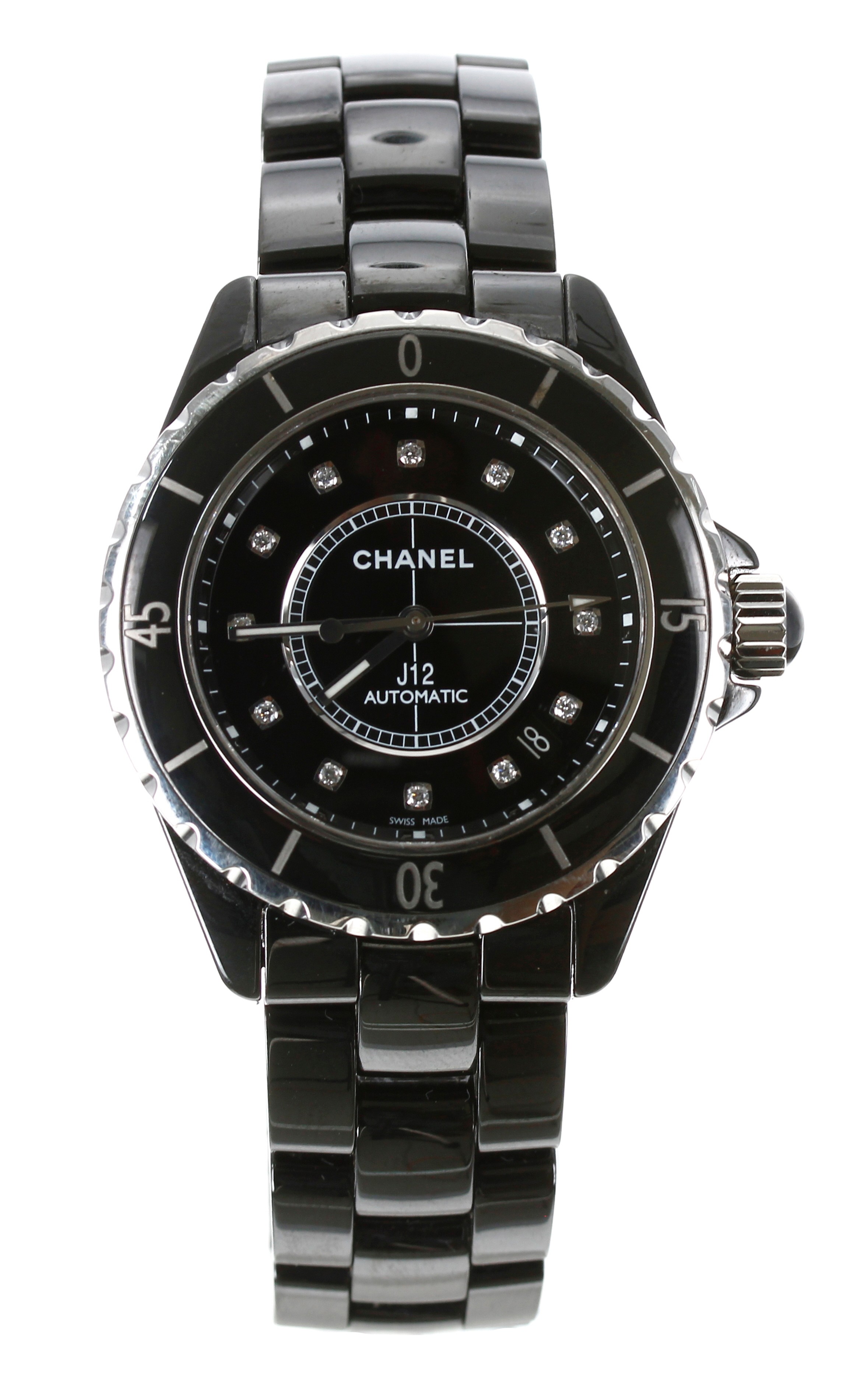 Chanel J12 automatic black ceramic gentleman's wristwatch, case no. N.Q.R. 78xxx, dial with diamond markers rotating bezel, black ceramic bracelet with signed butterfly clasp, 39mm bezel (ref: 466)