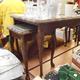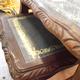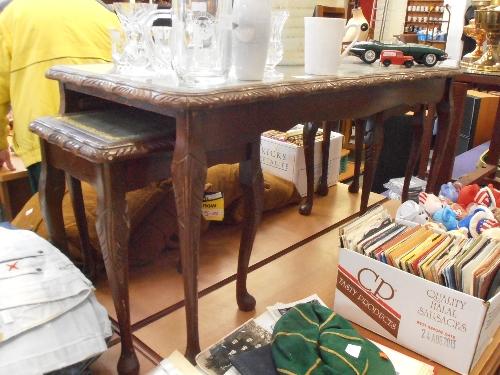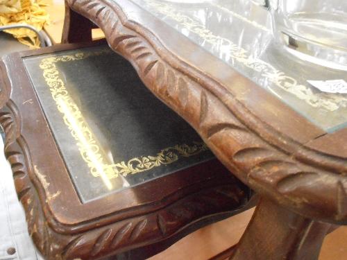 NEST OF THREE GLASS TOPPED TABLES WITH GREEN INLAID LEATHER AND CARVED EDGES