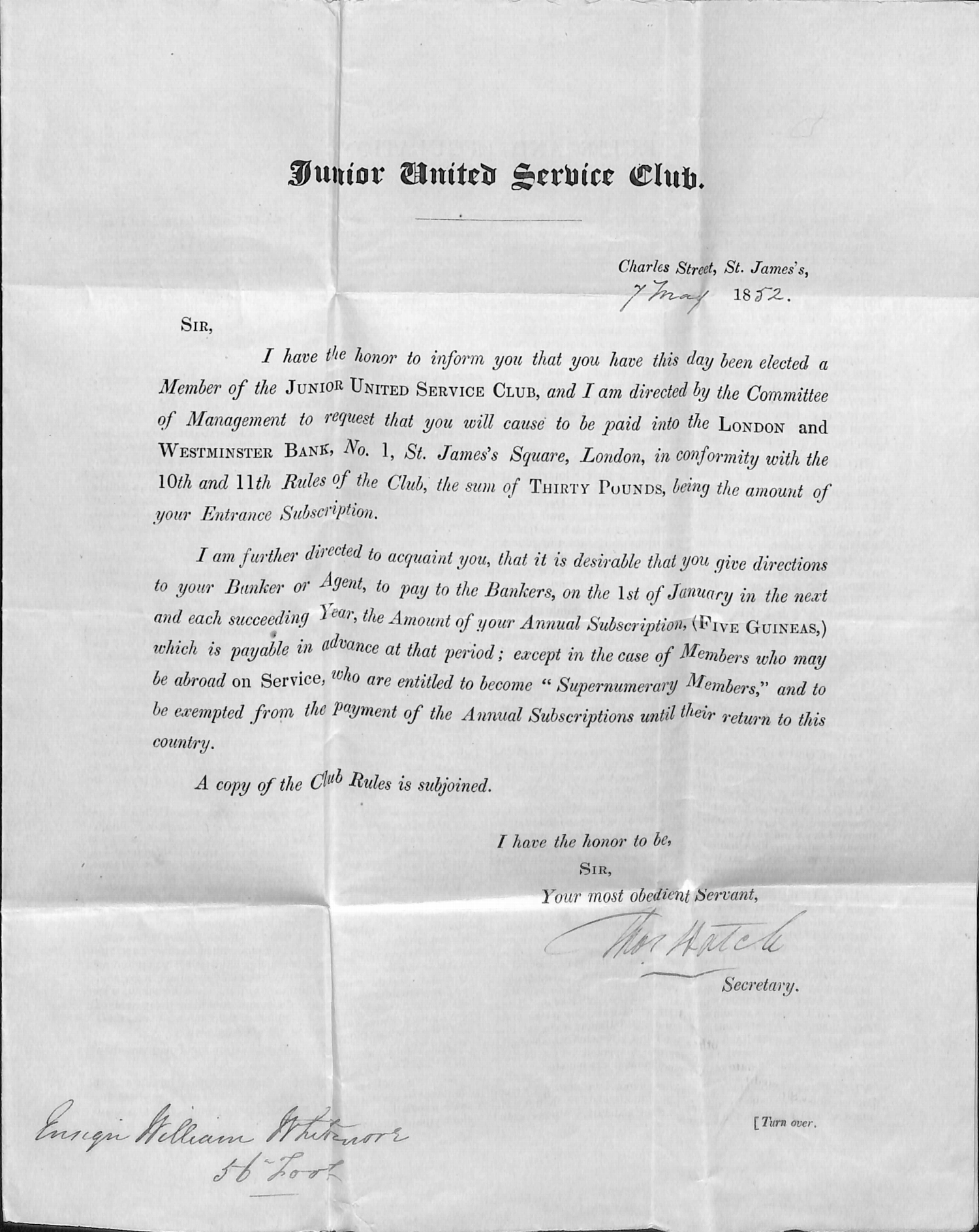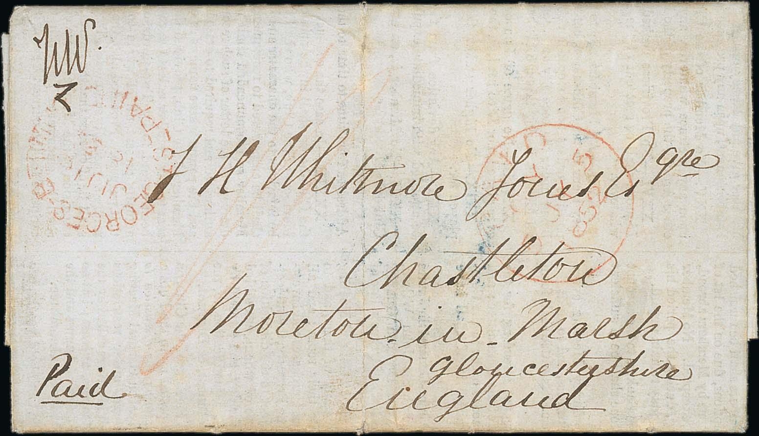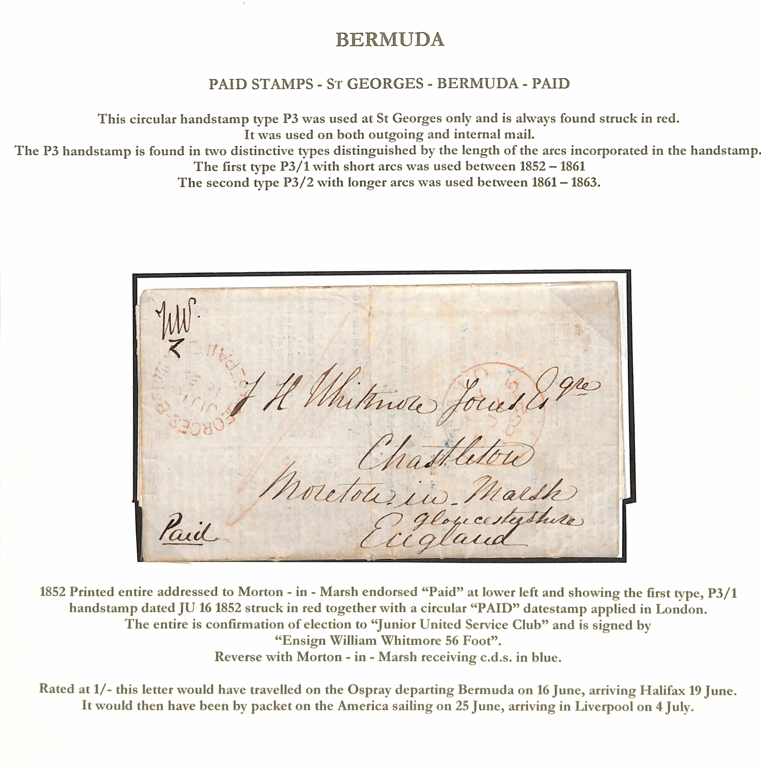 1852 (June 16) Printed "Junior United Services Club, London" letter confirming election to the club, signed by Ensign William Whitmore, 56th Foot, unusually posted from Bermuda to England prepaid 1/-, with red "ST. GEORGES - BERMUDA / PAID" first type datestamp with short side arcs, arrival datestamps of London and Morton-in-Marsh. Carried on the "Osprey" to Halifax, then by the "America" Packet to Liverpool. Photo on Page 10.