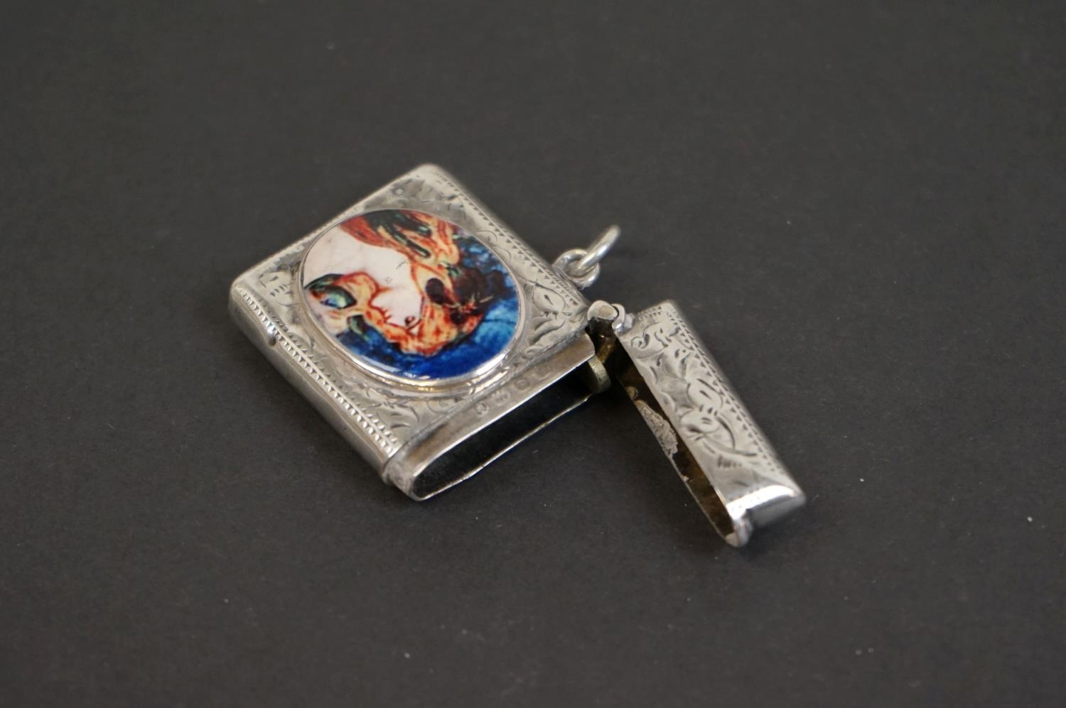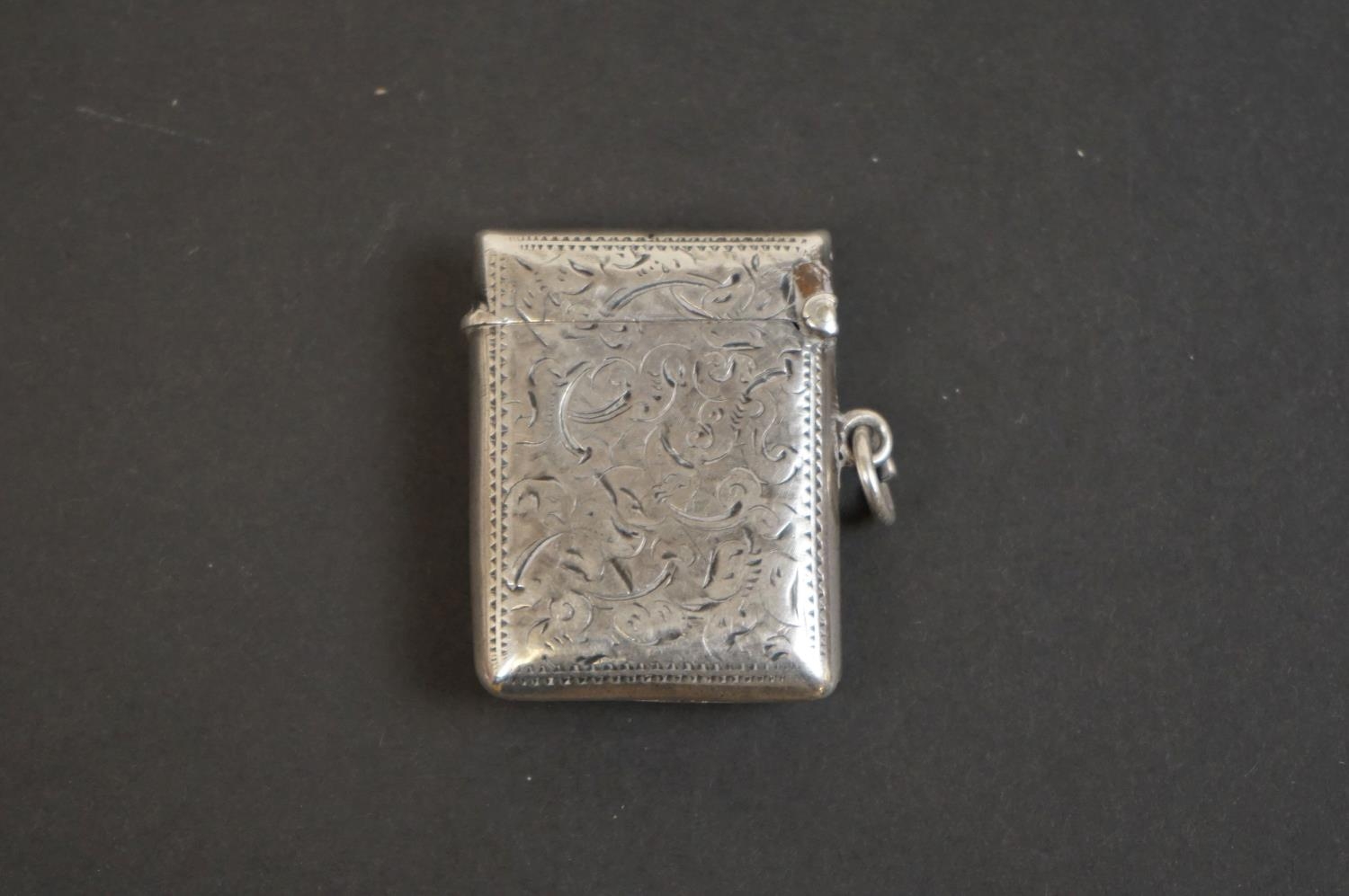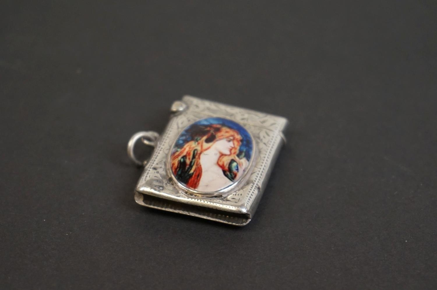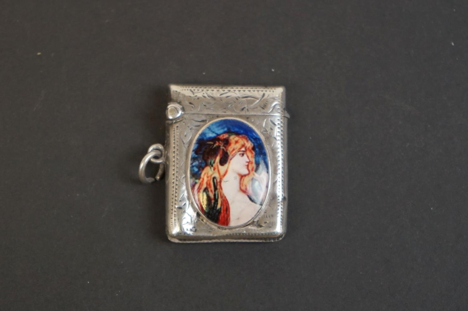Antique silver vesta case with pictorial image of a lady