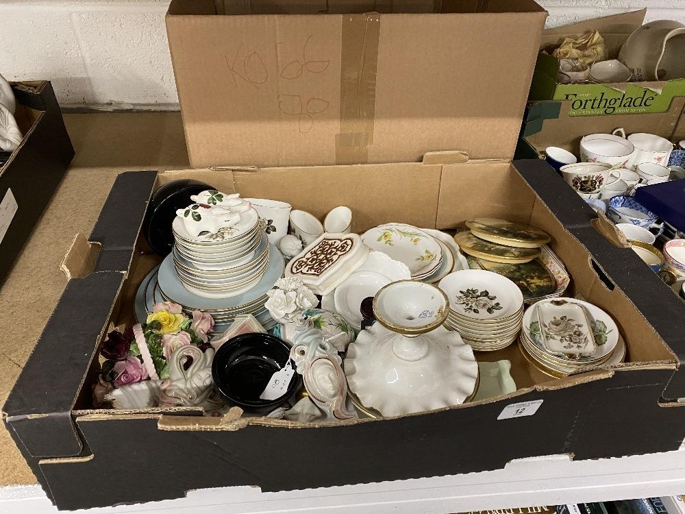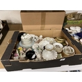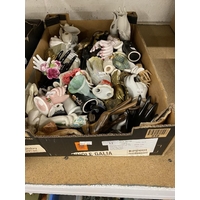 20th cent. Ceramics: Animals, floral decorations, and figures. Metalware, brass tray, silver plated and pewter tankards. Glassware to include vase, jugs and decanter. (2 boxes)