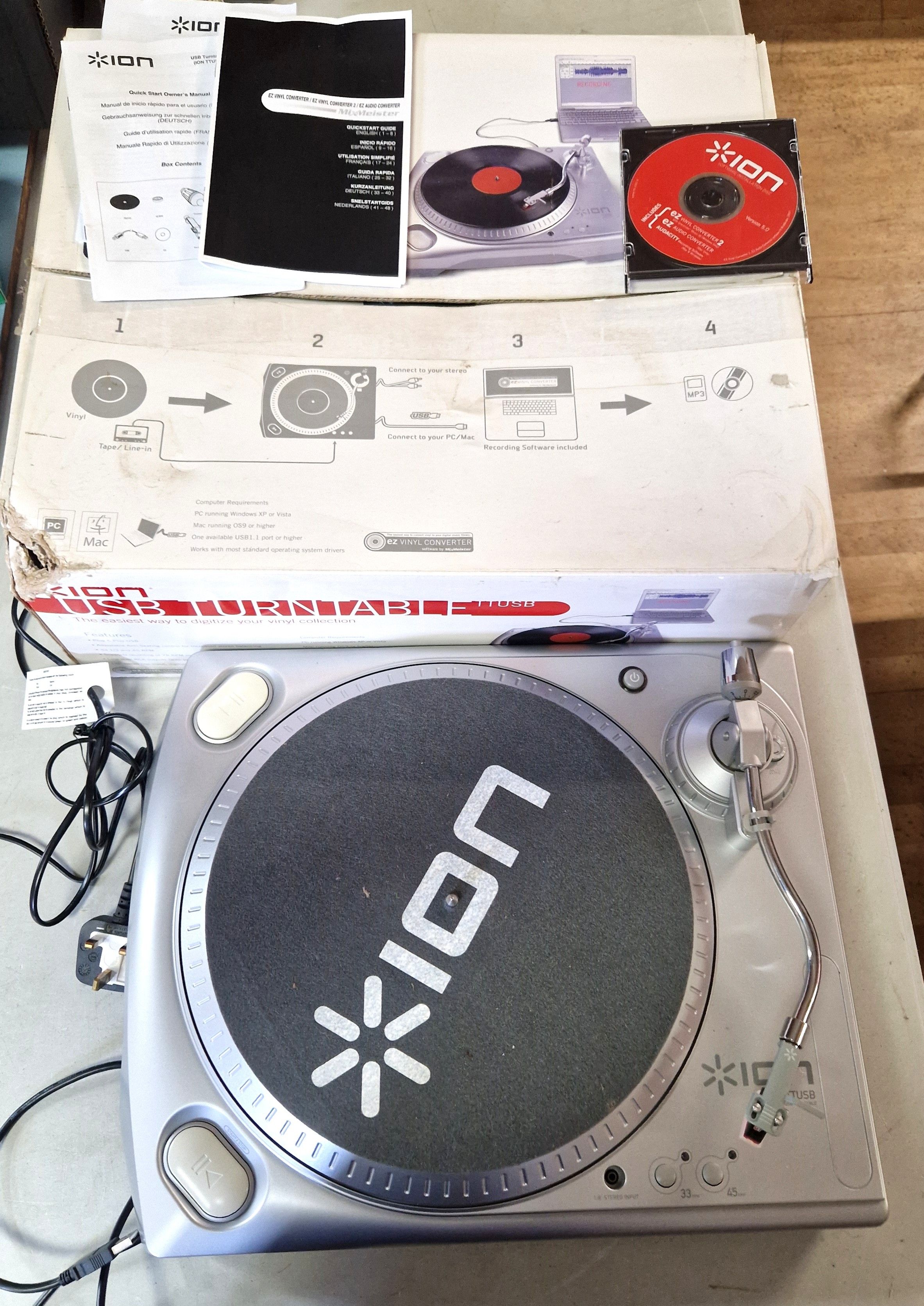 ION USB TURNTABLE . Connect To Your Computer. Instructions CD Etc (Original Box) (Please Note This Lot WILL NOT BE PACKED OR SHIPPED.....COLLECT ONLY !!!!)