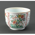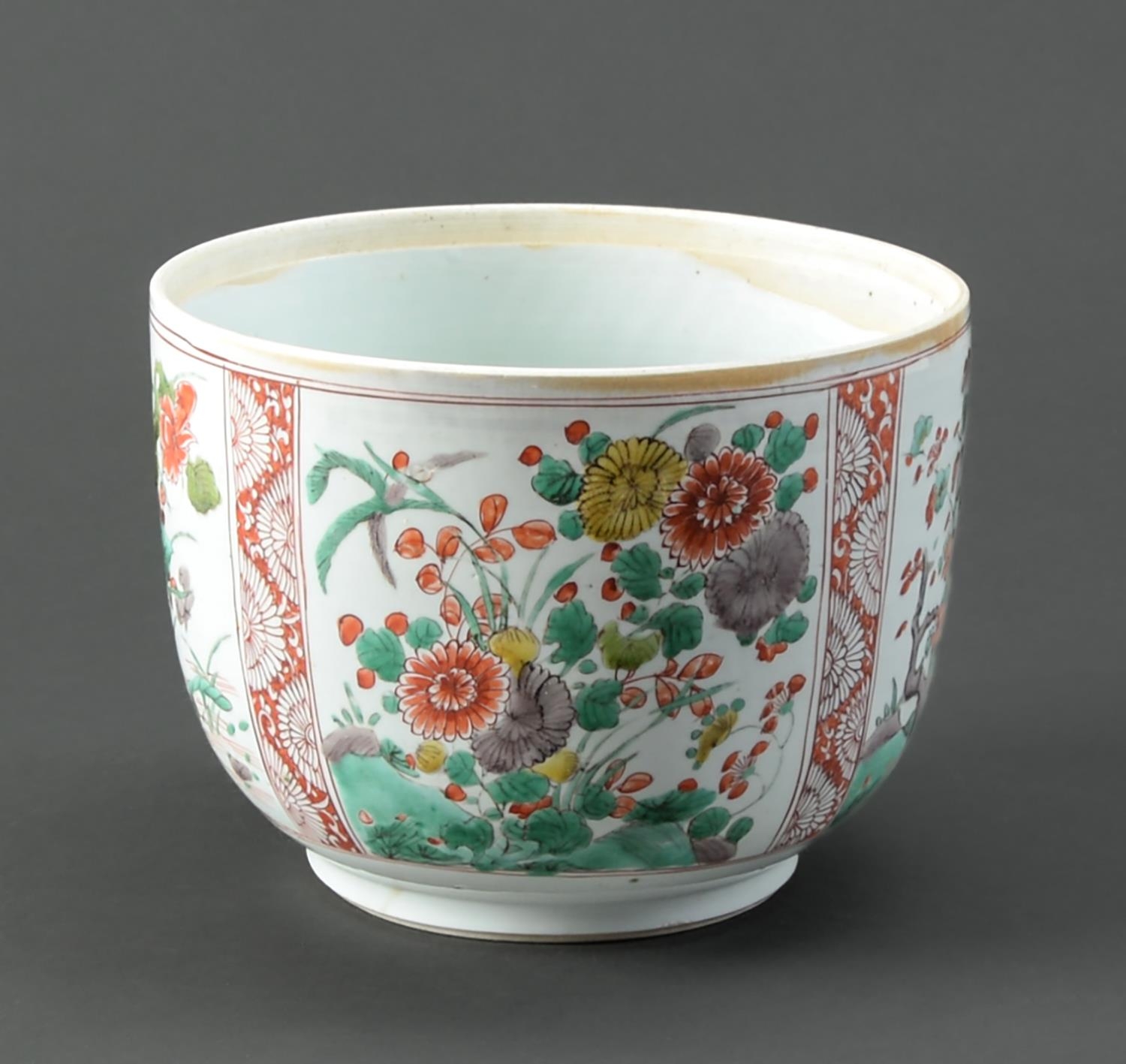 A Chinese famille verte bowl, Qing dynasty, 19th c, painted with four panels of flowering plants, 16cm h, underglaze blue concentric circles