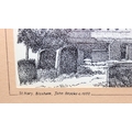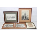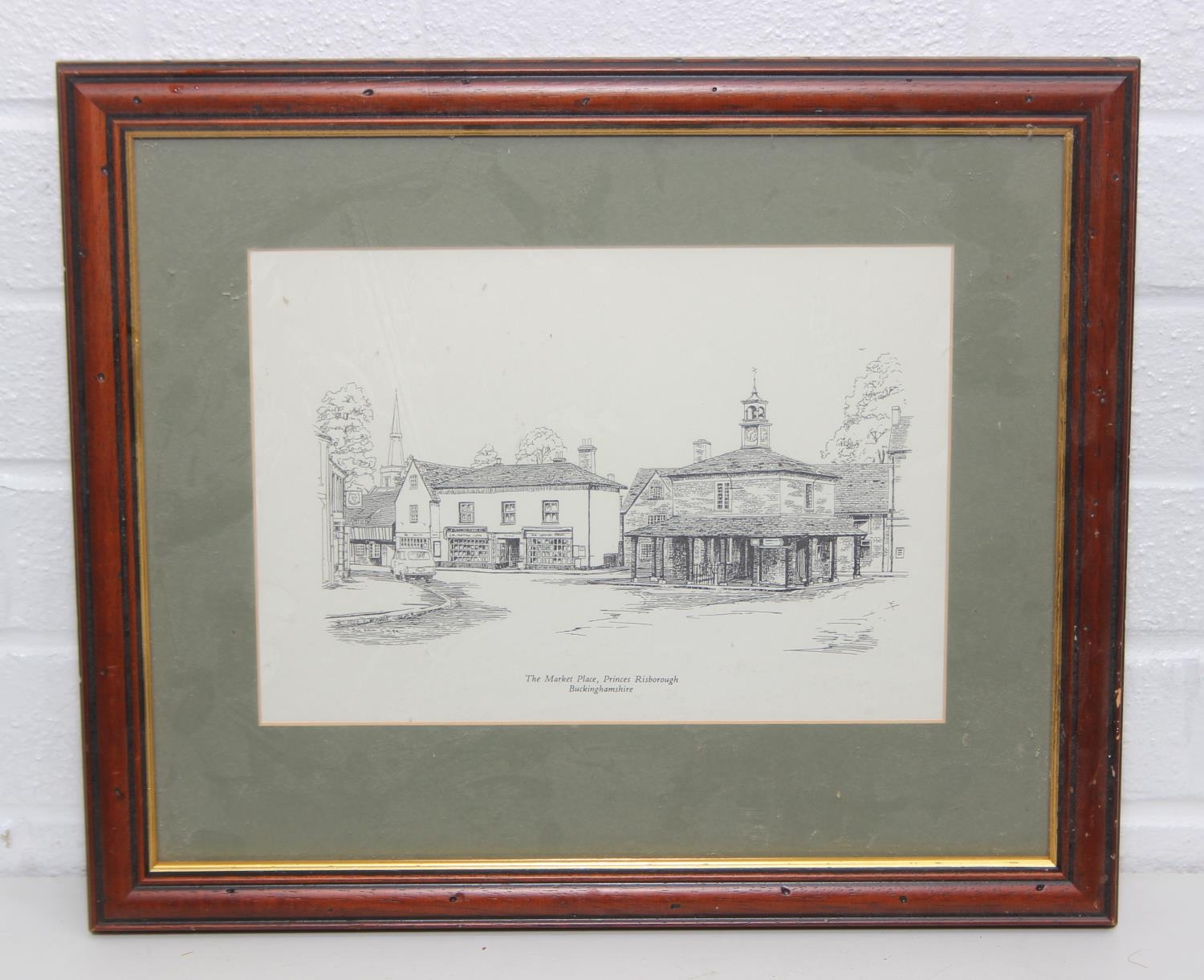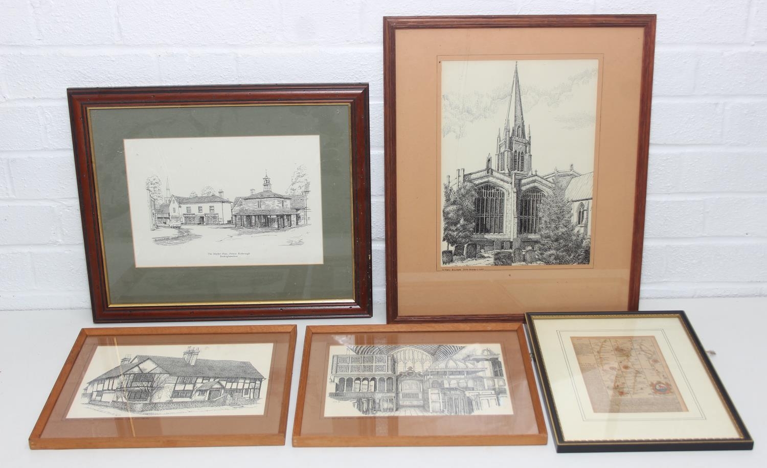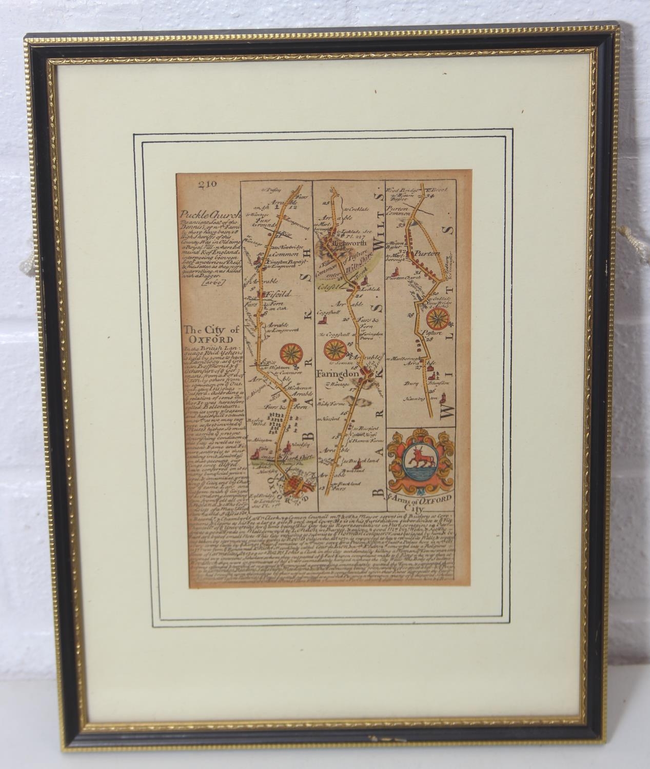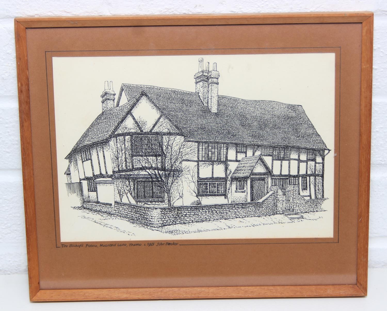 A 17th century strip map of the city of Oxford from Wiltshire by Emmanuel Bowen, and three assorted mid-century ink drawing of old buildings, some of Thame and other local areas, and a Princes Risborough print, the largest 46cm x 38cm [5]