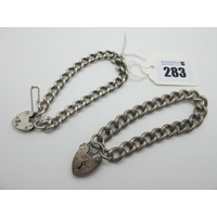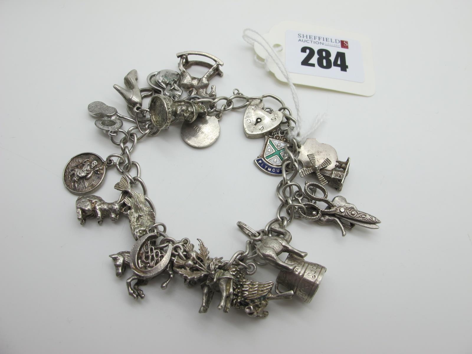 A Curb Link Charm Bracelet, to a heart shape padlock style clasp (stamped "Silver"), suspending numerous assorted novelty charm pendants.