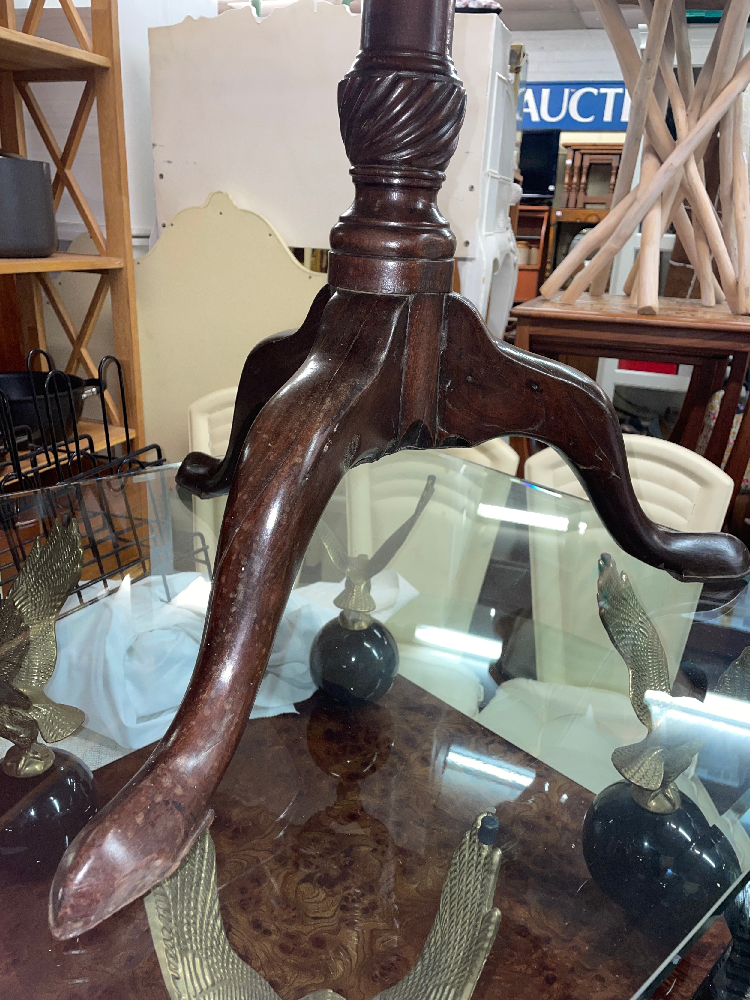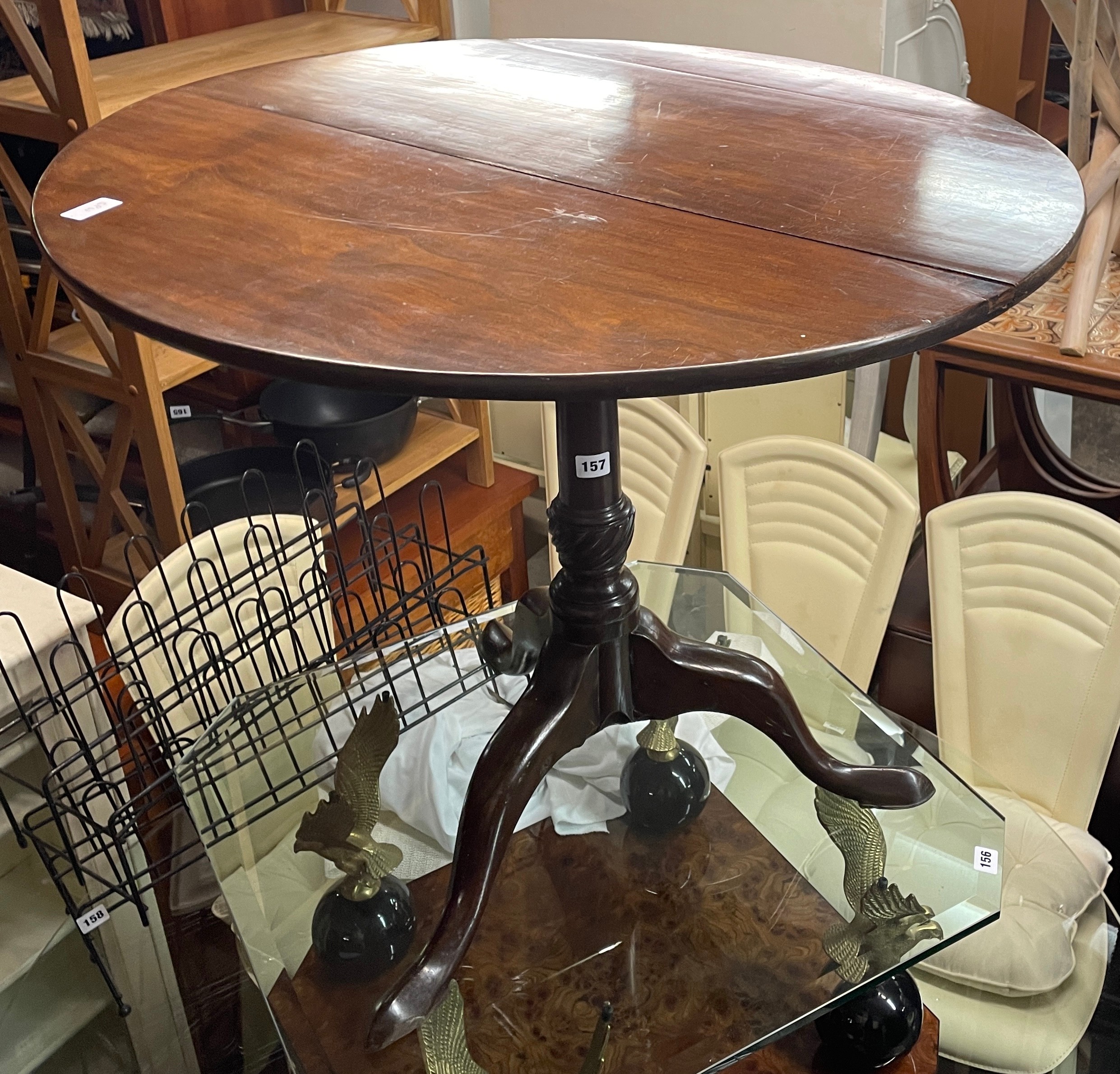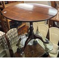 GEORGE III MAHOGANY TILT TOP TRIPOD TABLE ON BIRD CAGE WITH WRYTHEN BULBOUS GUN BARREL COLUMN