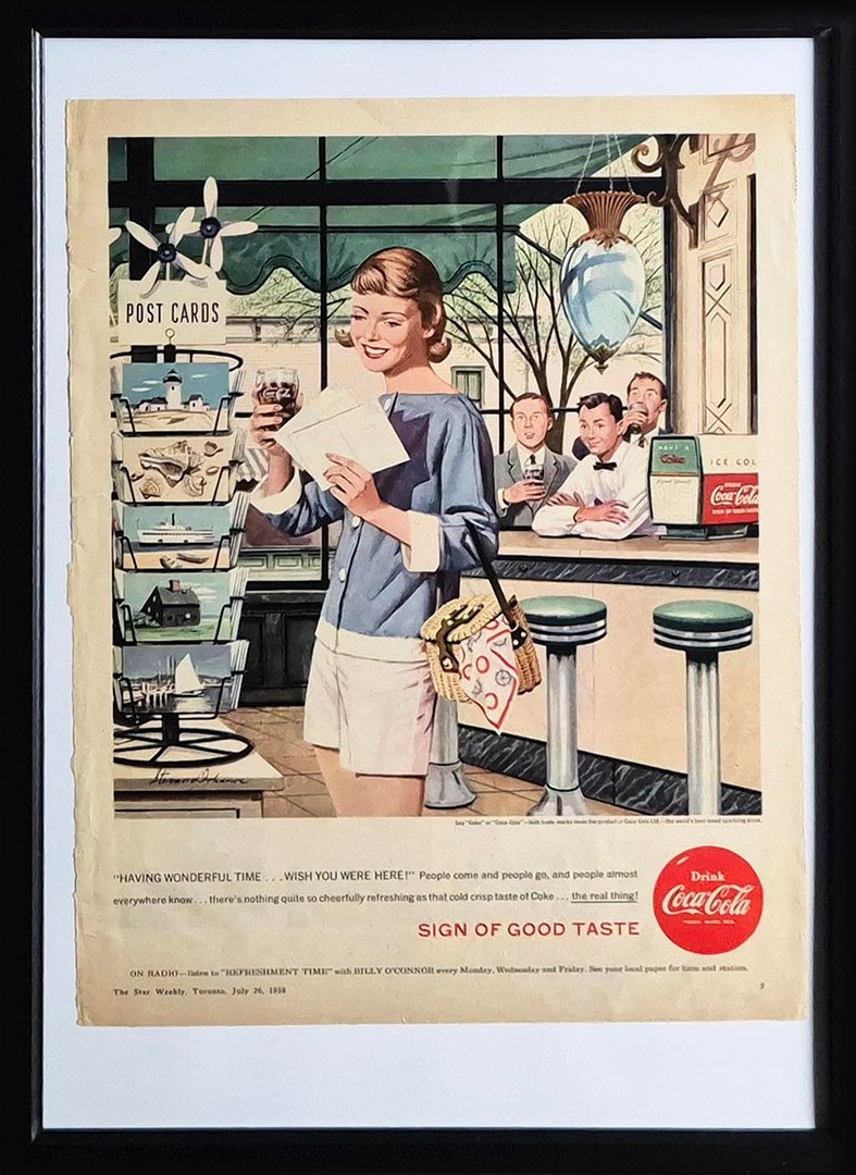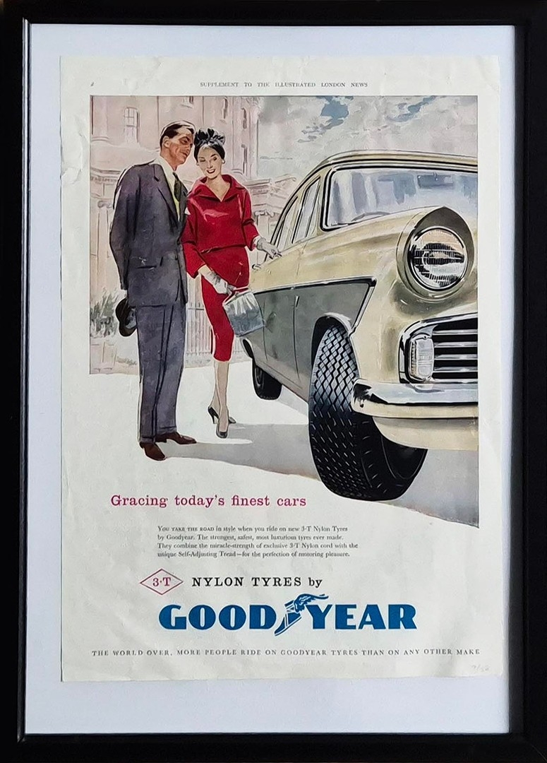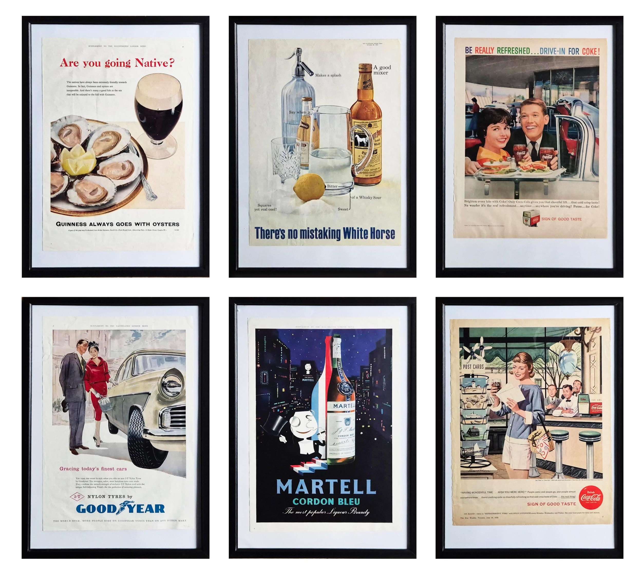 SIX VINTAGE ADVERTISING POSTERS (6). A set of six vintage American advertising posters, 1950s and 60s. Featuring brands such as Good Year, Guinness, and Coca-Cola, among others. Framed, each 44.5cm x 32cm.
