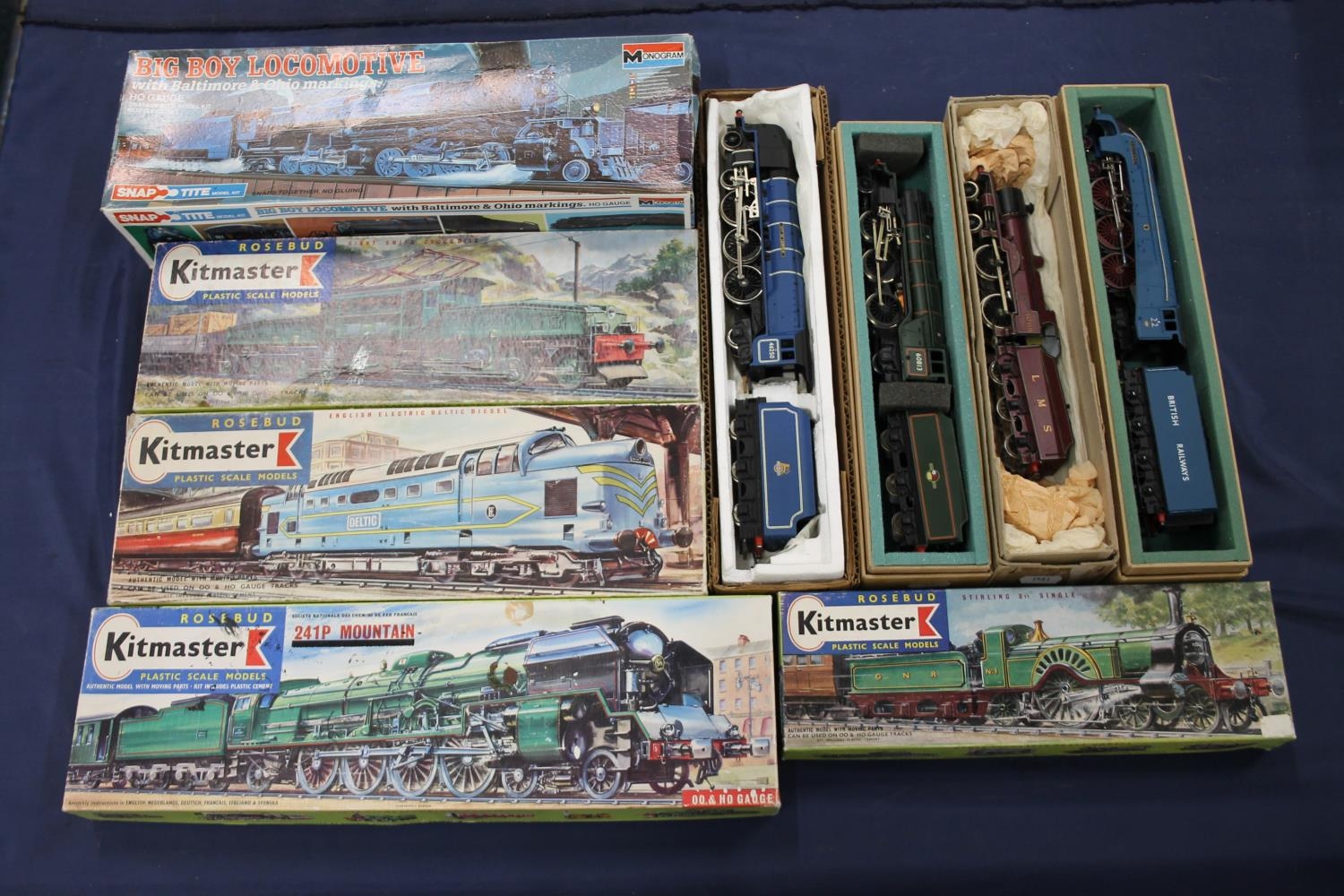 Kitmaster Rosebud OO gauge model railway kit number 9 4-2-2 Stirling tender locomotive boxed. Monogram Big Boy locomotive boxed. Hornby 4-6-2 Mallard tender locomotive 22E BR blue. Metal kit built tender locomotive 1088 LMS maroon. Metal kit built 2-6-2 tender locomotive 60813 BR green. 4-6-2 City of Lichfield tender locomotive 46250 BR blue. Model railway accessories held in Kitmaster boxes. (9)