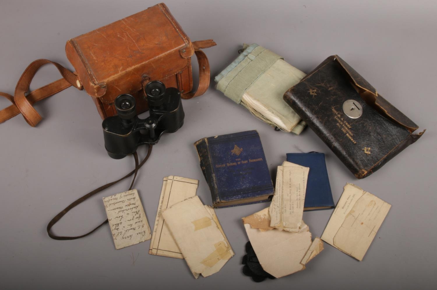 A pair of vintage binoculars in associated leather case, along with a Masonic leather wallet including a sash two Masonic books and quantity of ephemera.
