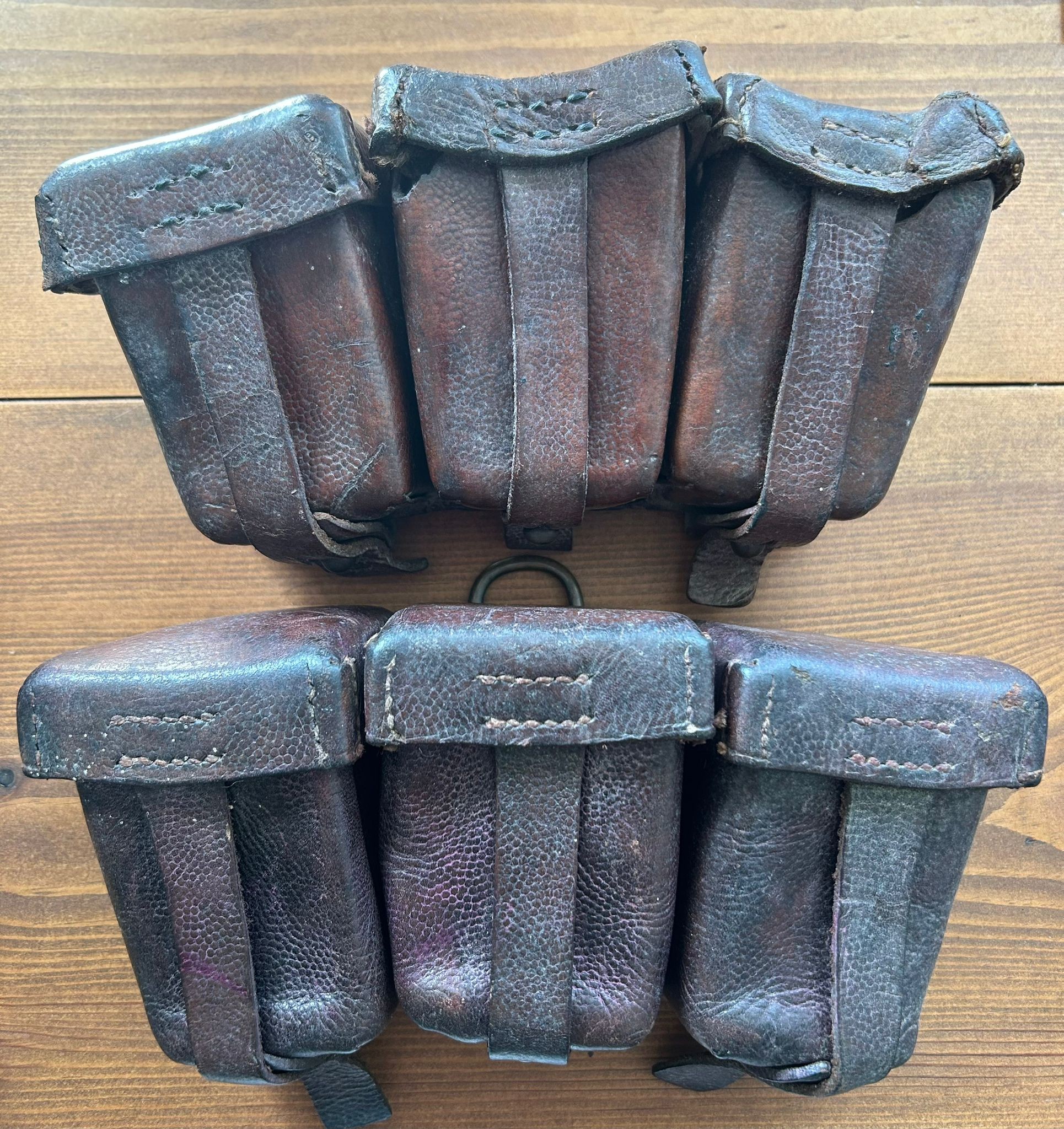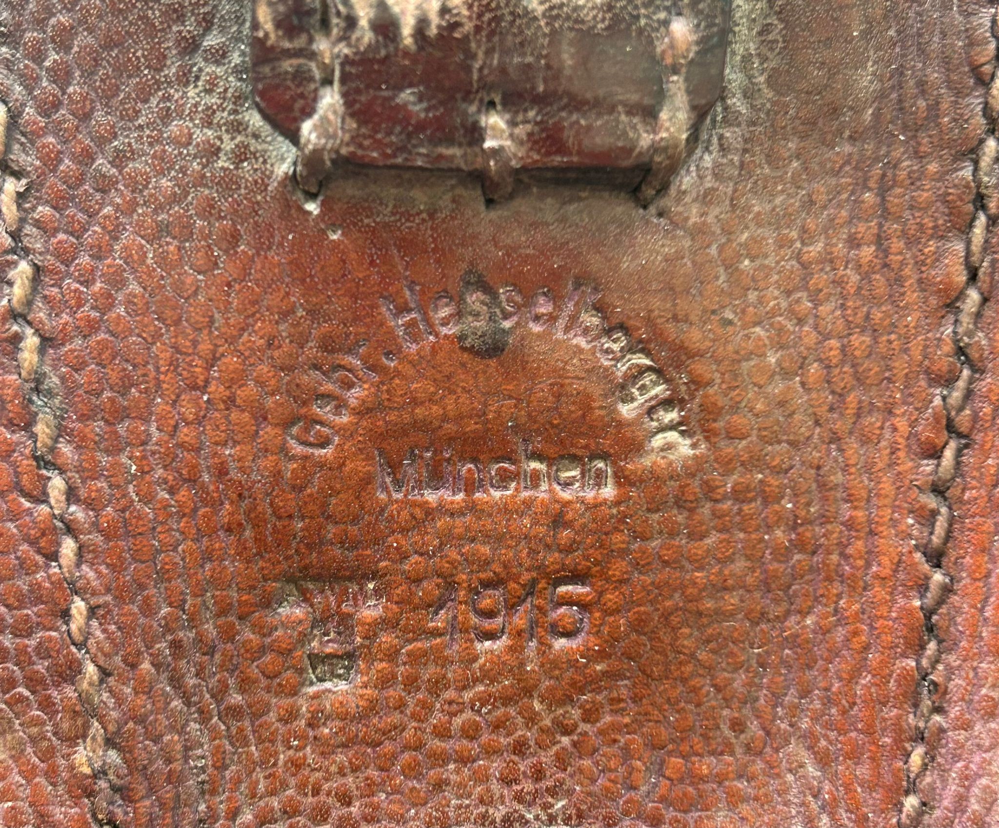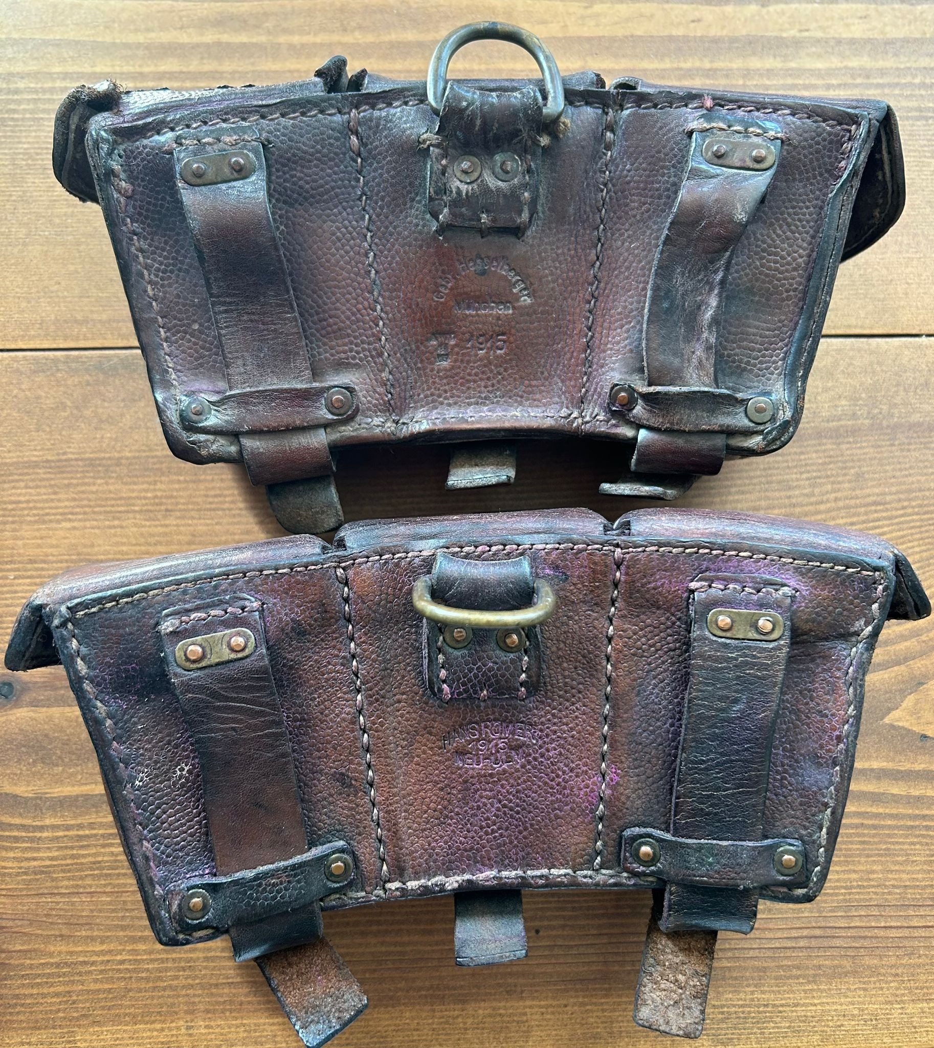 A nice pair of German WW2 ammunition pouches, not matching but both dated 1915. Makers are Hesselberger and Hans Romer. Good condition