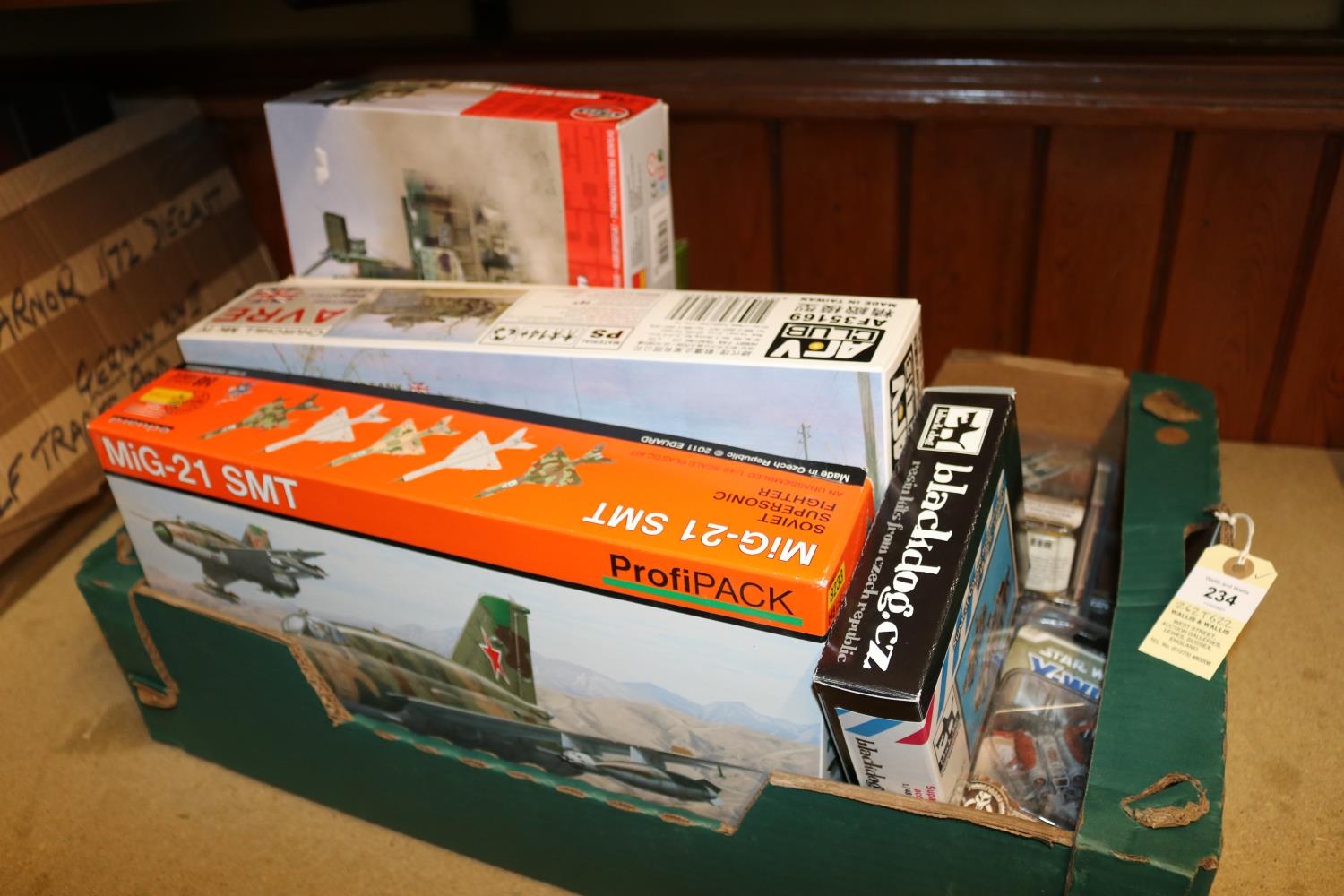 13+ military and wargaming related kits and models by various makes. Including 4x unmade plastic kits; Airfix 1:35 British M3 Stuart tank. Eduard 1:48 MiG-21 SMT aircraft. Arov Club 1:35 Churchill Mk.IV British Infantry tank. Plastic Soldier 1:72 German Panzer III set. Together with 3x magazie issue tanks; Jagdpanther, Sherman and Challenger. 2x white metal kitbuilt medieval soldiers. 2x Star Wars X-Wing Miniatures Game vehicles, etc. VGC-Mint. £40-60