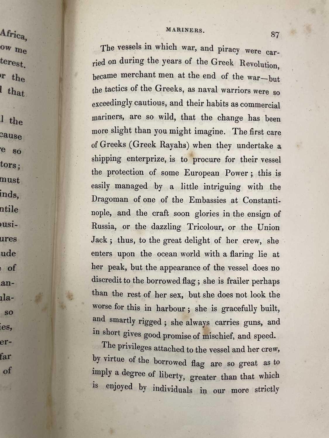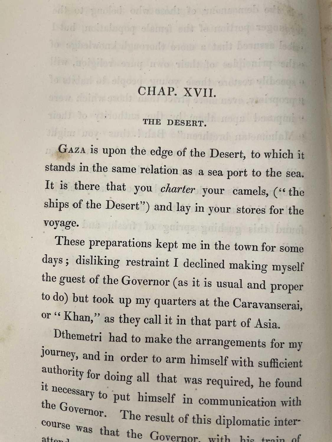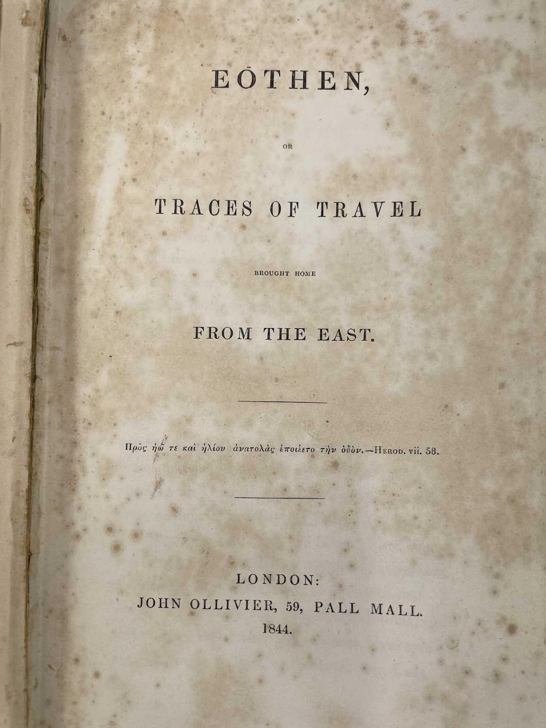 A. W. KINGLAKE. 'Eothen, or, Traces of Travel brought home from the East,' original green cloth with pictorial gilt board, rubbed and bumped, joints loosening, spotting throughout, John Olivier, London, 1844.