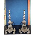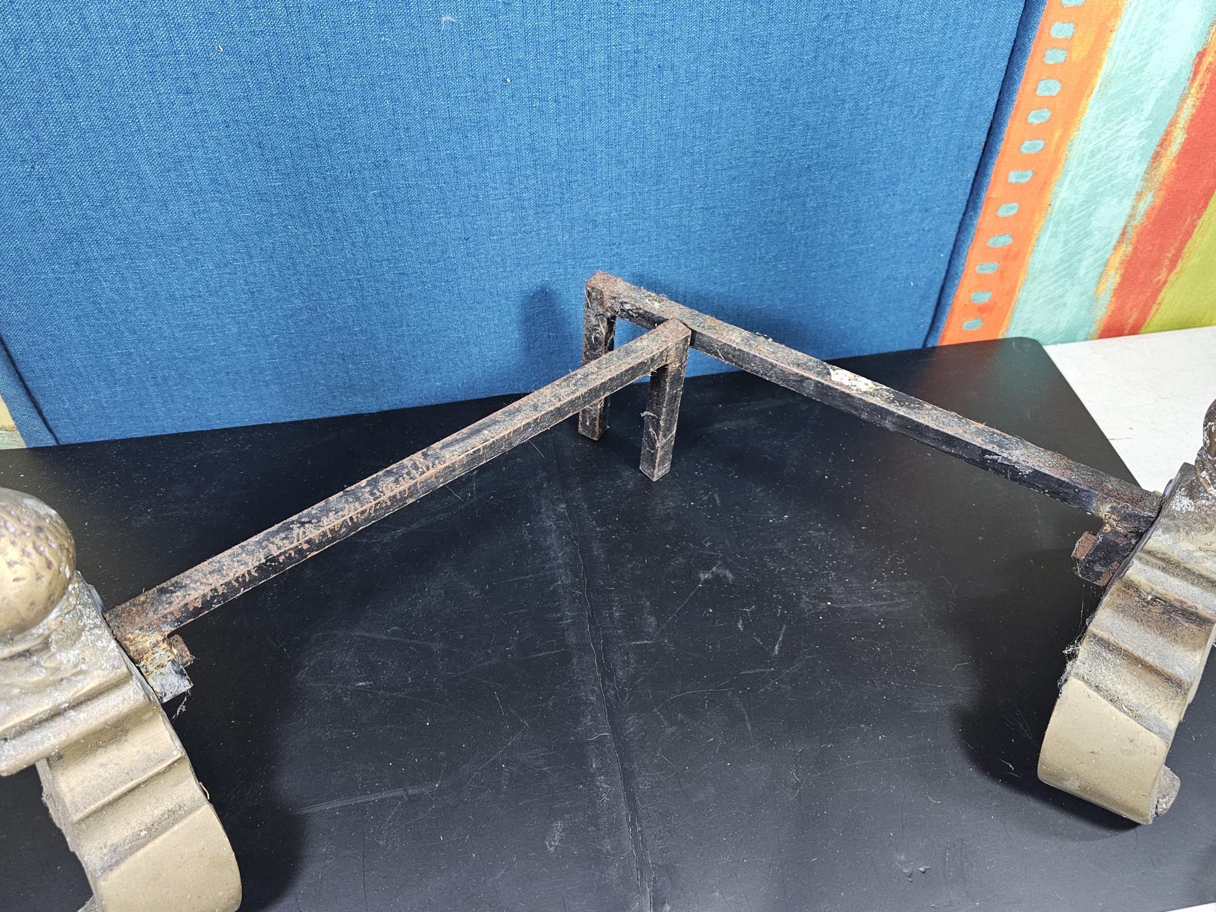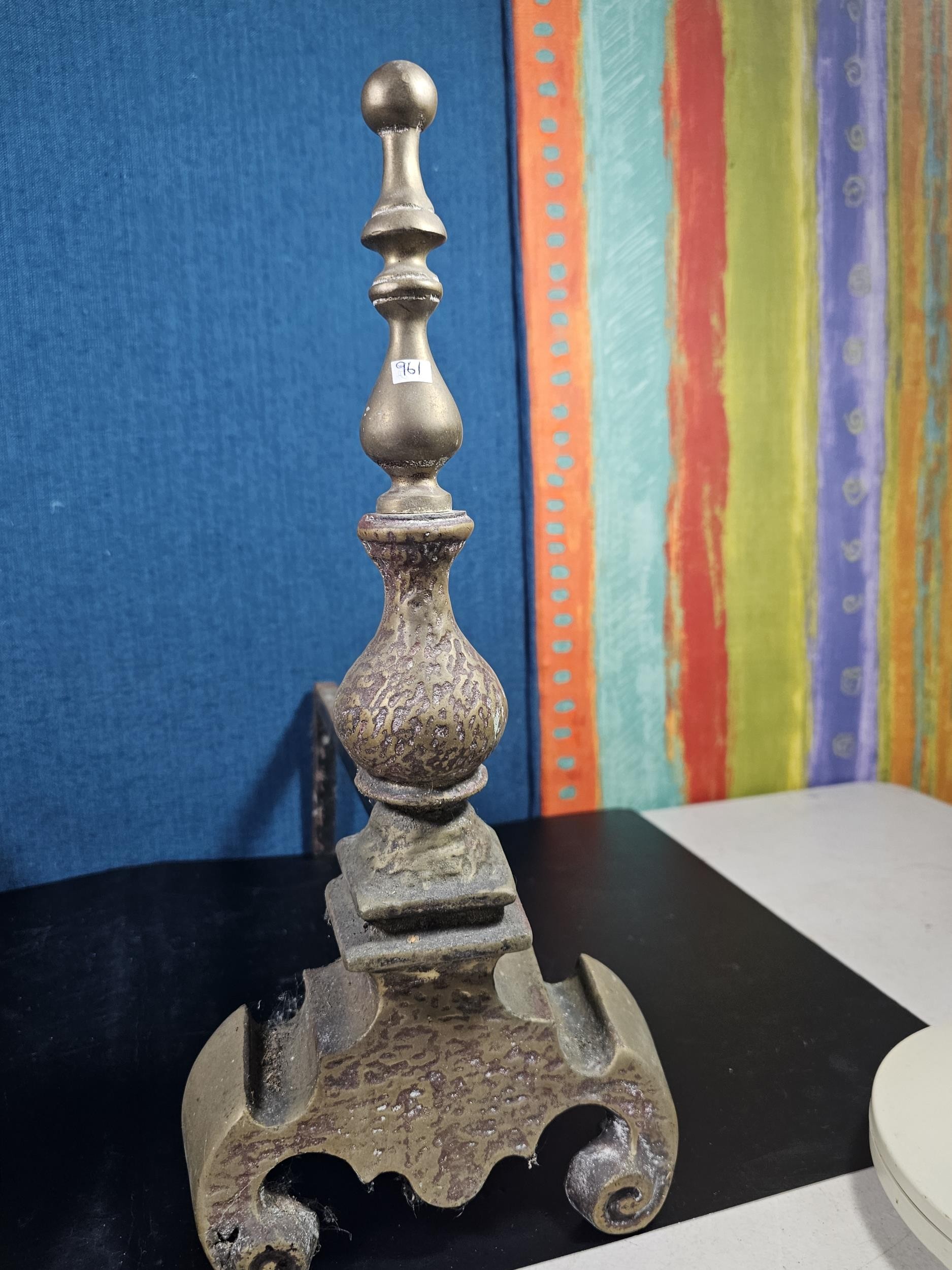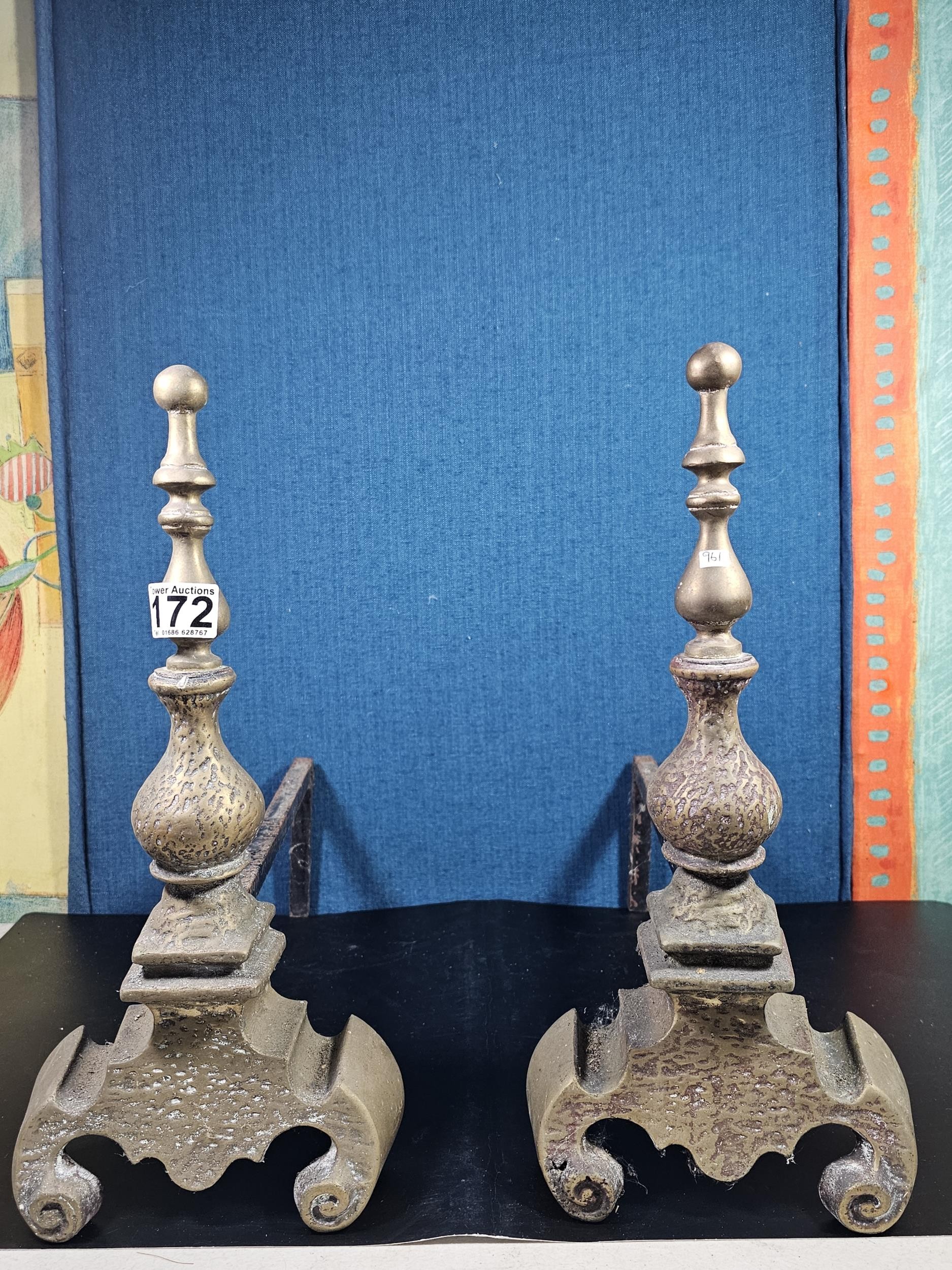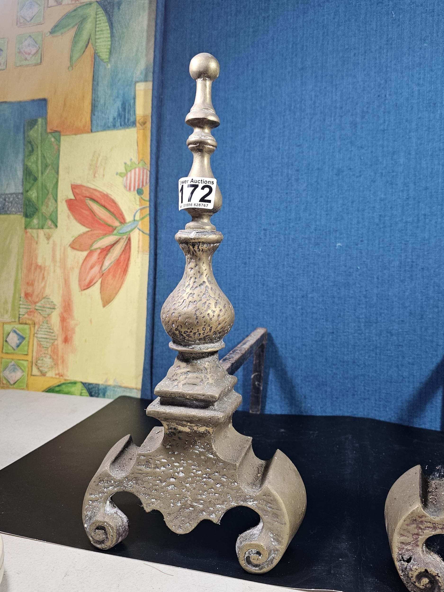 A pair of good quality antique cast iron fire dogs standing on scrolled feet with finial top, both in good order having a height of 40cm, a width of 18cm and a depth of 39cm.