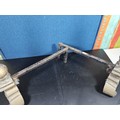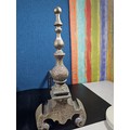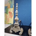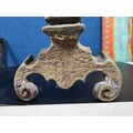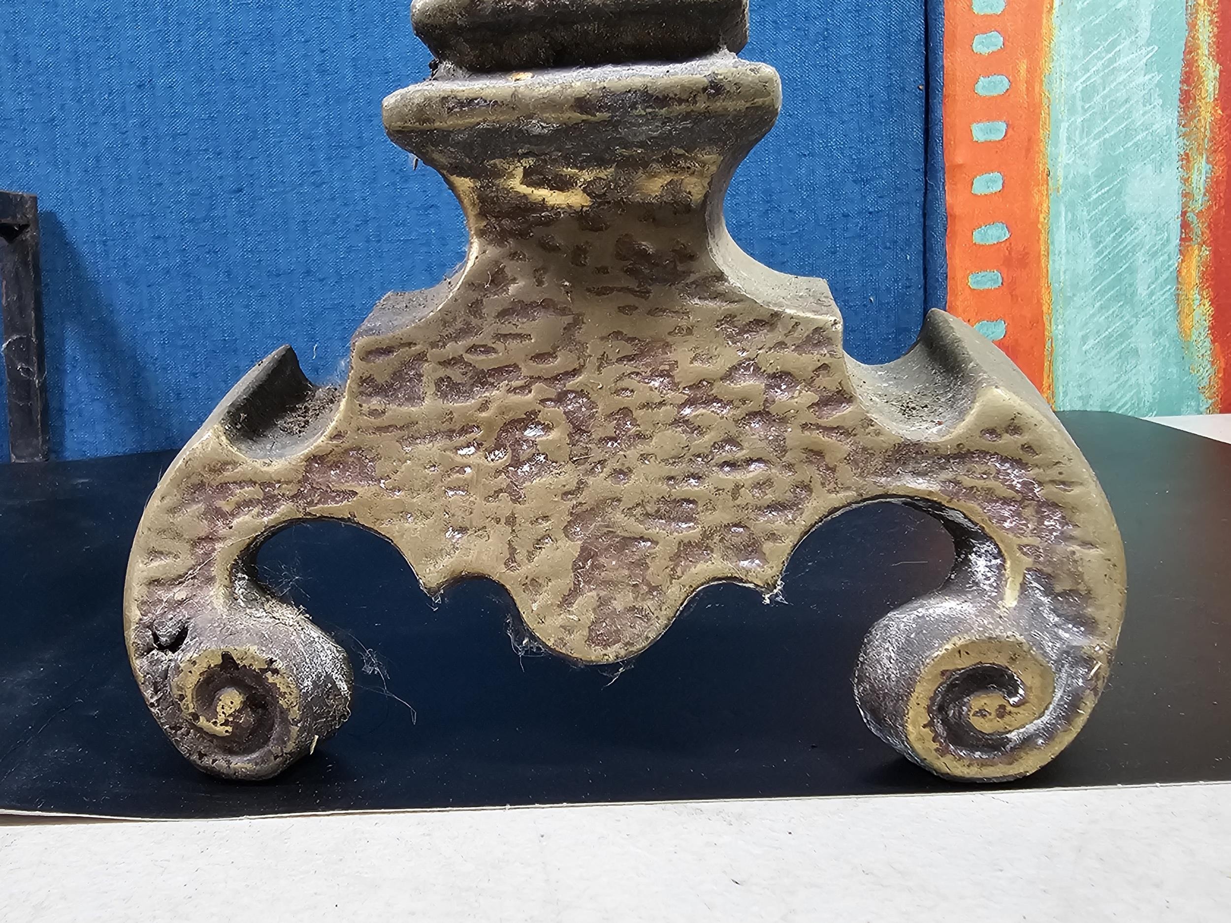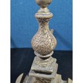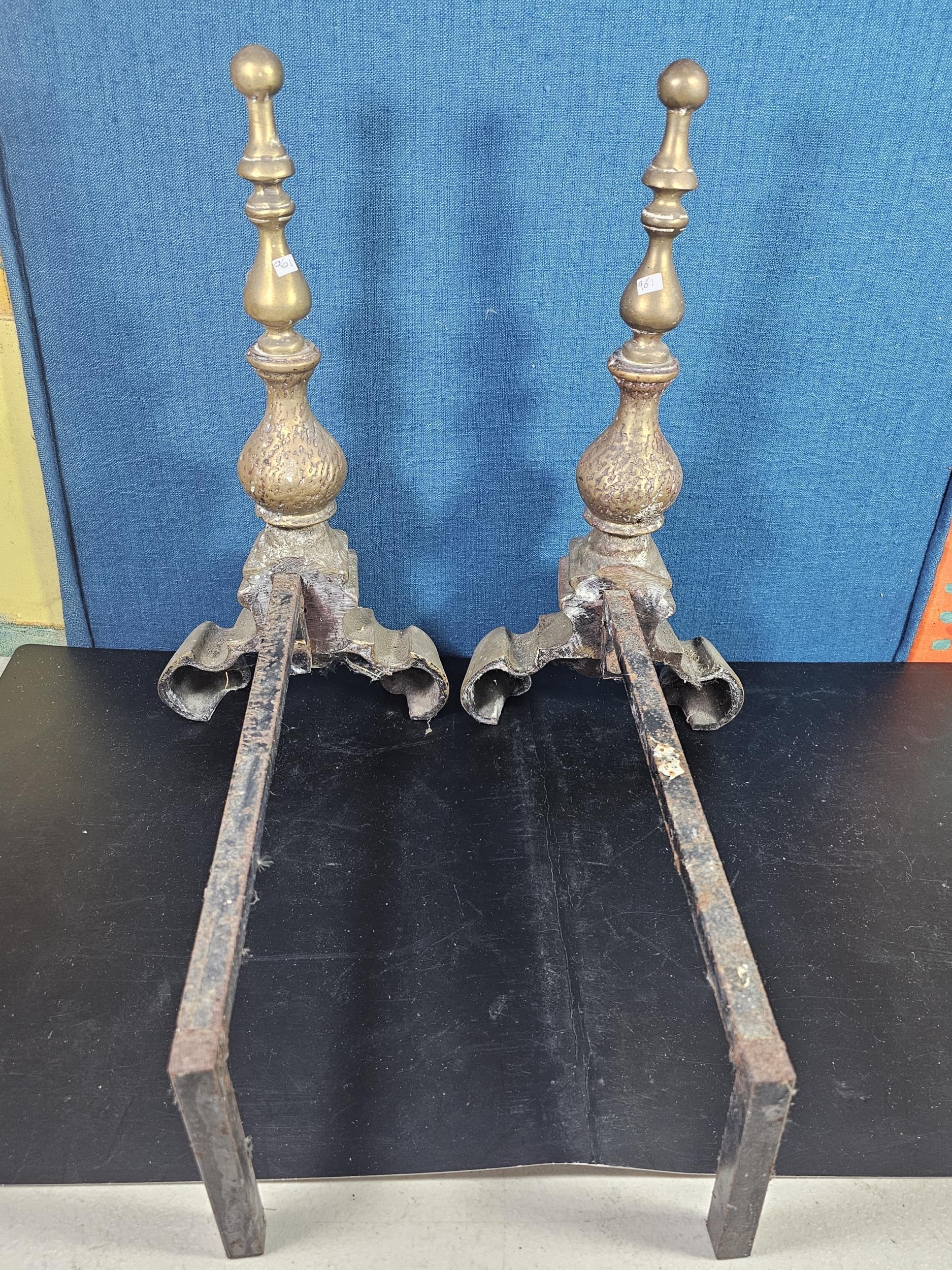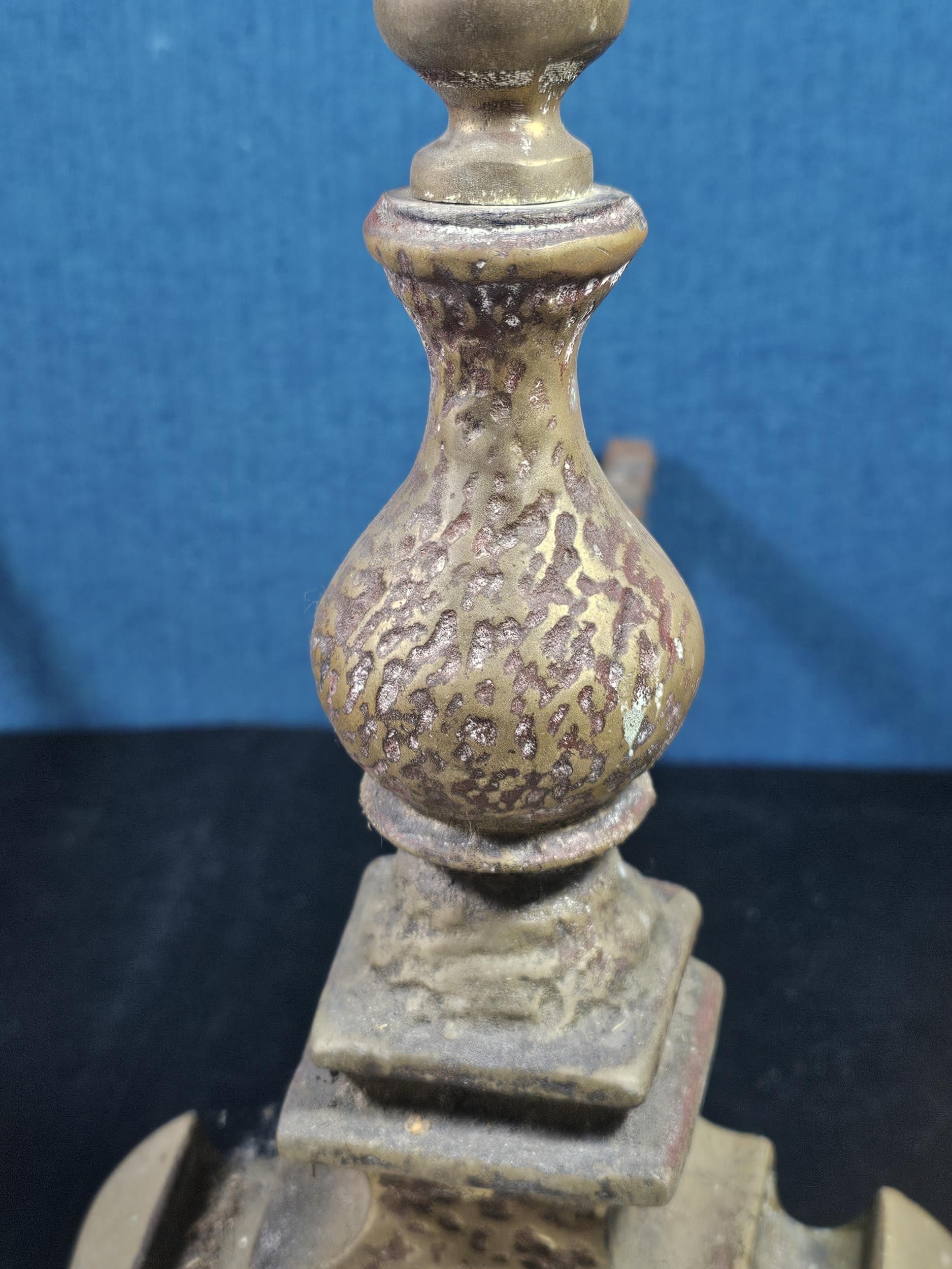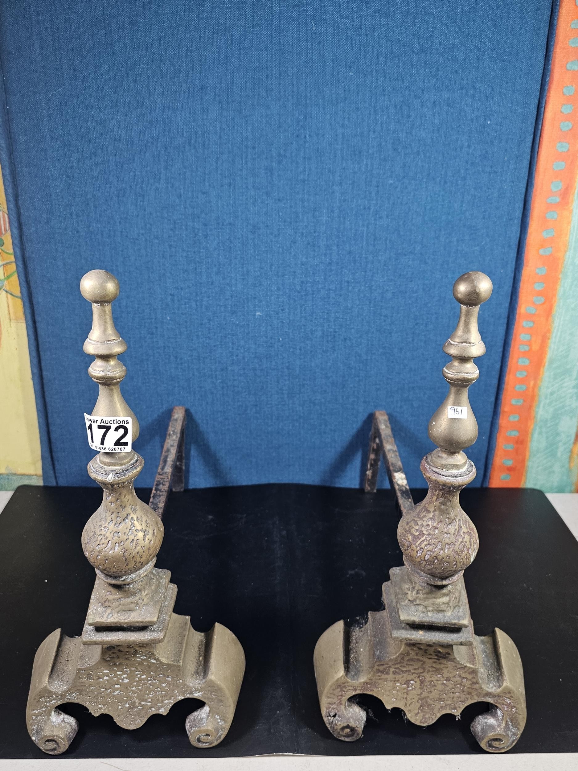 A pair of good quality antique cast iron fire dogs standing on scrolled feet with finial top, both in good order having a height of 40cm, a width of 18cm and a depth of 39cm.