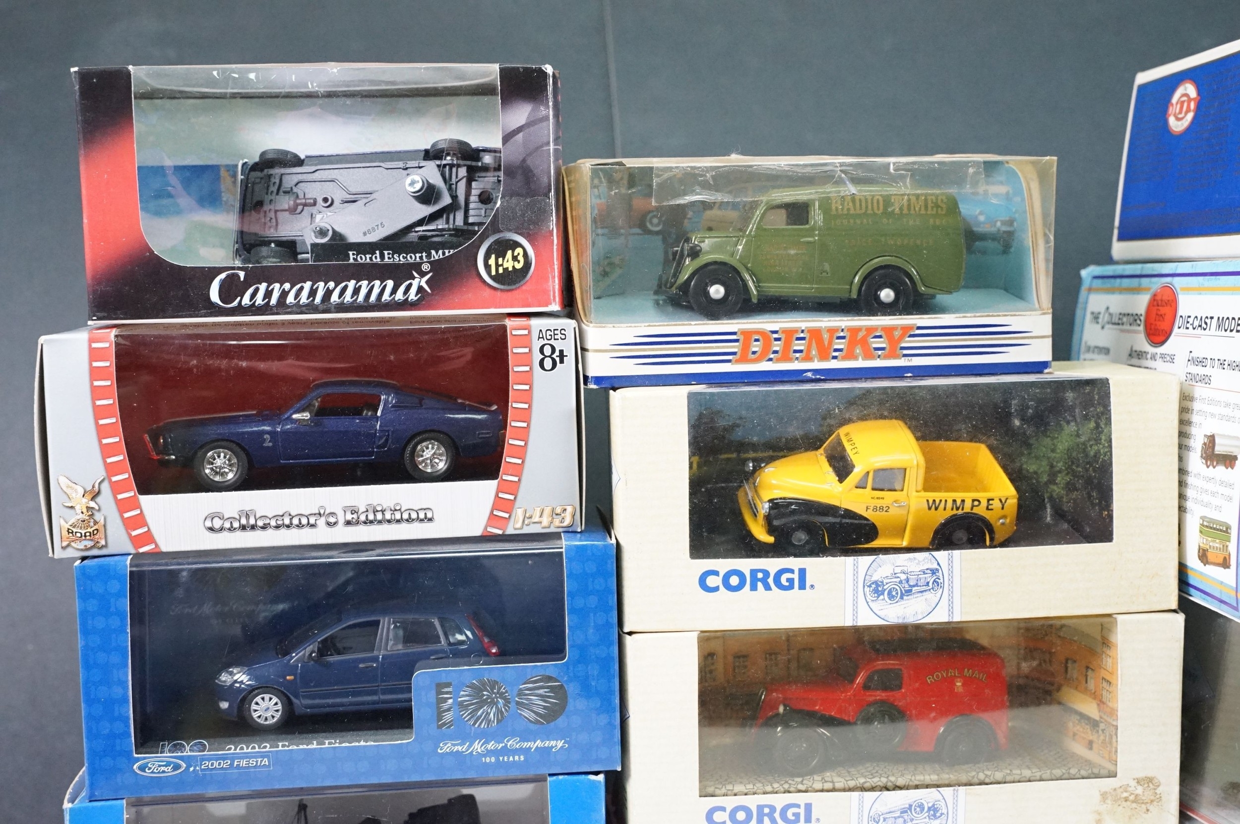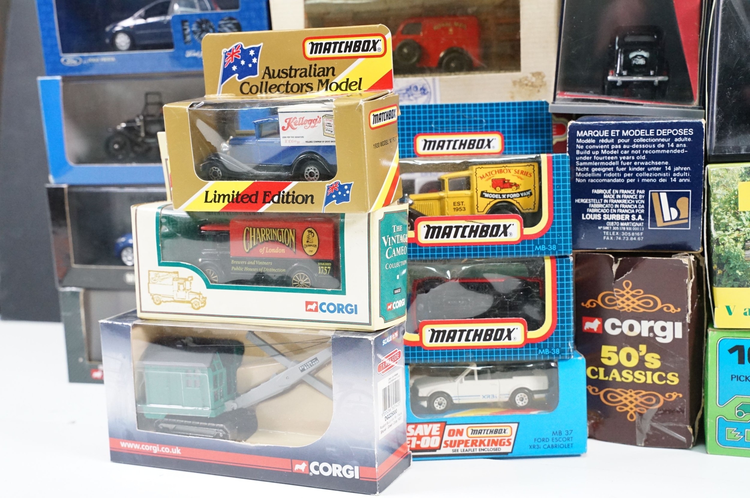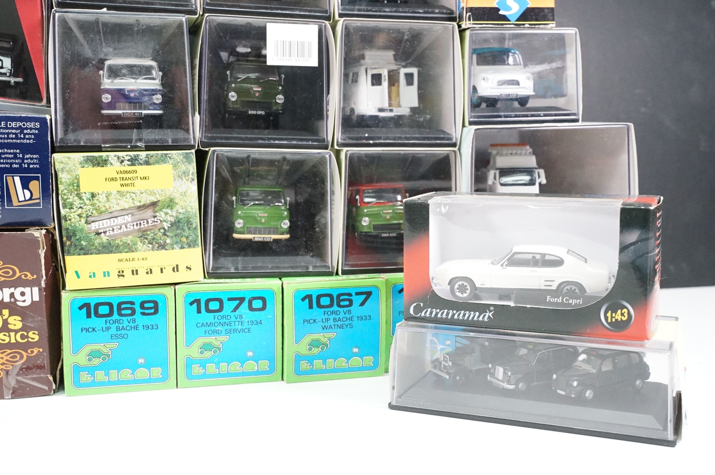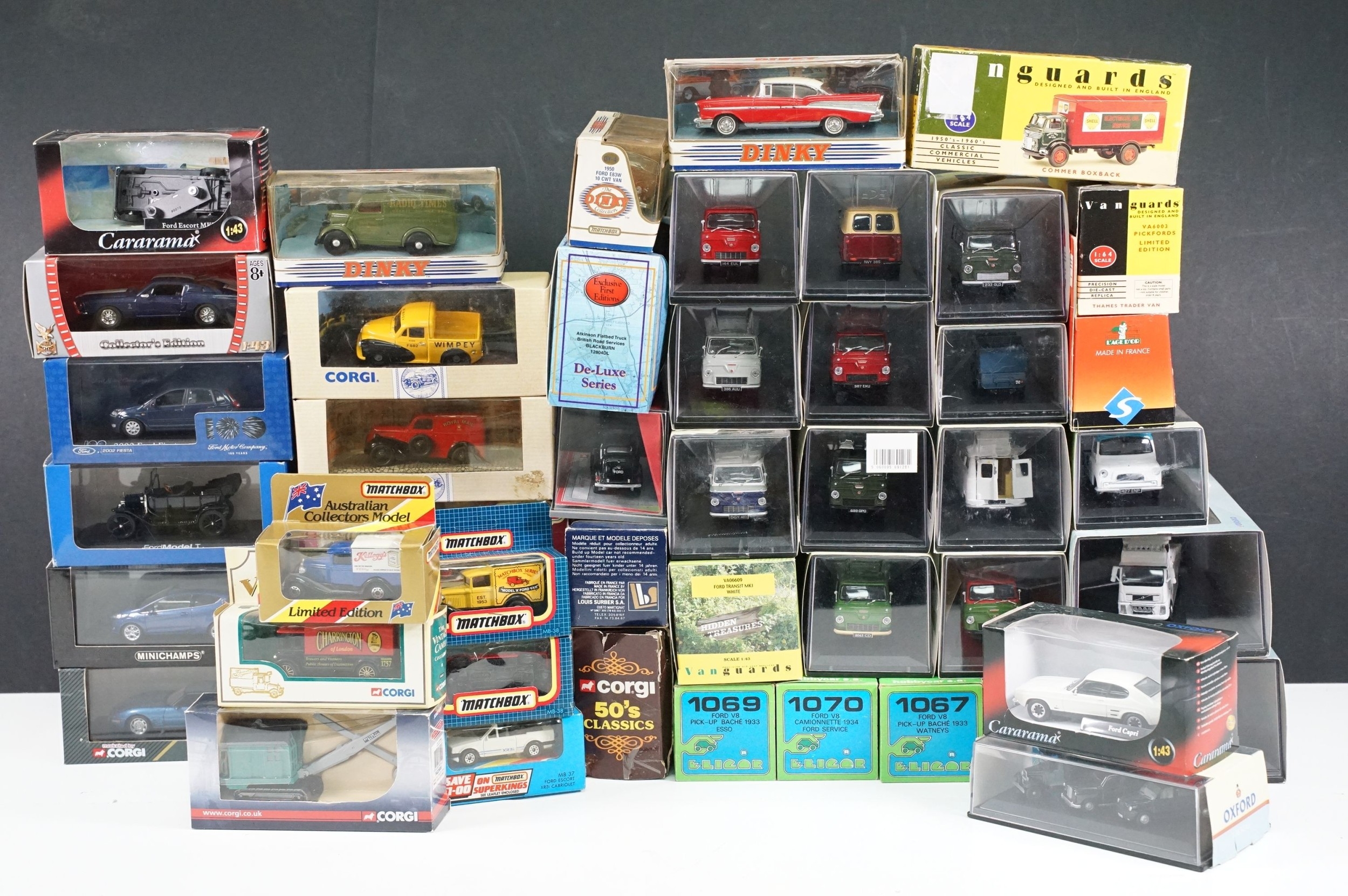 47 Boxed / cased diecast models to include 14 x Oxford Diecast models including Commercials and Haulage, 5 x Eligor models including 1069 Ford V8 Pick-Up, 1070 Ford V8 Camionette 1934, 1099 Ford V8 1934 Fourgon US Mail, etc, 3 x Vanguards, 4 x Matchbox MB models, Paul's Model Art Minichamps, Corgi Vehicles, Matchbox The Dinky Collection, Corgi Trackside, etc, all diecast ex, boxes / cases vg overall