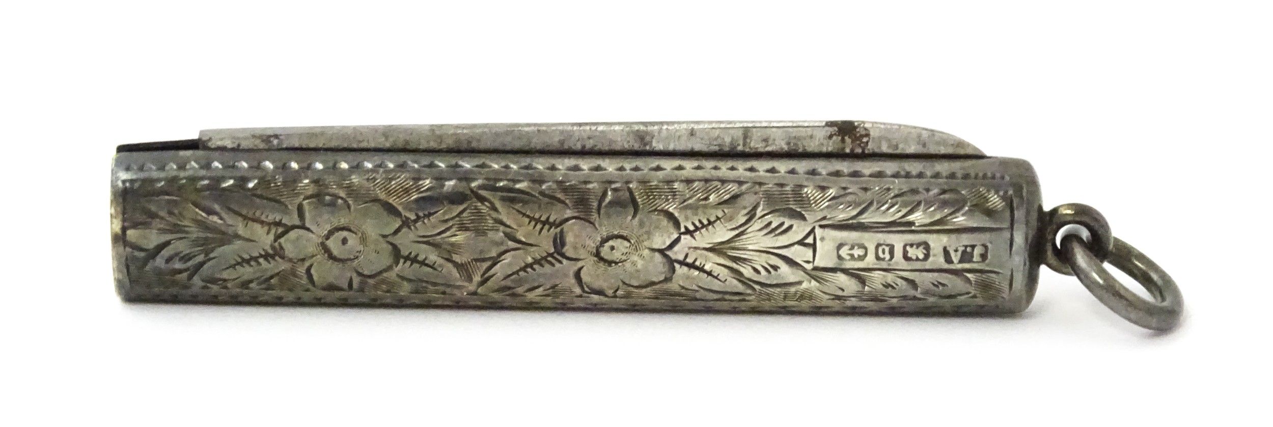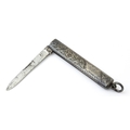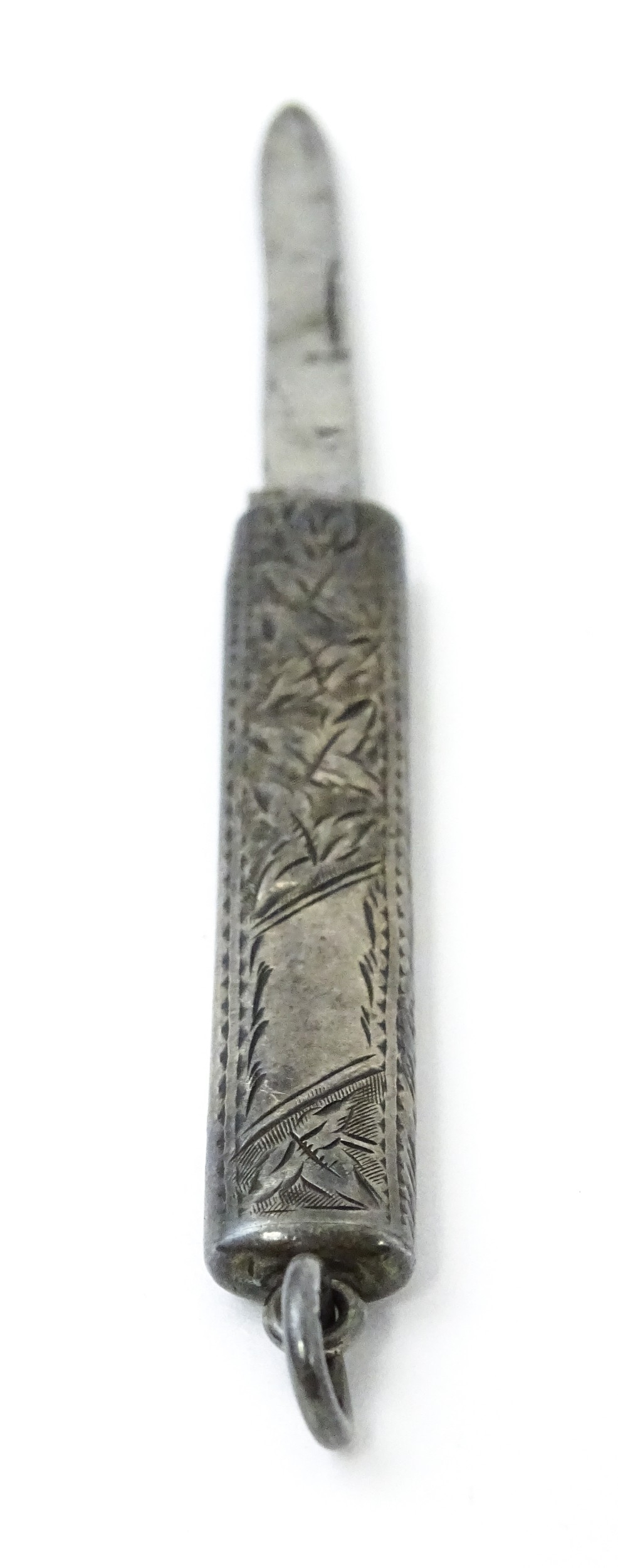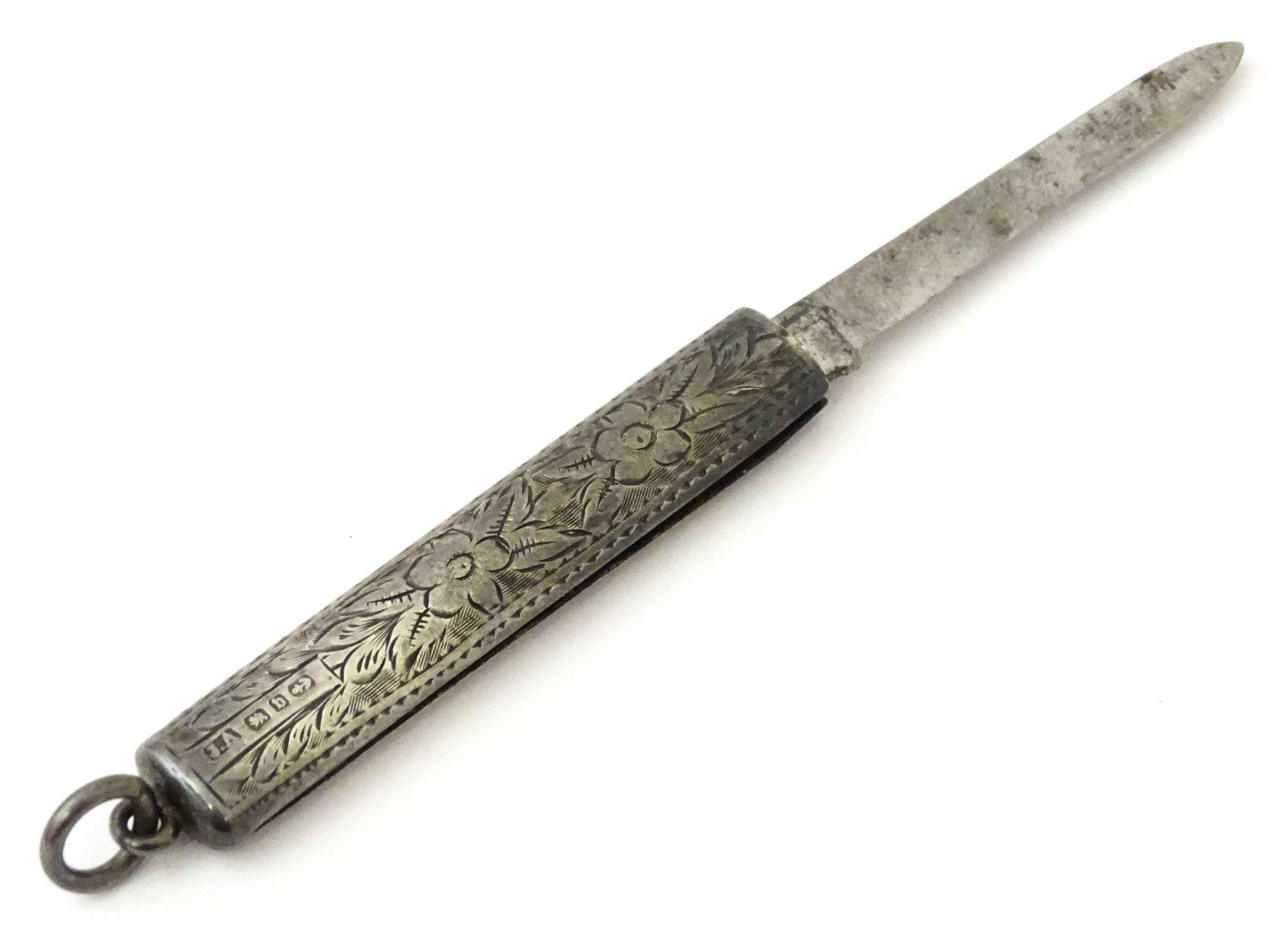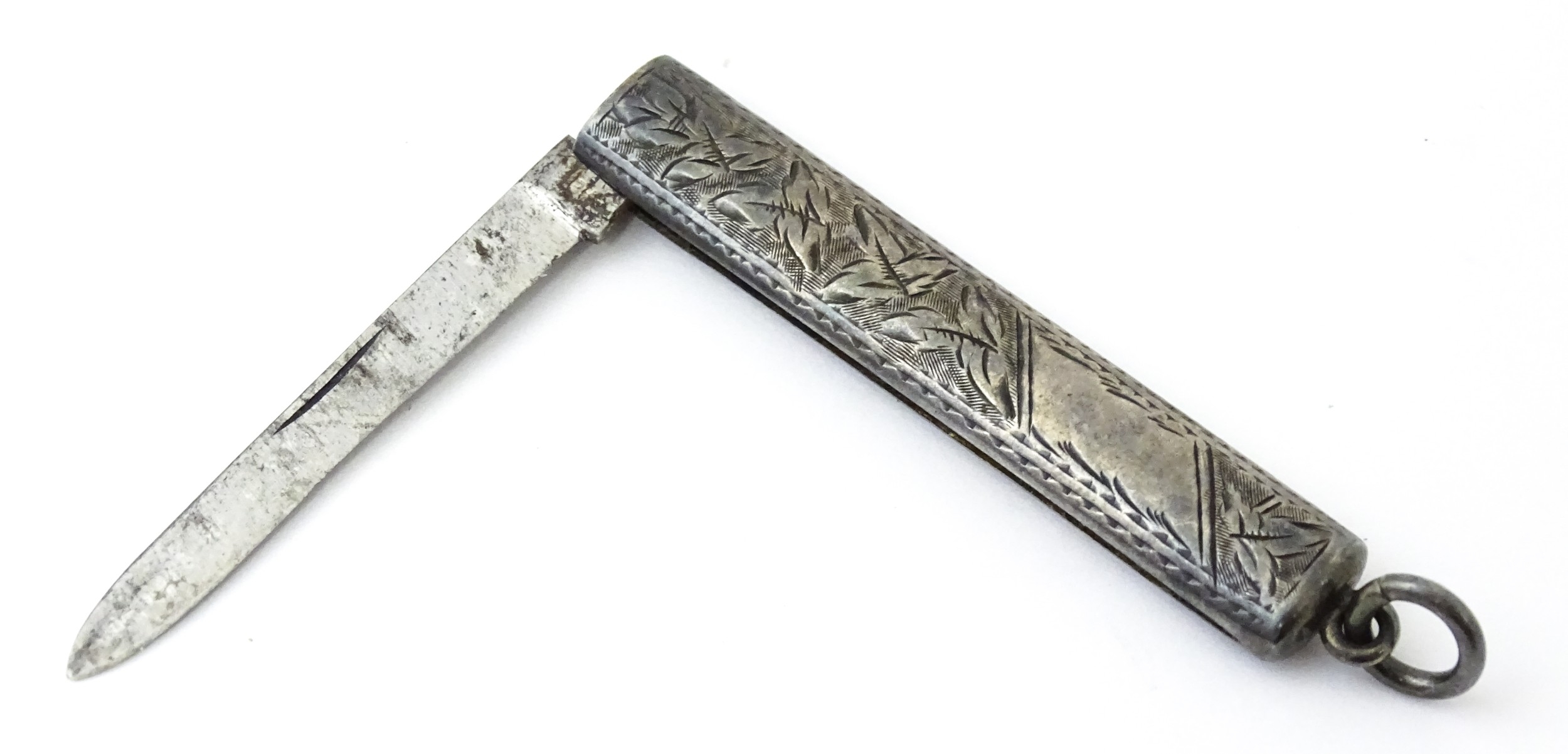 A Victorian silver handled folding knife, the handle with engraved floral and foliate detail and hallmarked Birmingham 1895 maker J.A. Approx 4" long overall.