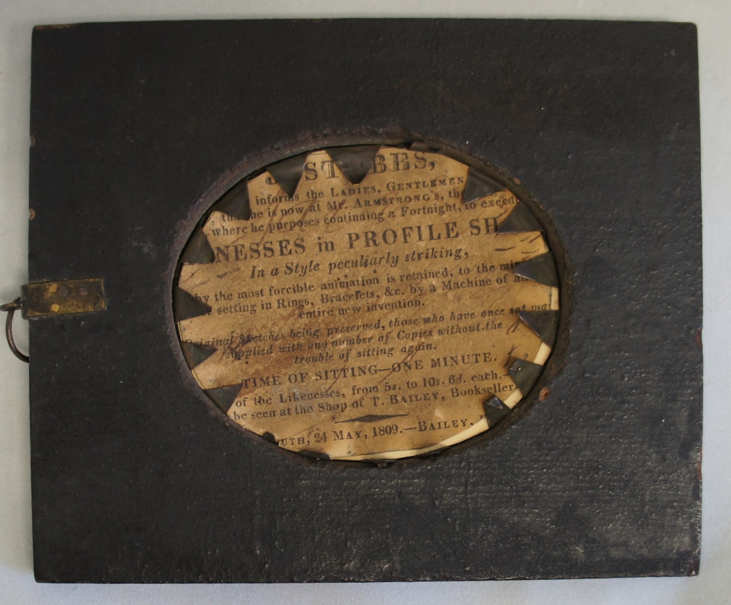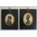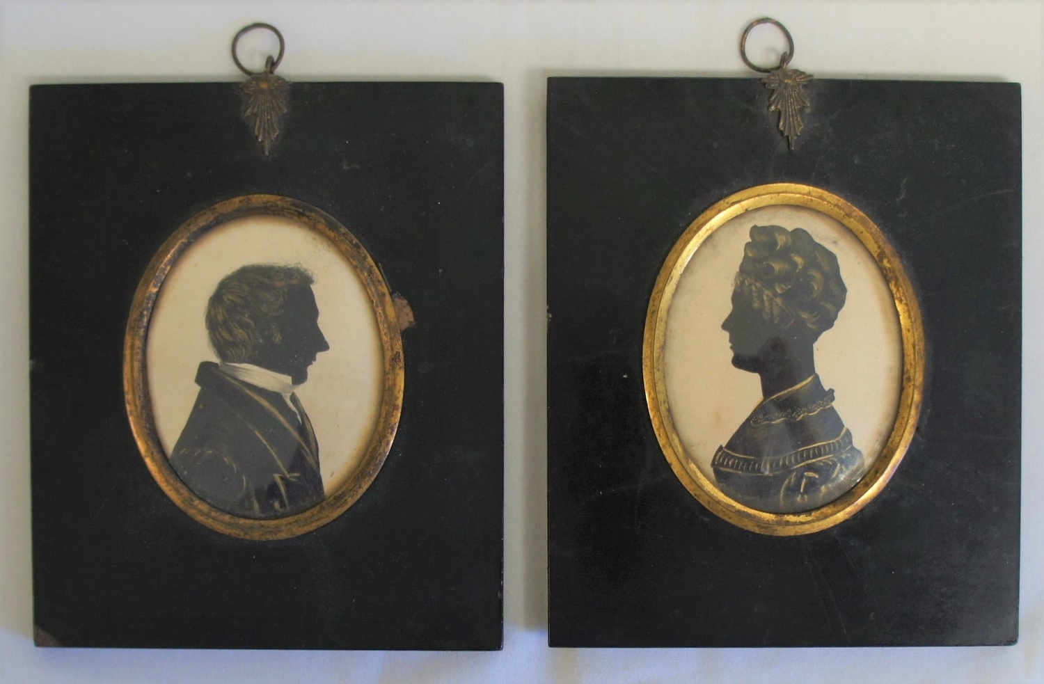 Pair framed silhouette portraits, a gentleman and a lady, painted in black ink on paper with gilt highlights, the reverse of gentleman with trade label for J.Stubbs, Time of sitting, one minute, 24th May 1809, 7.5 x 5.5 cm. (2).