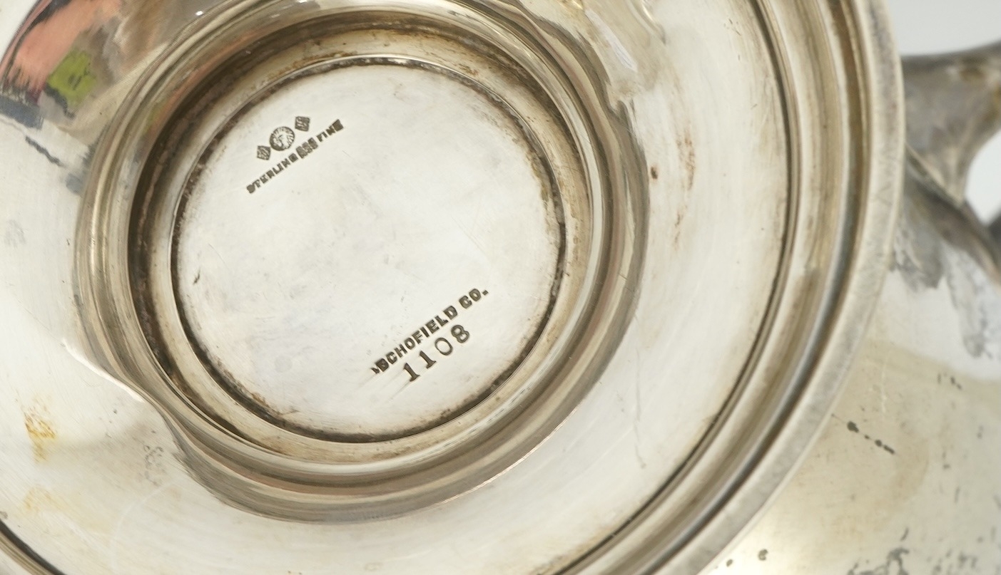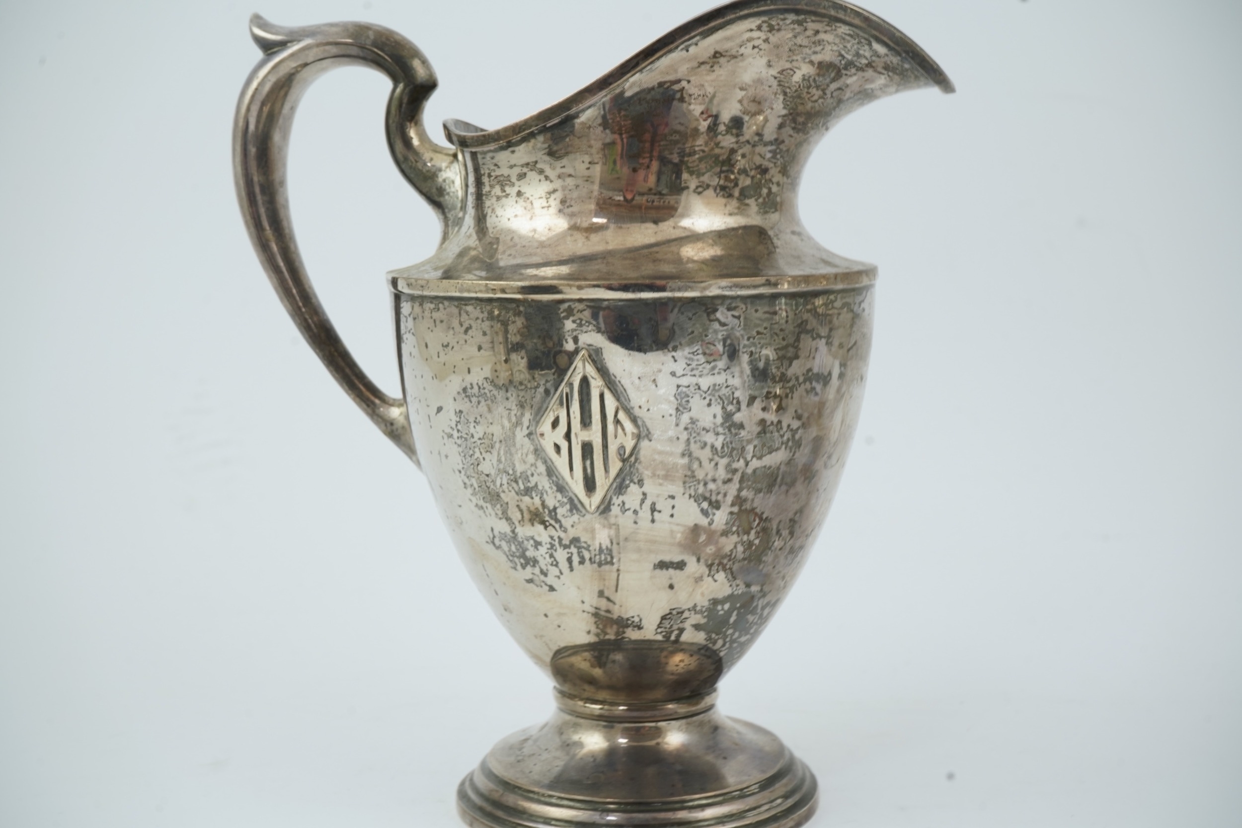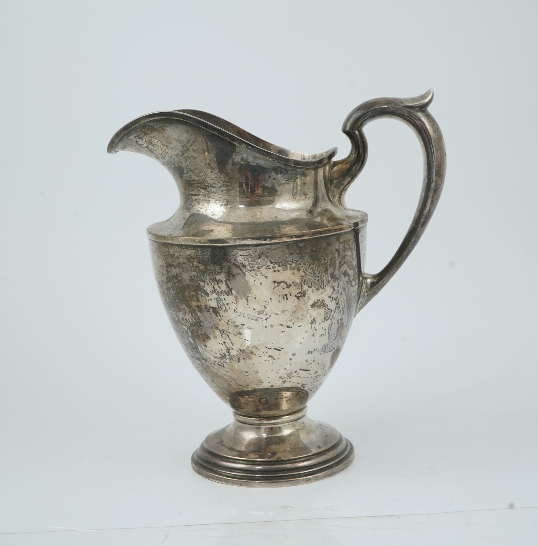 An early 20th century North American sterling silver large jug by Schofield & Co, of vase form with applied monogram, on circular foot, 25.5cm, 21.8oz.