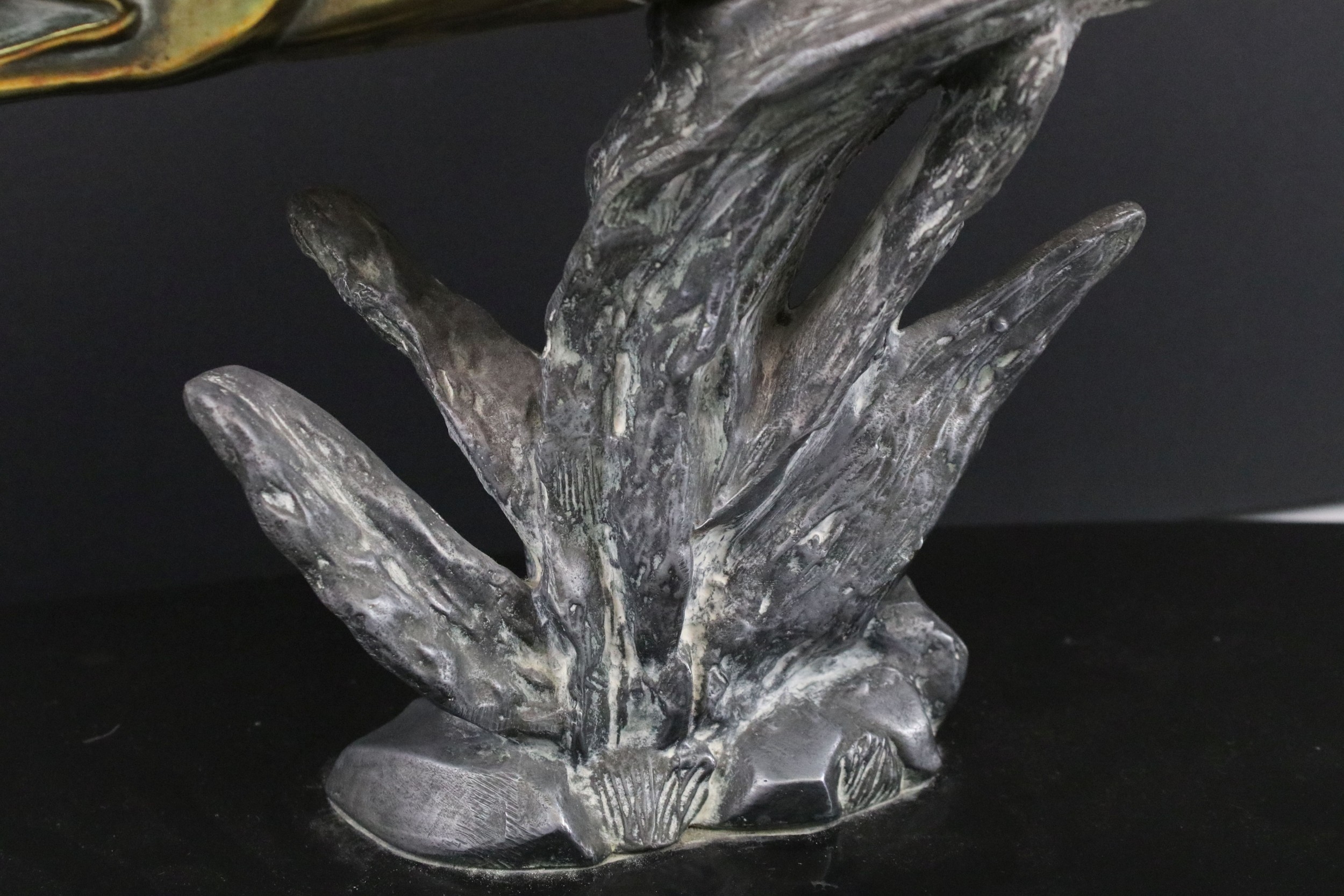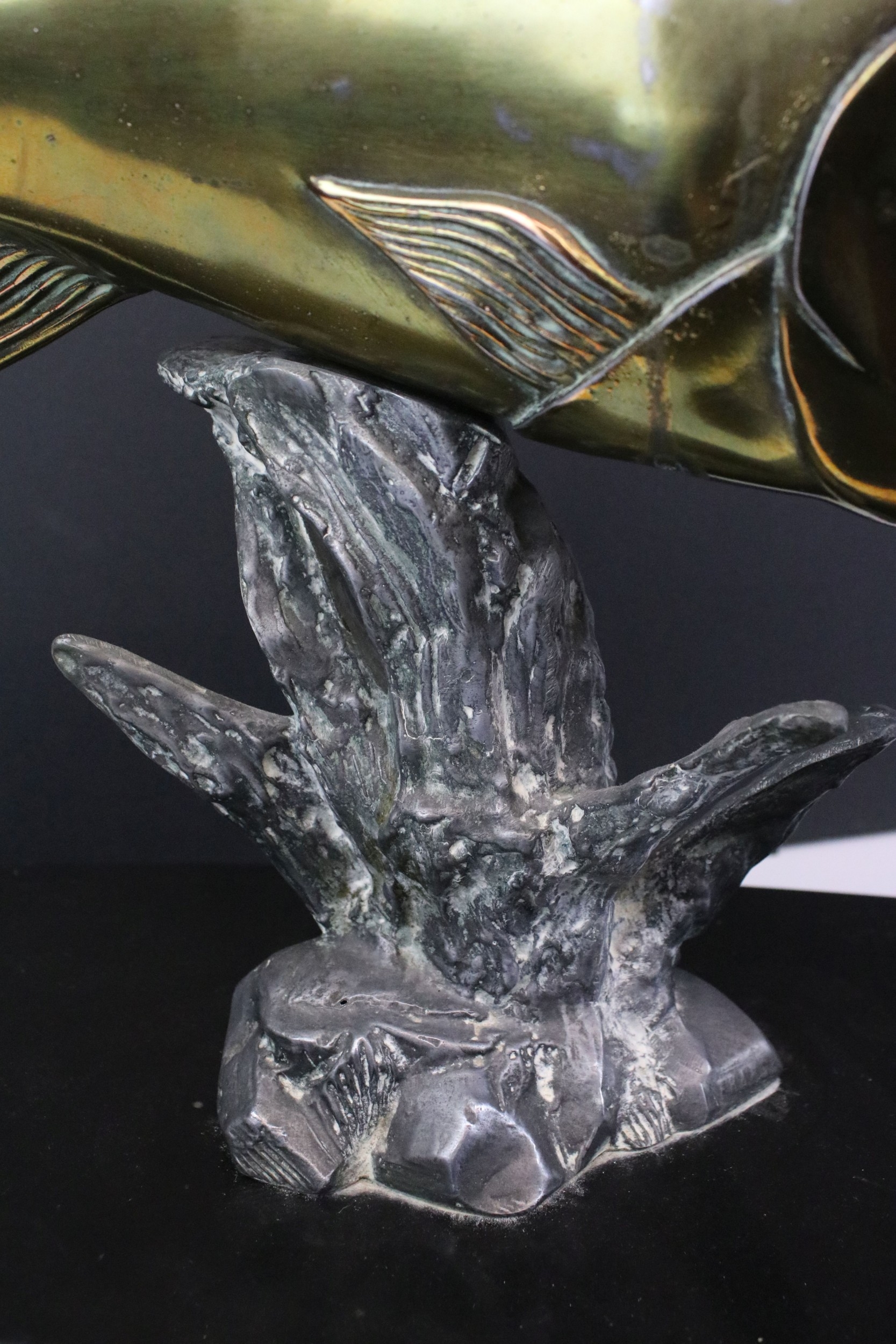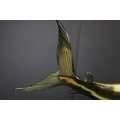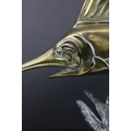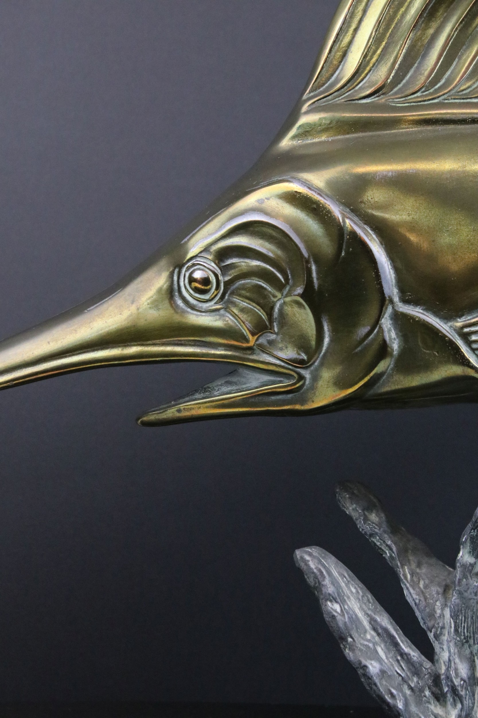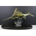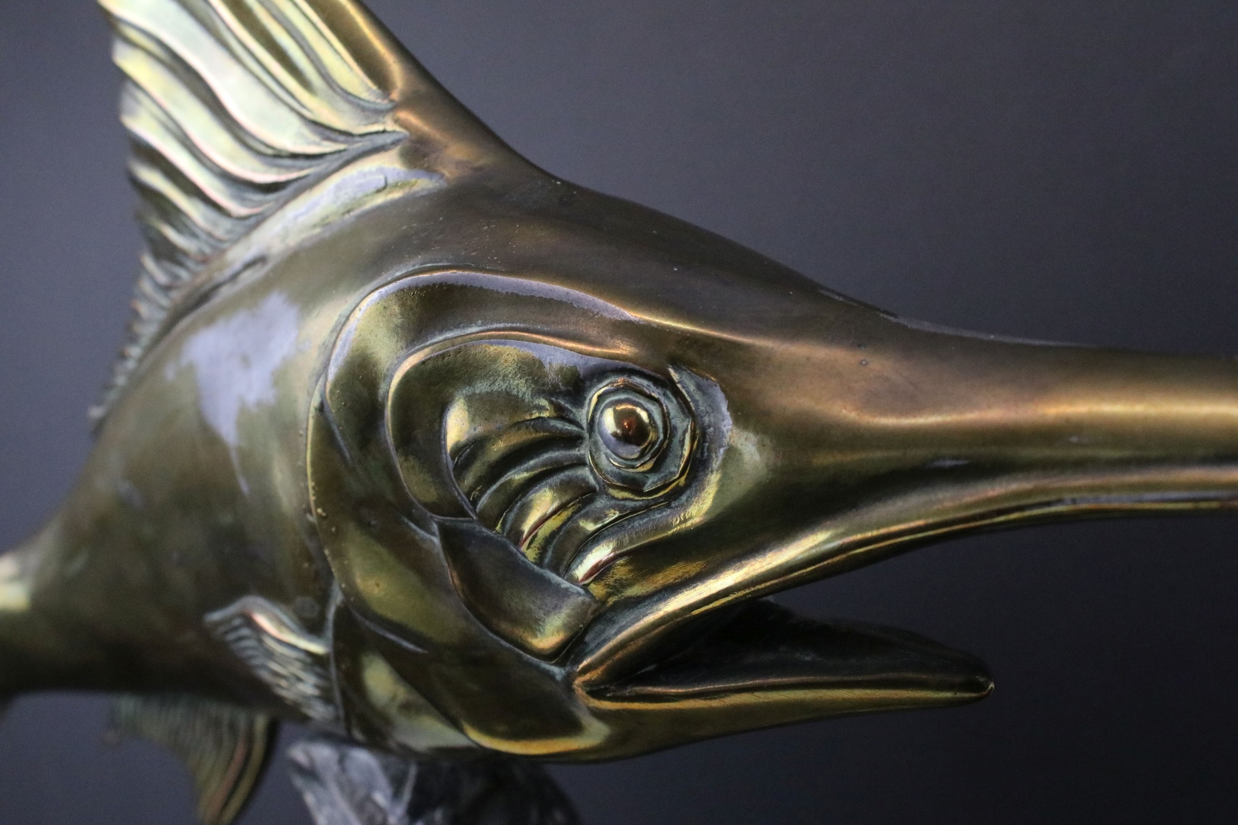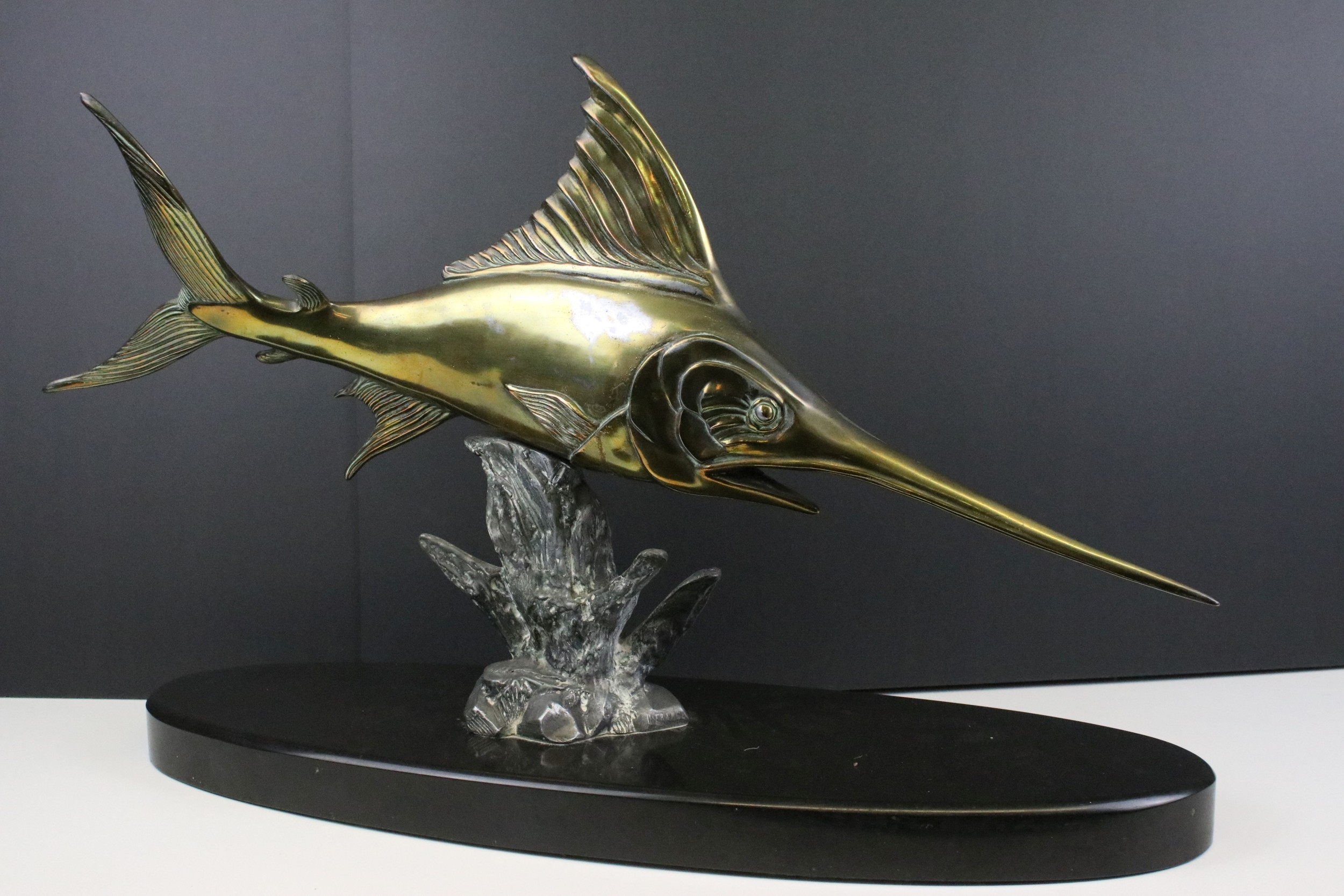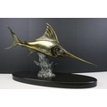 A large unusual brass sculpture in the form of a swordfish, mounted to heavy oval polished stone base, measures approx 68cm in length