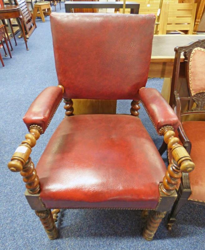 LATE 19TH CENTURY OAK OPEN ARMCHAIR ON TURNED SUPPORTS