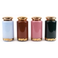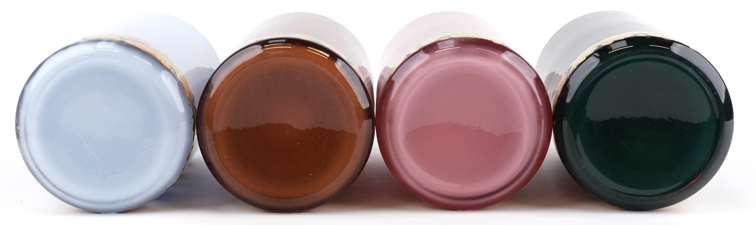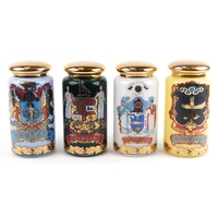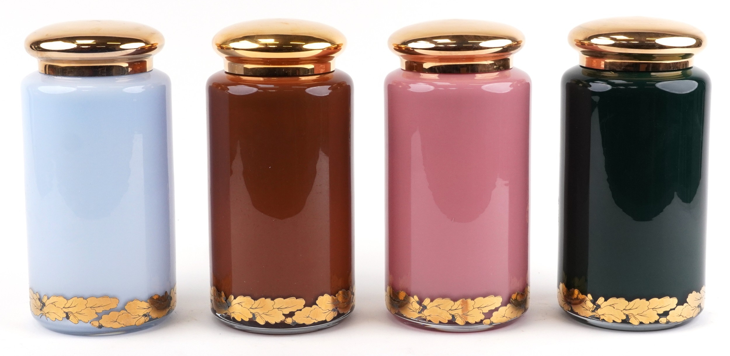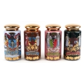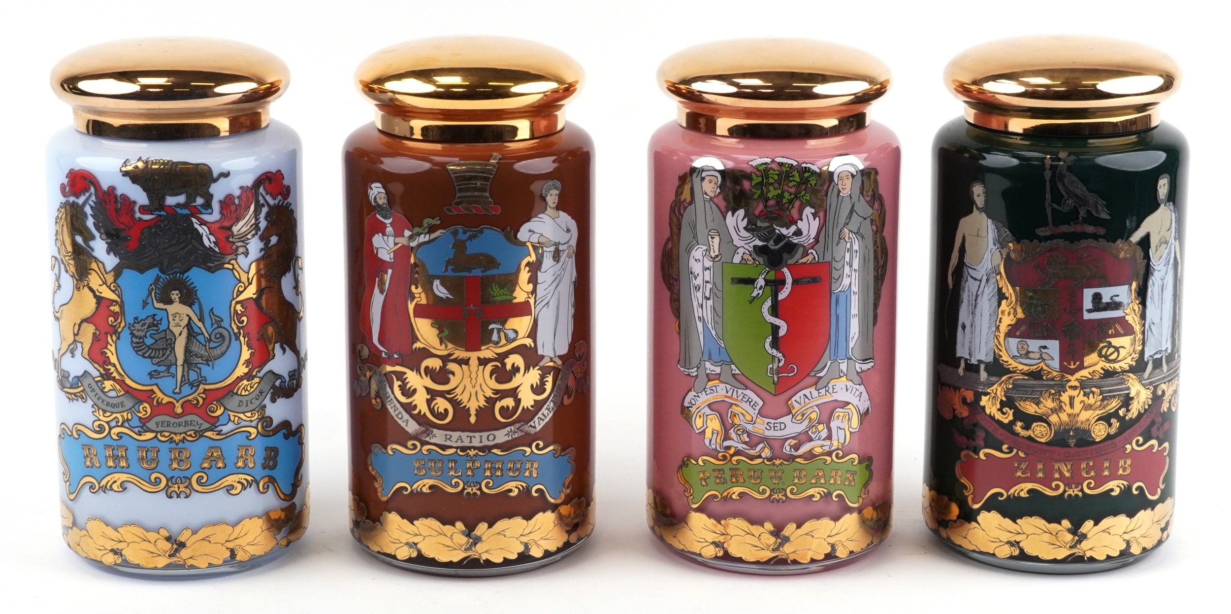 A set of four Royal Pharmaceutical Society enamelled and 22ct gold gilt glass apothecary/spice jars, designed by S Wheaton, manufactured by Carlisle Collections to commemorate the 150th anniversary of the society comprising Sulphur, Peruv Bark, Zincib and Rhubarb, 33cm high.