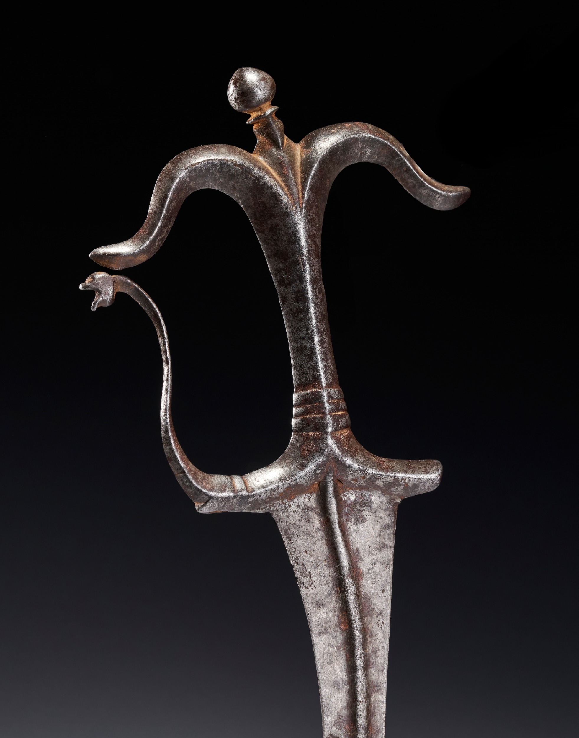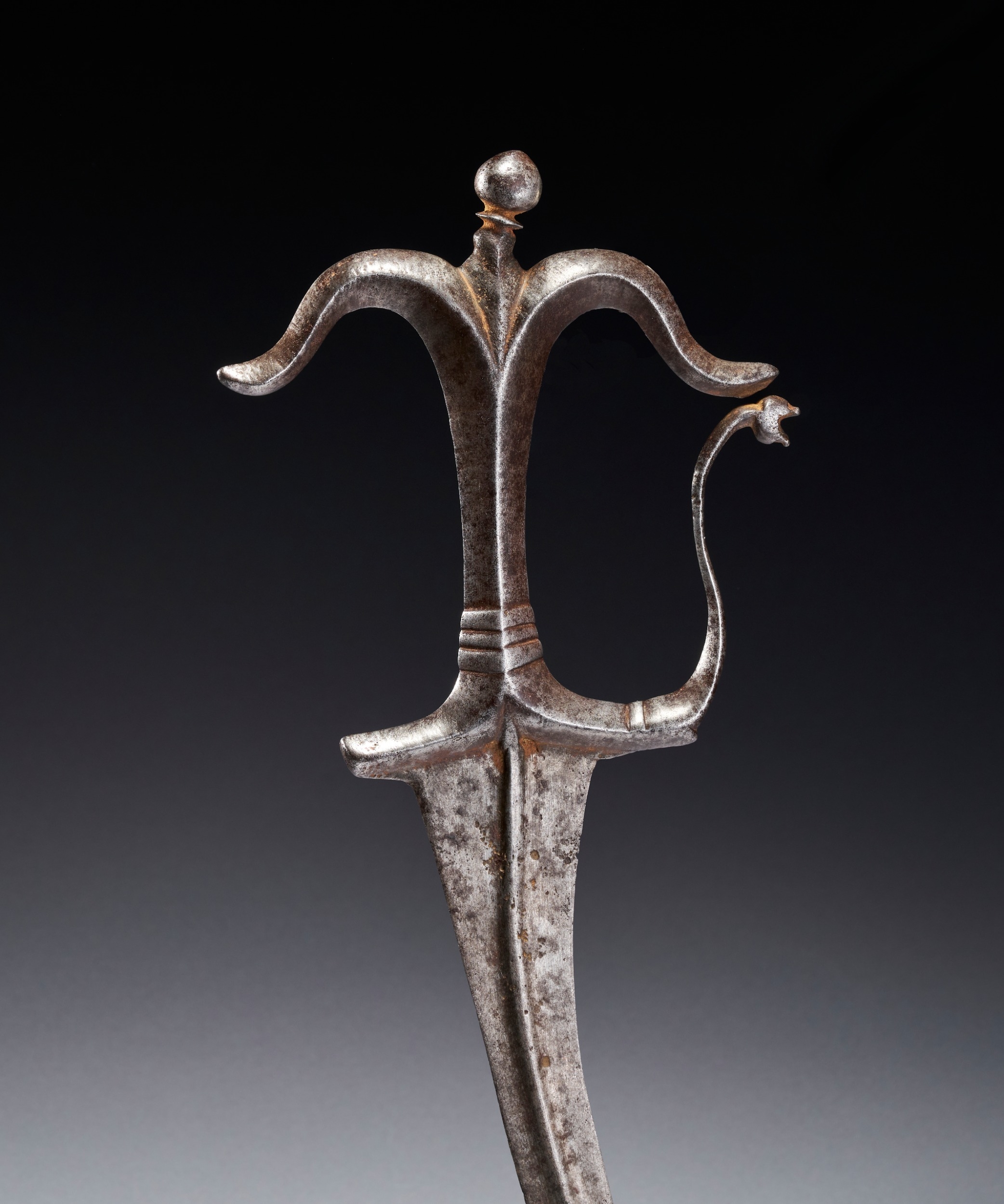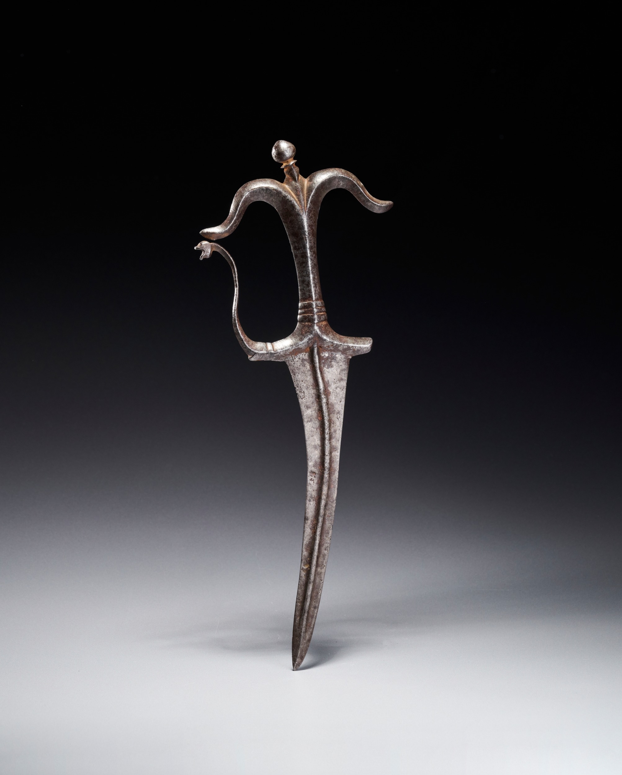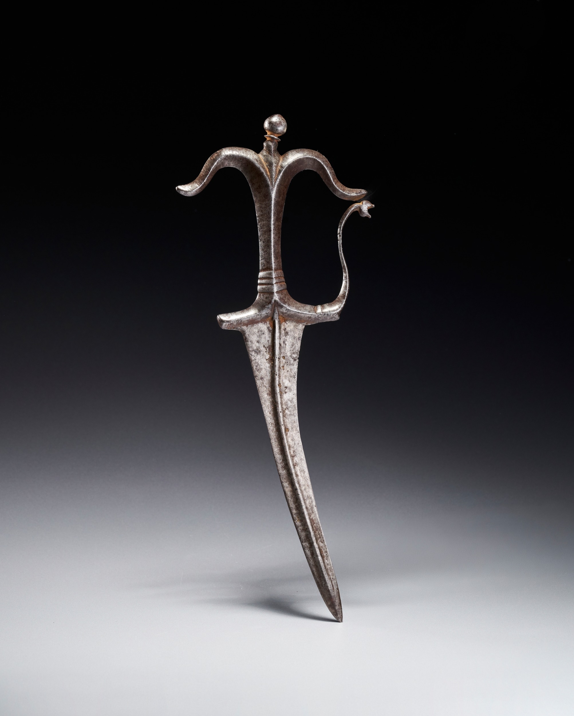 This Indian Chilanum dagger is attributed to the Deccan or Southern region, dating to approximately the 16th to 17th century. The blade is curved and double-edged, featuring a prominent, raised central longitudinal rib that runs from the base to the tip. The all-metal hilt follows the classic Chilanum form, characterized by a bifurcated pommel topped with a small, spherical finial. The crossguard is similarly bifurcated and recurved. A slender, curved knuckle guard extends from the forward quillon and terminates in a stylized zoomorphic head, likely representing a makara. The grip is waisted and features simple molded bands.
