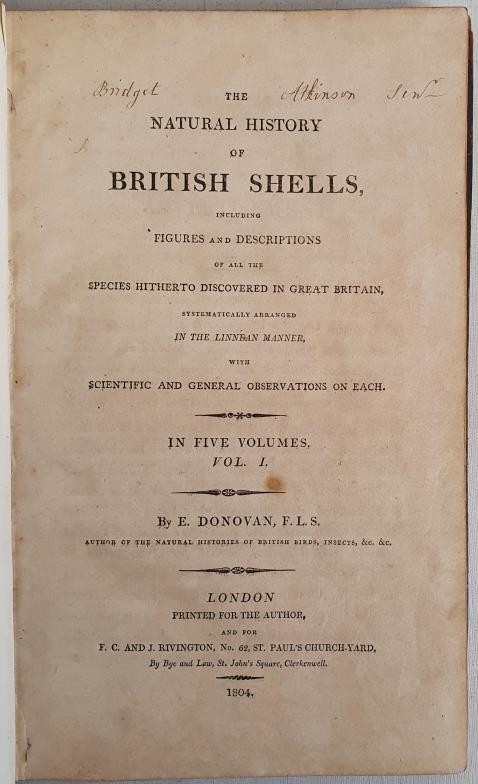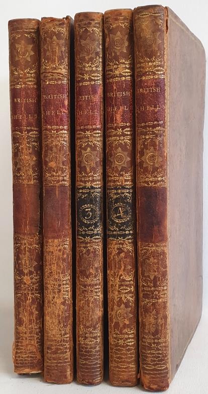Edward Donovan. The Natural History of British Shells 1800/1804. 5 volumes. First editions Complete with 180 hand coloured plates. Judged the finest work ever published relating to British shells. Edward Donovan was born in Cork (Edward 0'Donovan) and dropped the O from his surname when he moved to London aged 21. He was also renowned for his works on British Birds. Contemporary calf. Rare